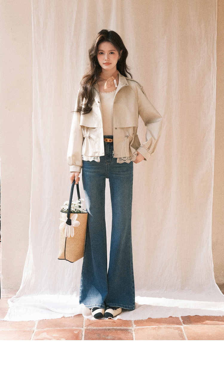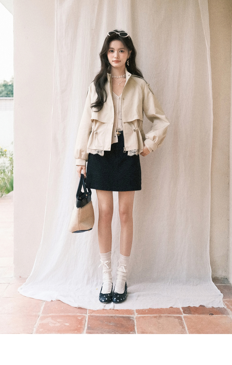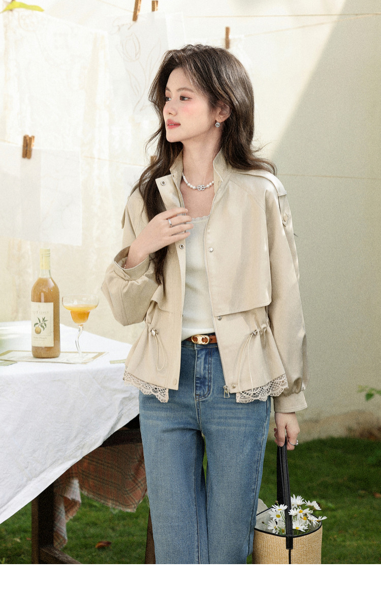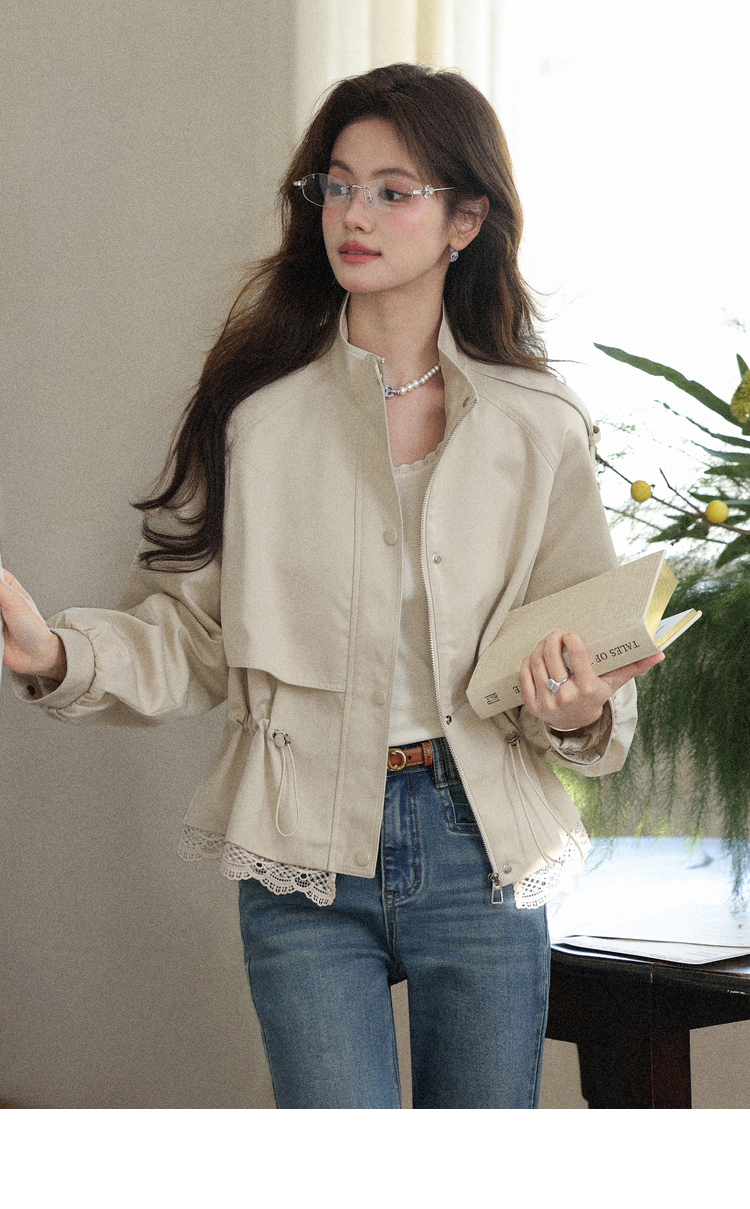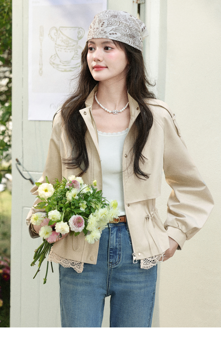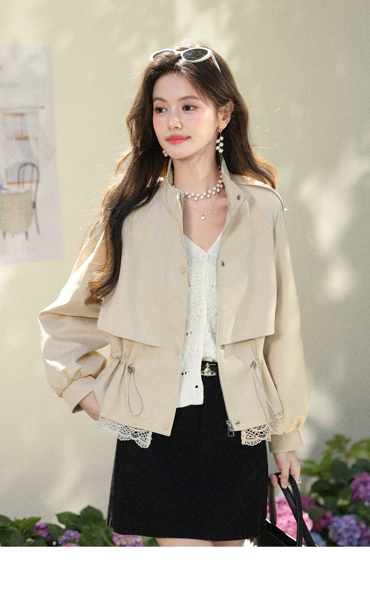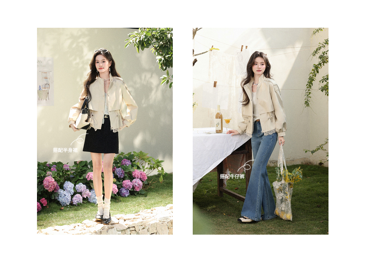 鹿向南「千里寻花」米色蕾丝拼接长袖短款风衣女春季收腰法式外套