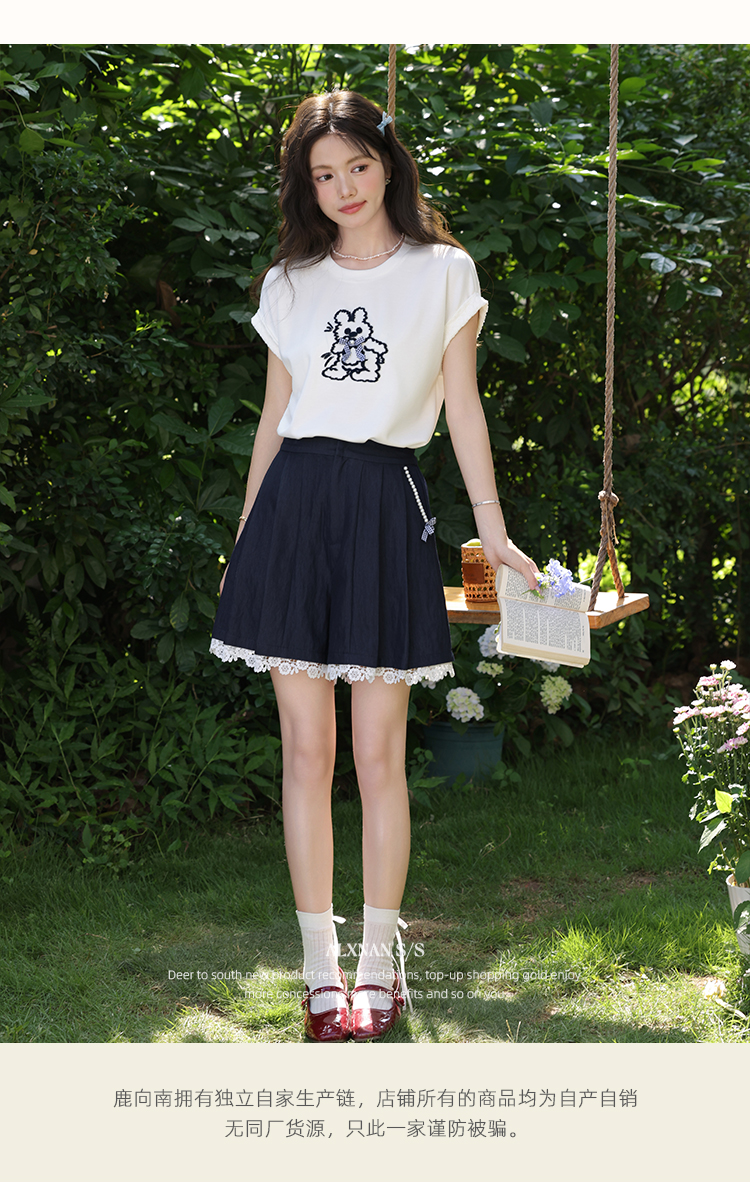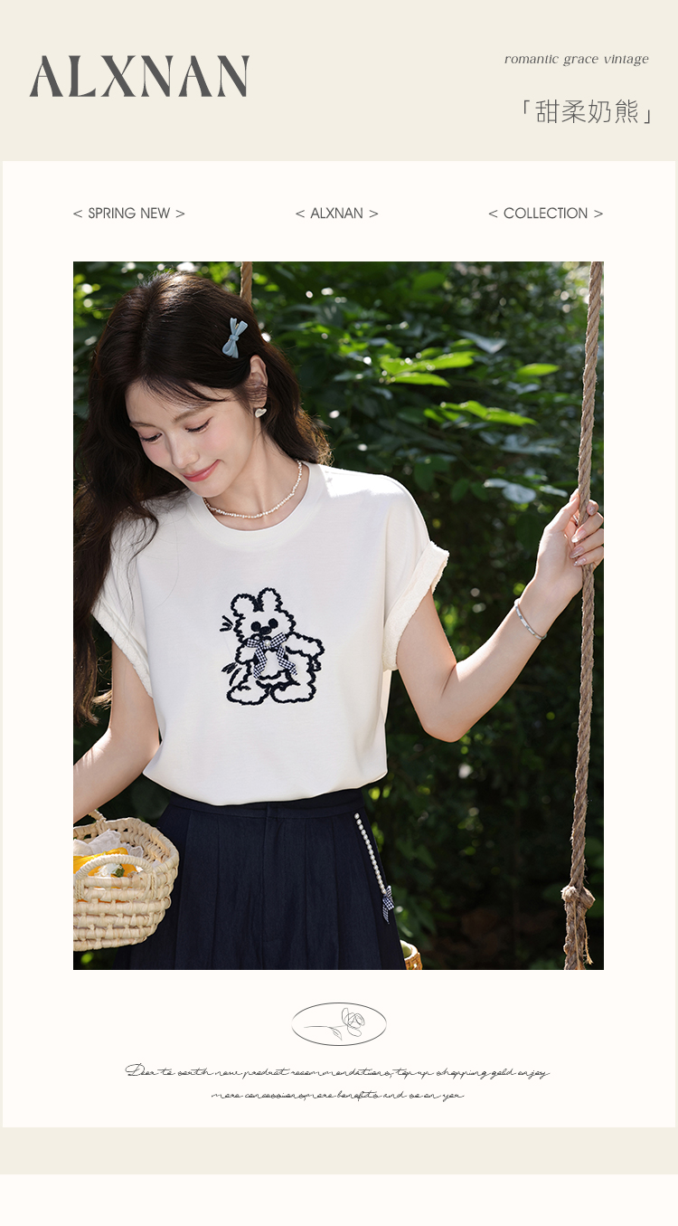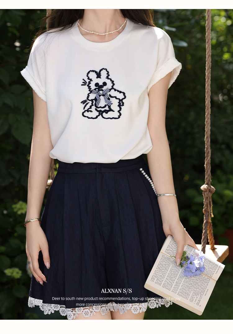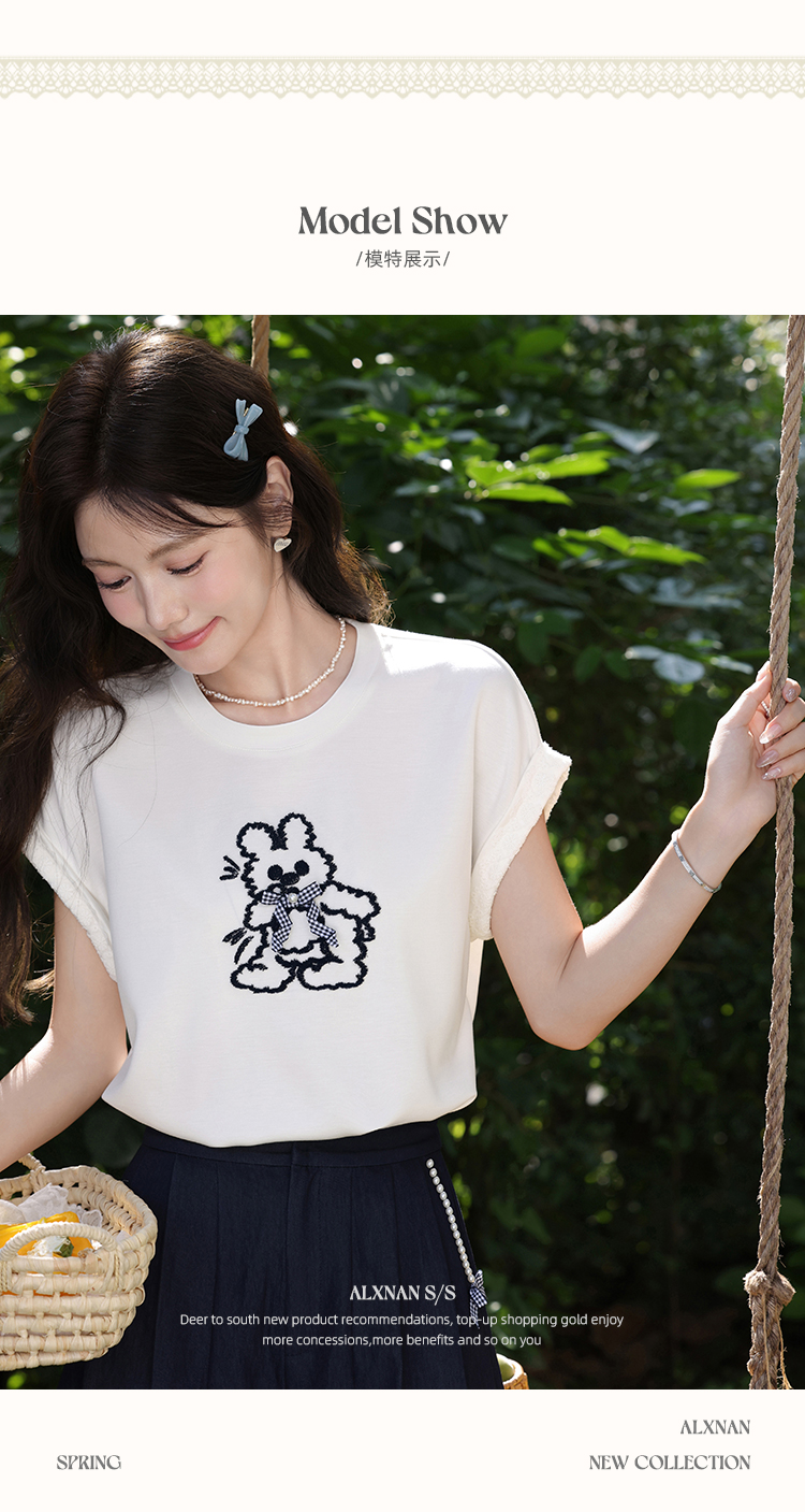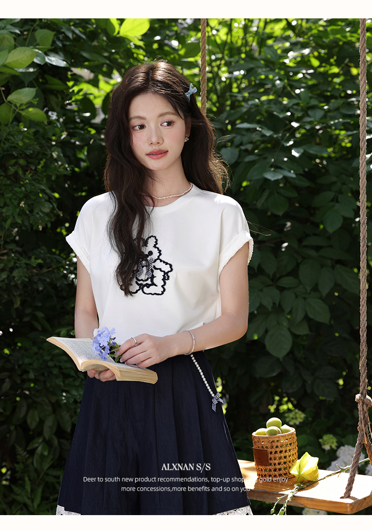 鹿向南「甜柔奶熊」白色通勤时尚女t恤夏季小众宽松正肩短袖上衣L557129
