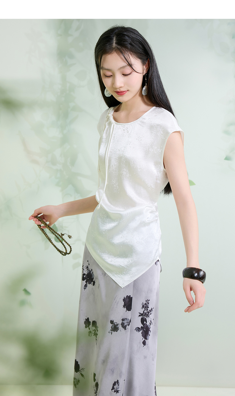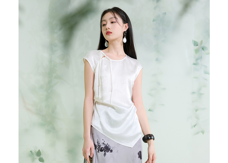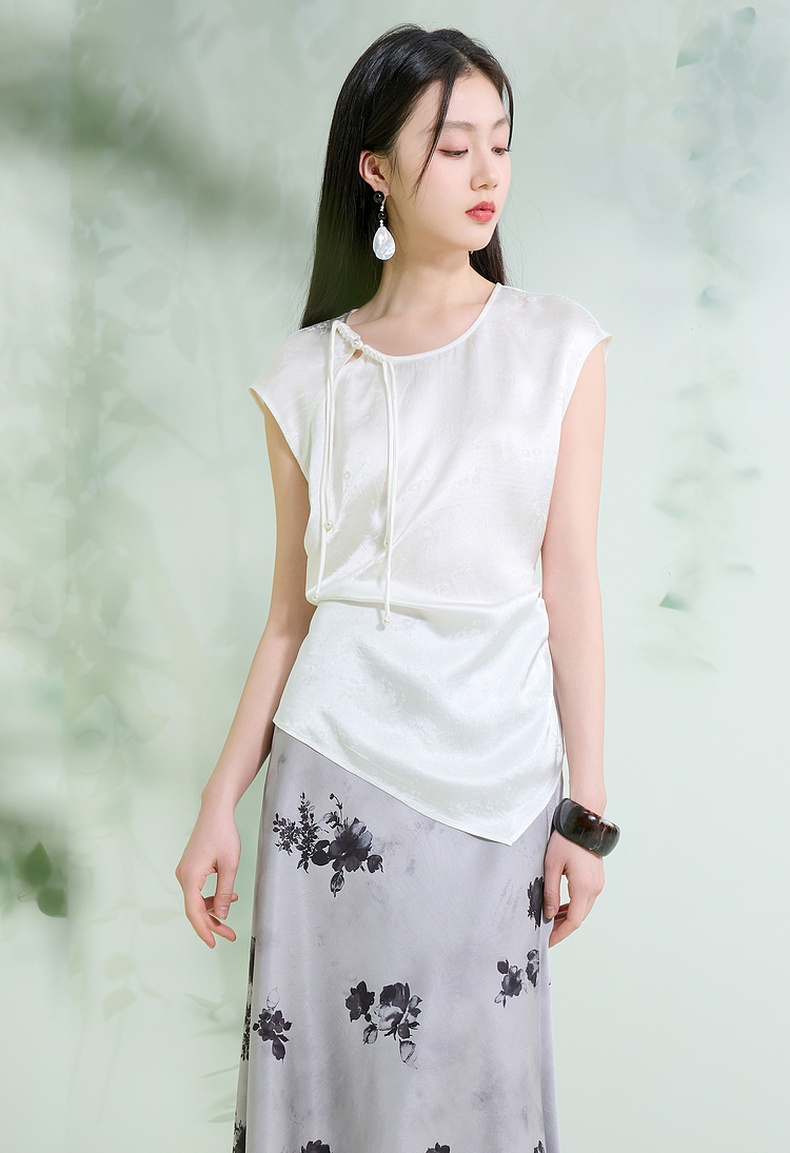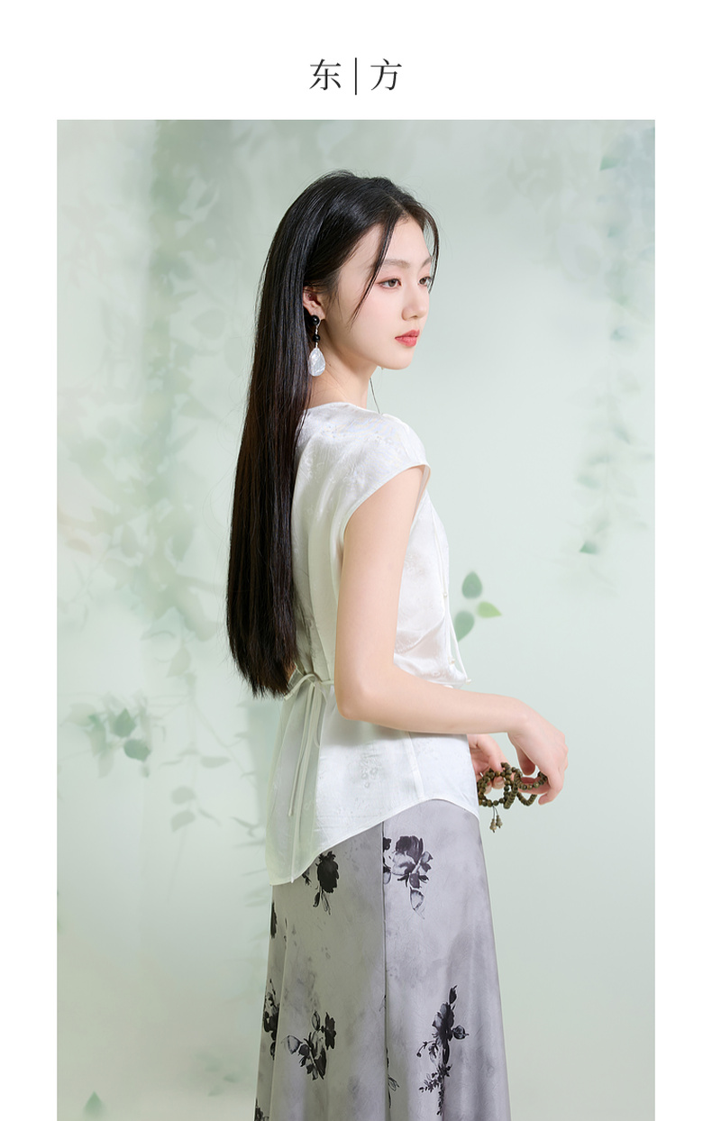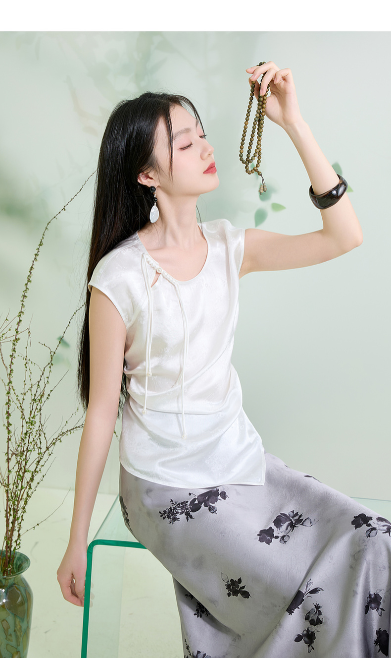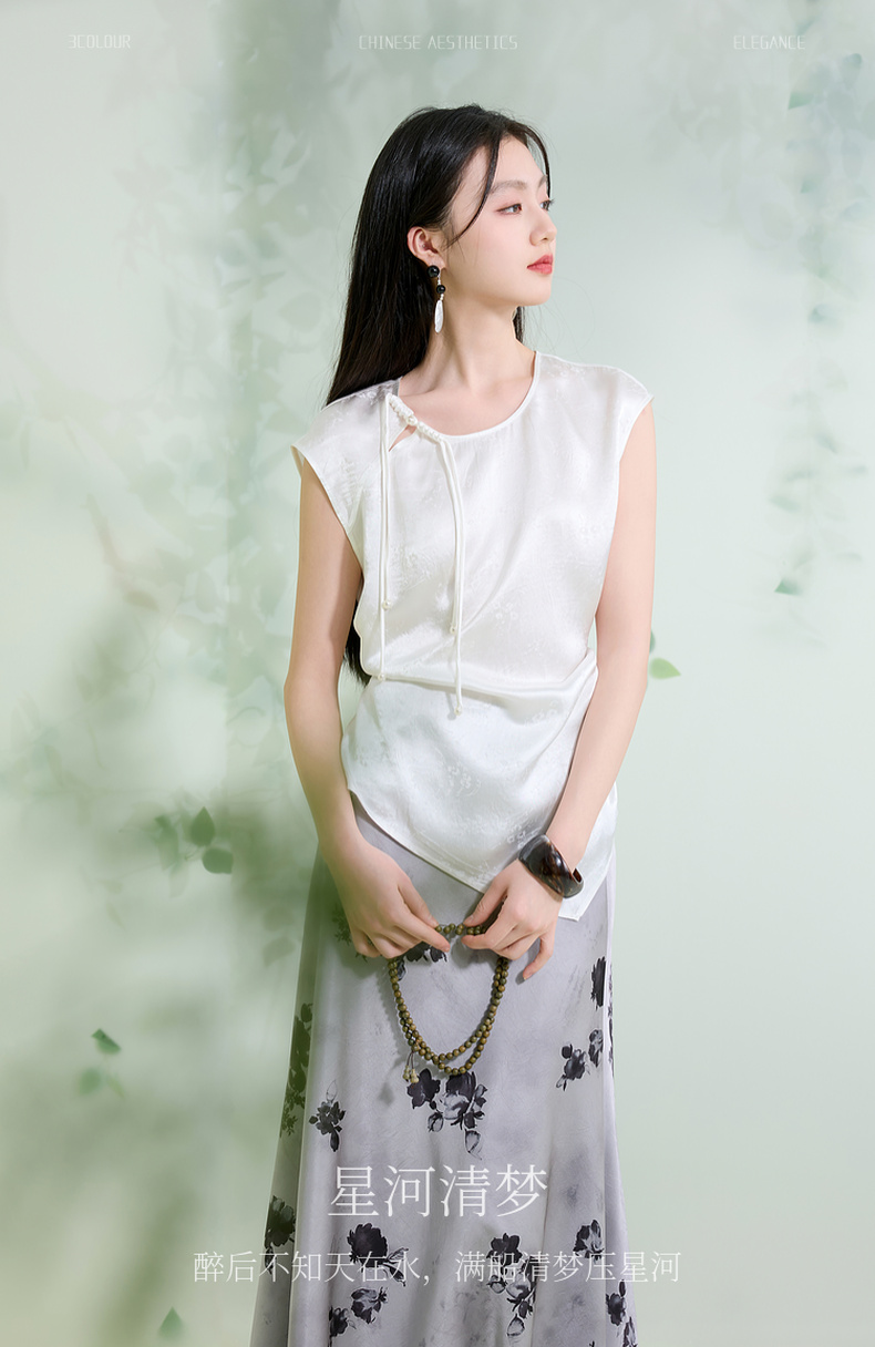 三彩【星河清梦】2025夏季新款新中式醋酸衬衫不规则盘扣小衫C