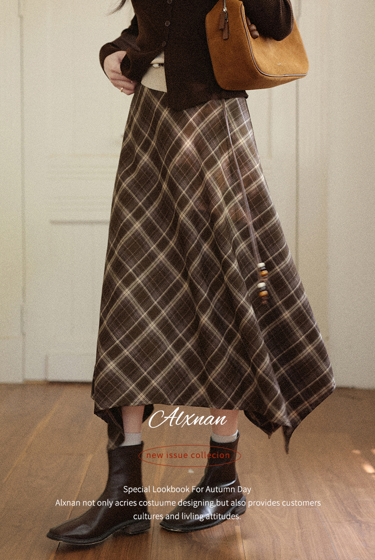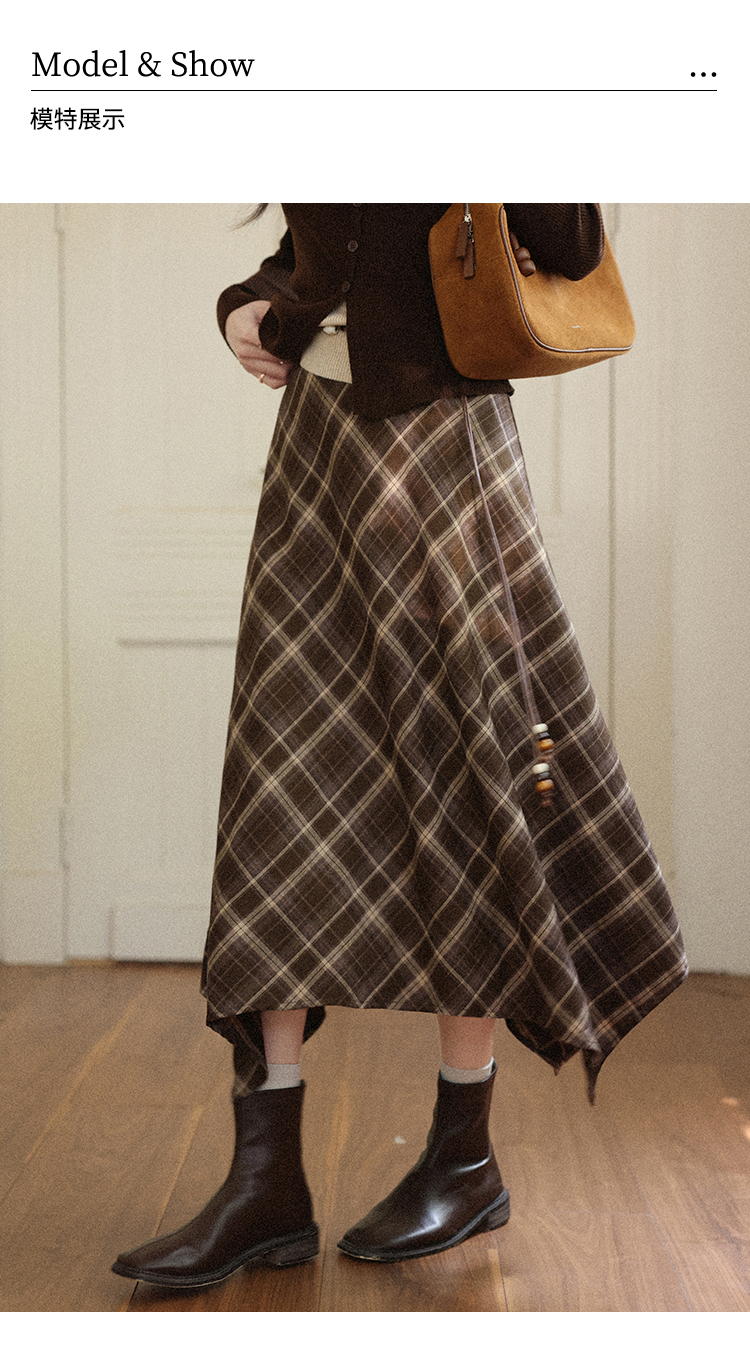 鹿向南「热娜花漫」不规则咖色格纹半身裙女初秋宽松显瘦A字长裙