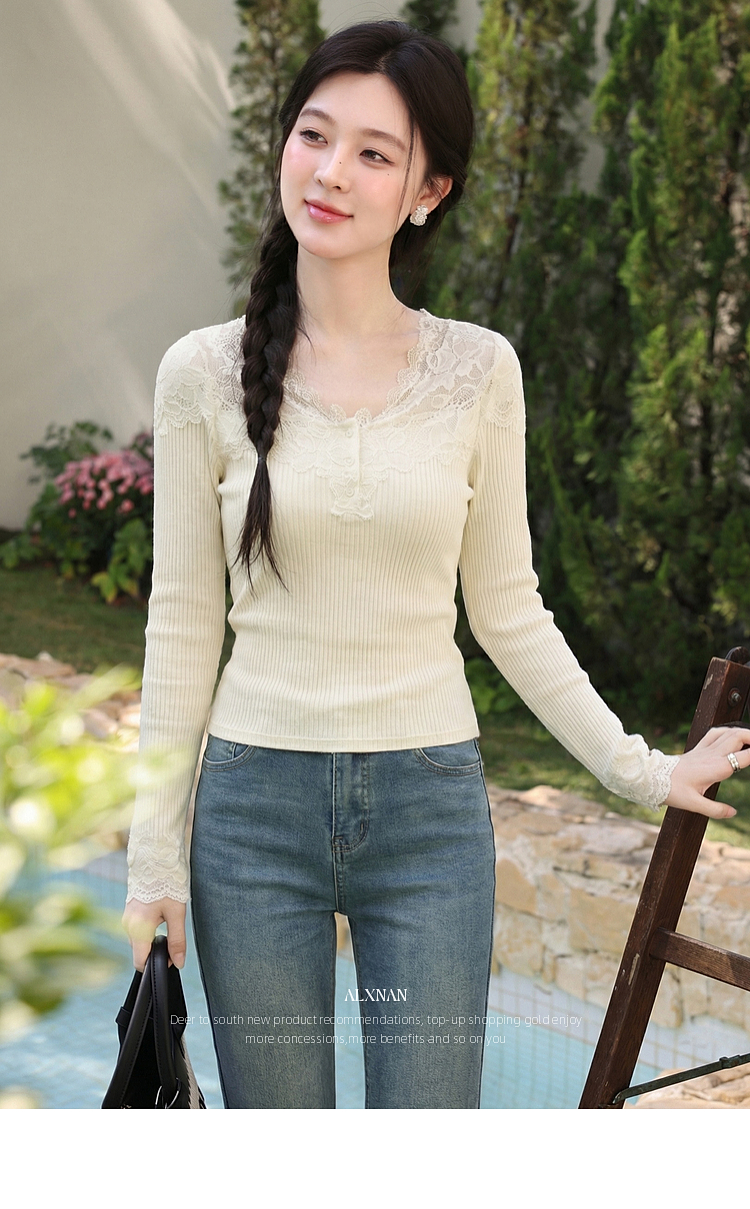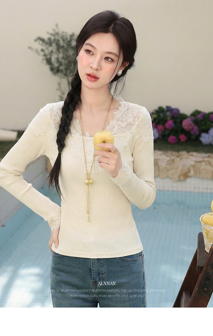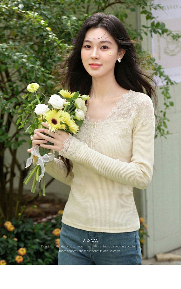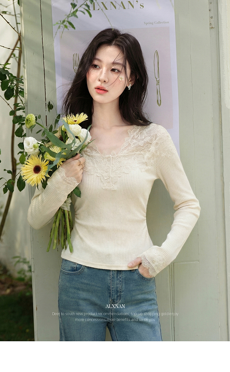 鹿向南「温柔花漾」杏色长袖T恤春季新款时尚短款收腰内搭上衣女