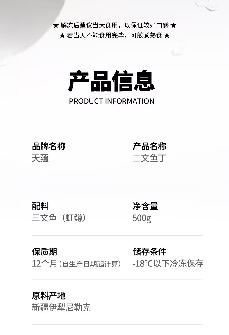 【营养鲜食】天蕴 新疆三文鱼鱼肉丁 500g/包 去皮去刺鱼肉丁【0315晚直播】
