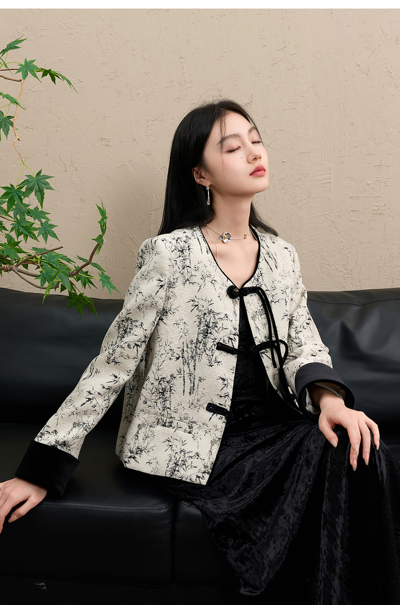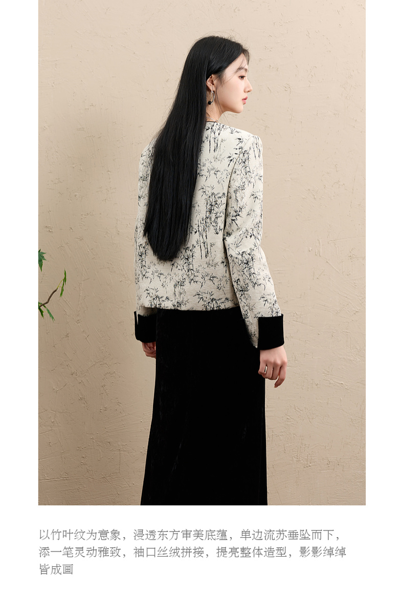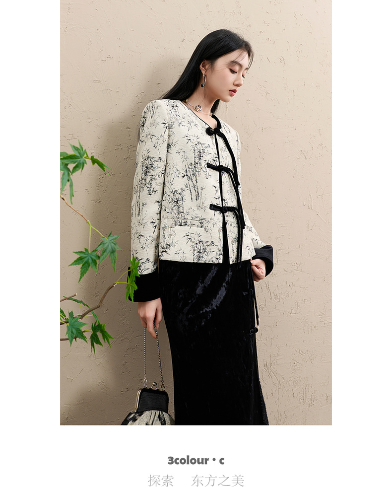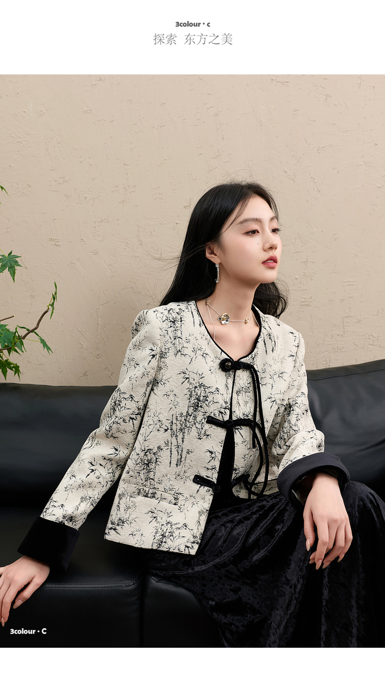 【社群秒杀】三彩【竹摇清影】2025冬季新款蓄热保暖棉外套提花圆领盘扣开衫C