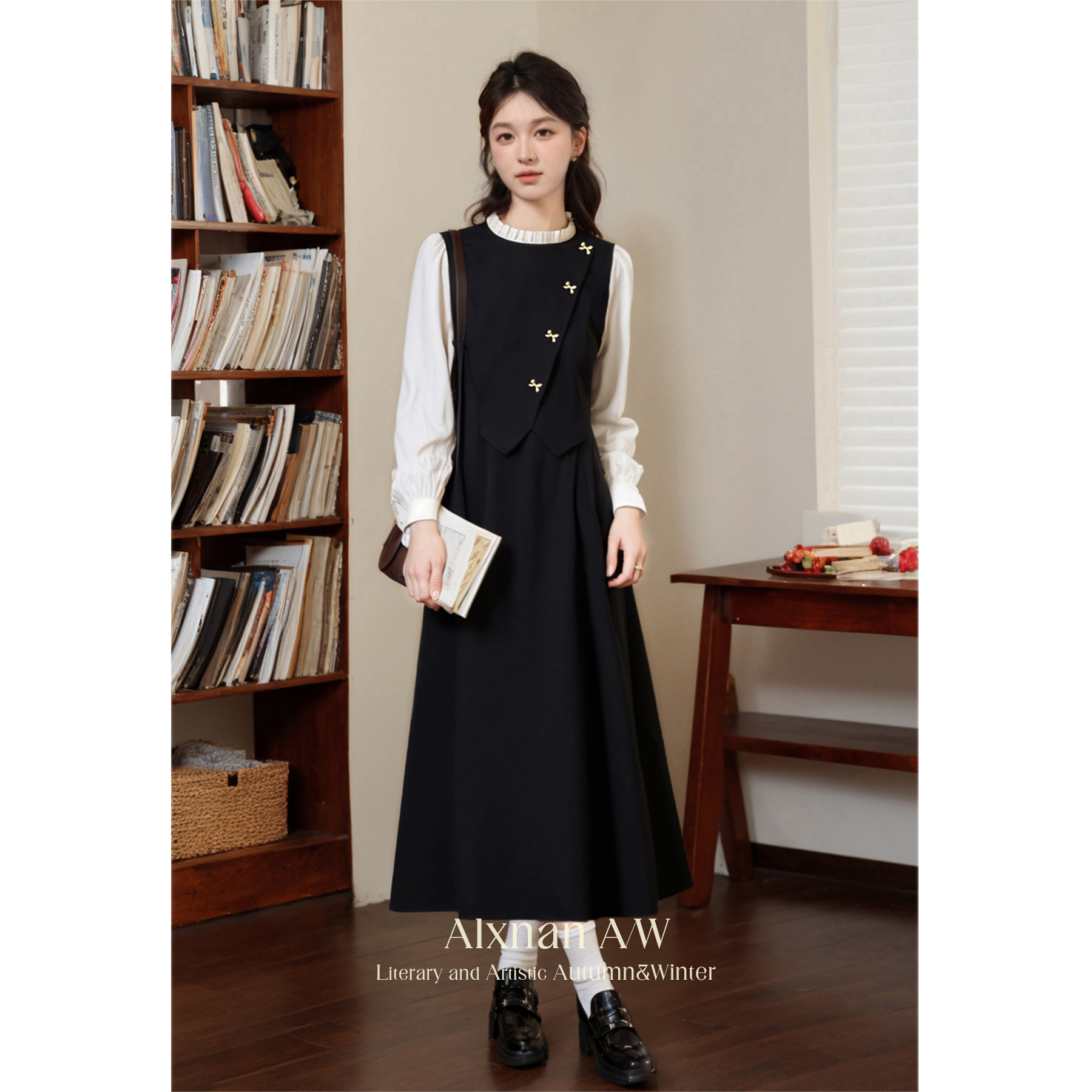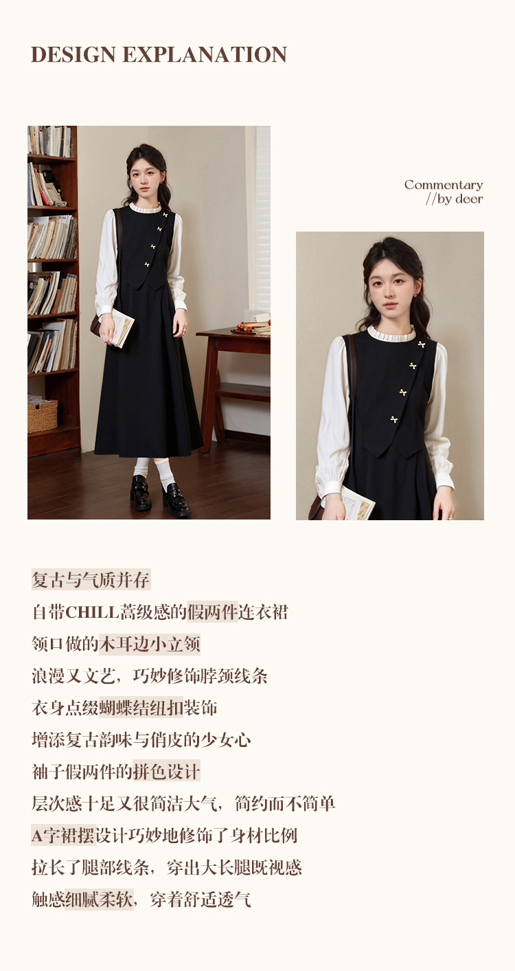 鹿向南「秋落书房」假两件连衣裙女装秋季2024新款设计感显瘦裙子A00602