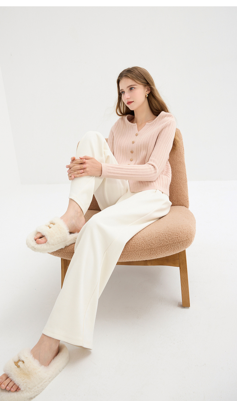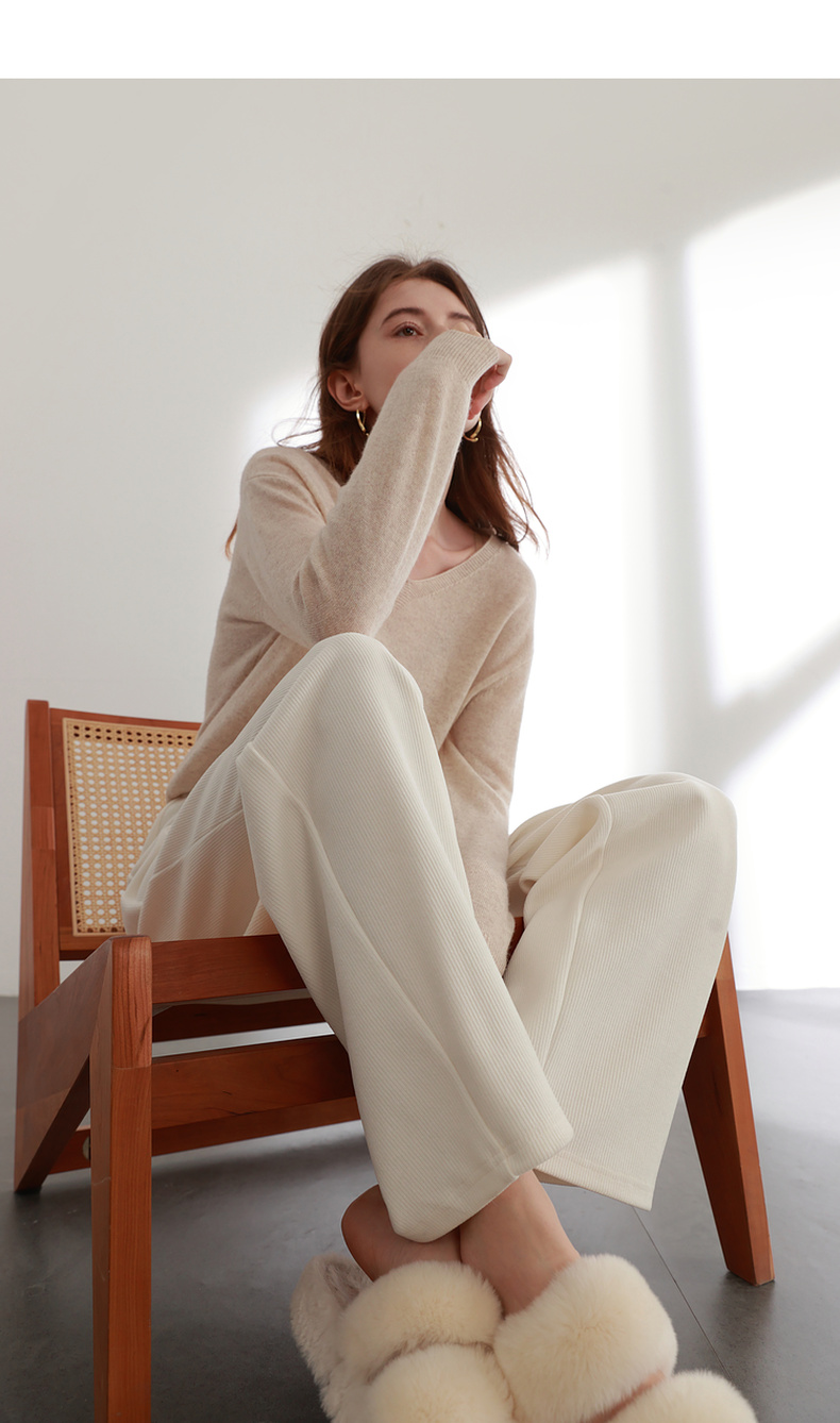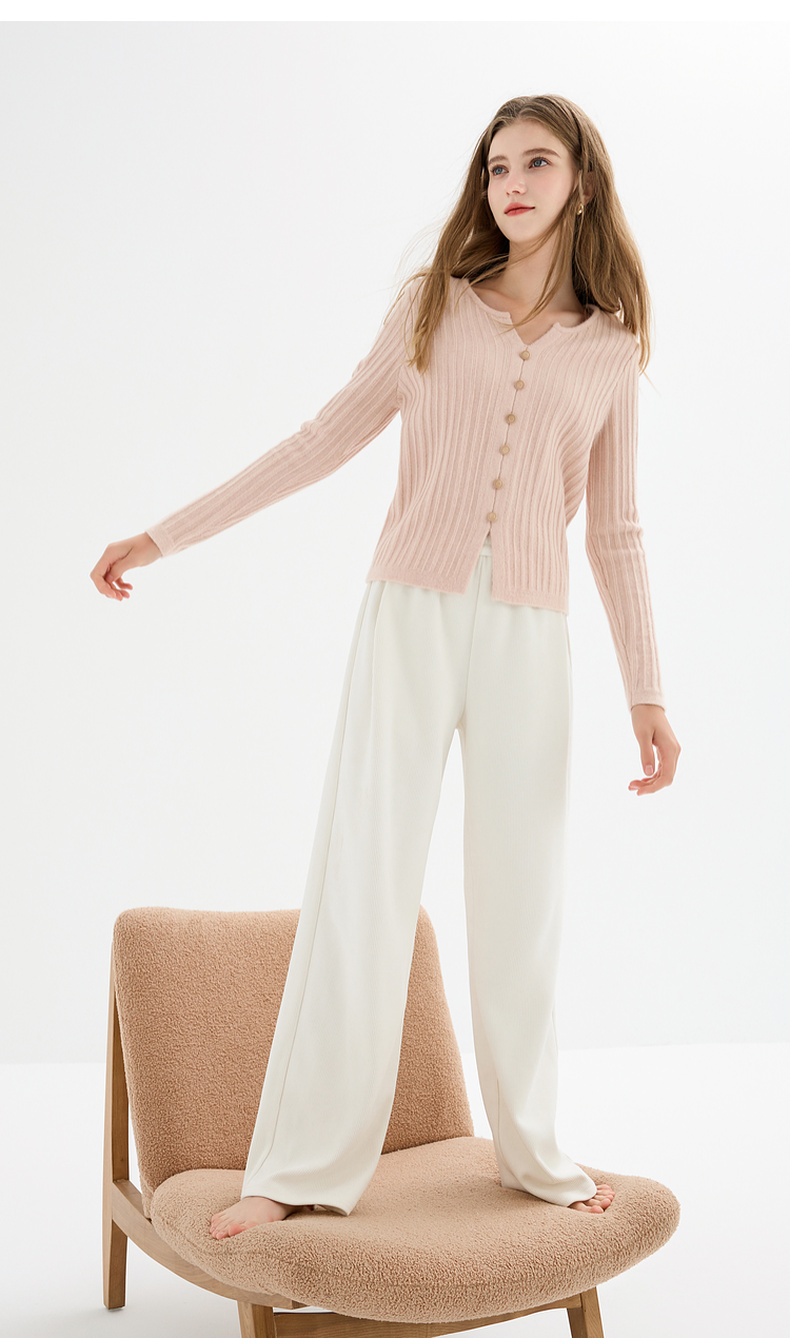 三彩2026春季新款雪尼尔休闲长裤高腰松紧直筒阔腿裤宽松简约M