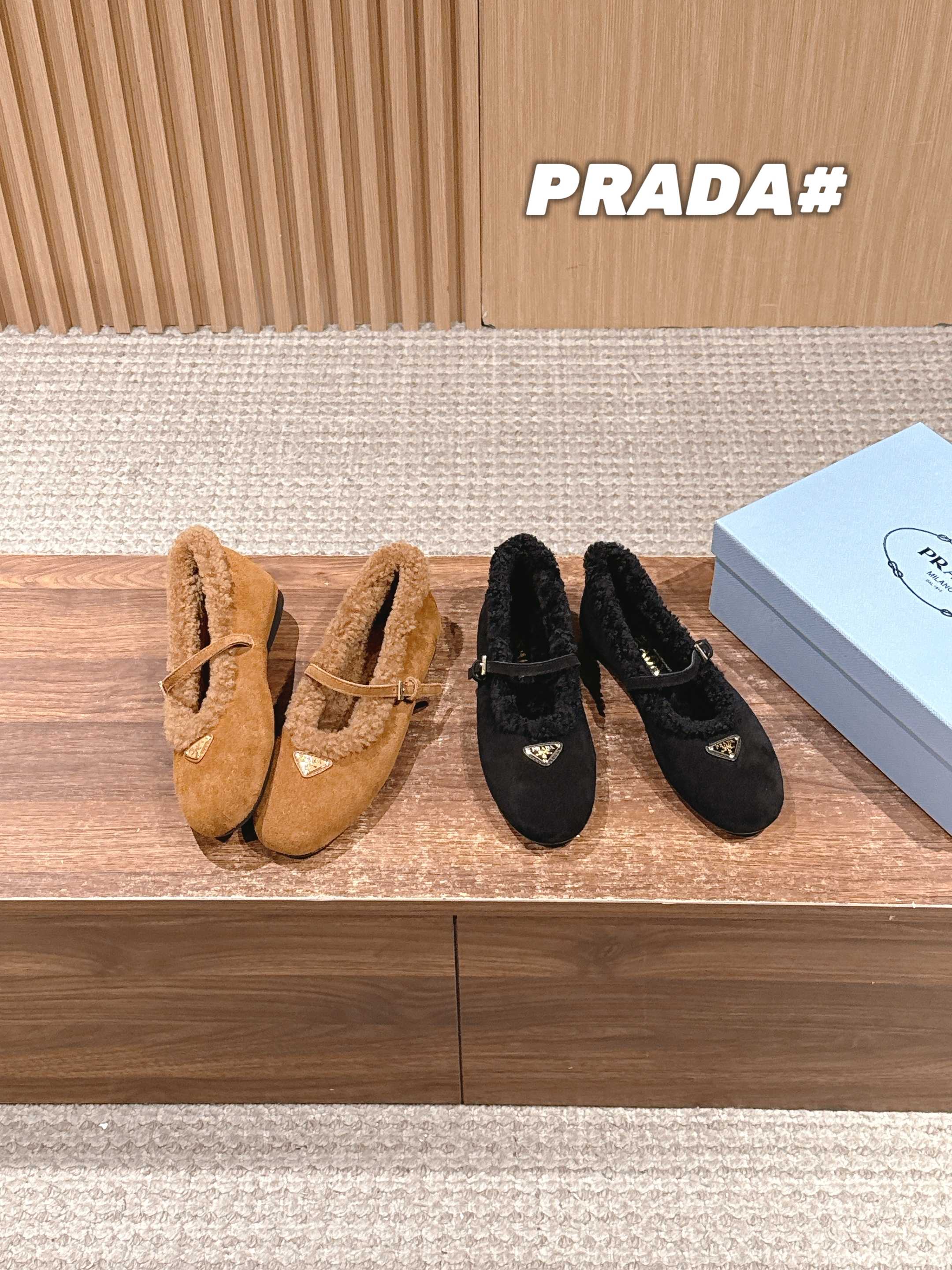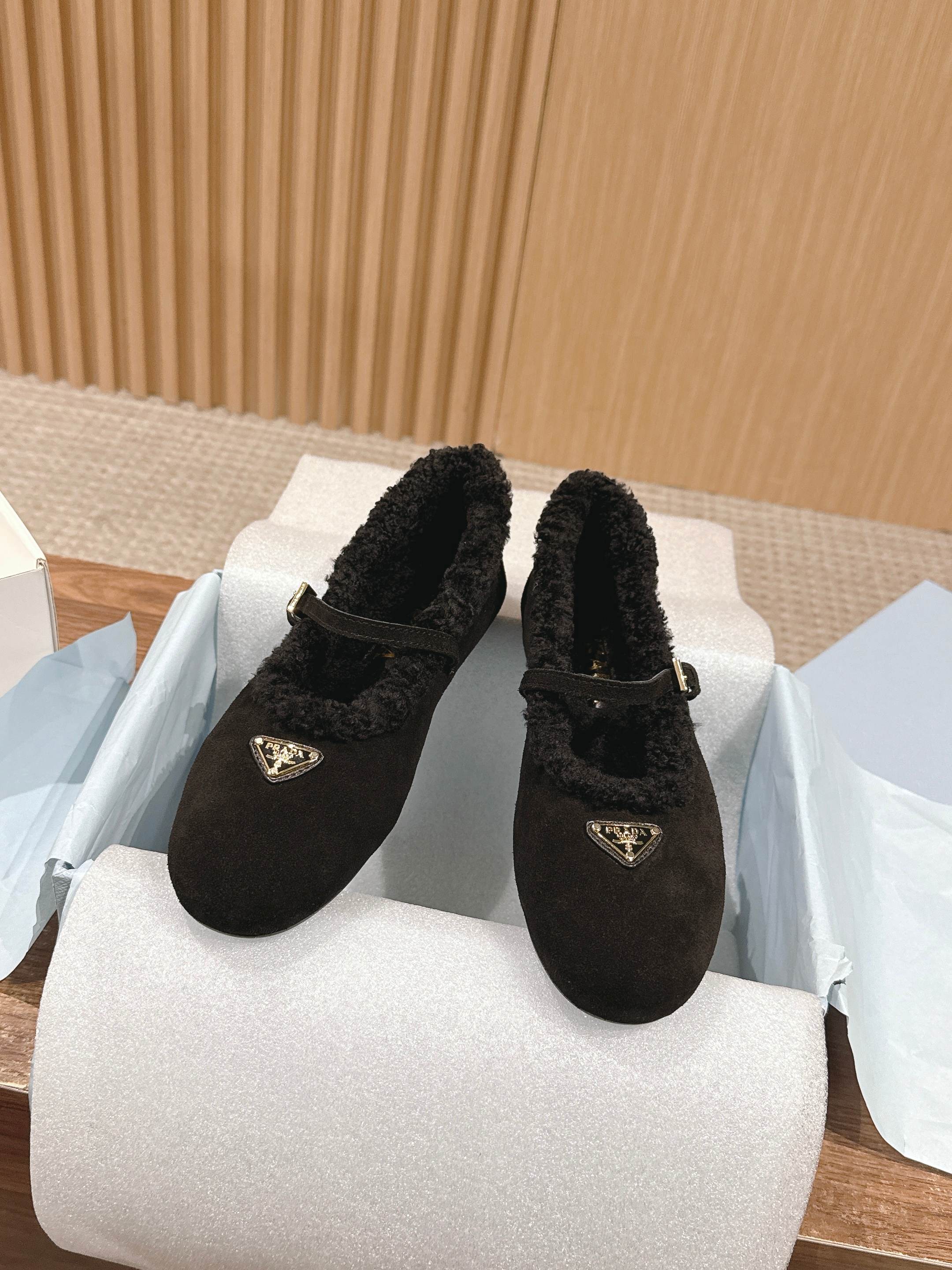 PRADA 普拉达秋冬新款毛毛鞋玛丽珍平底鞋 简约舒适又百搭 麂皮材质 羊羔毛内里 Size:35-39(40/41定制不退换)
