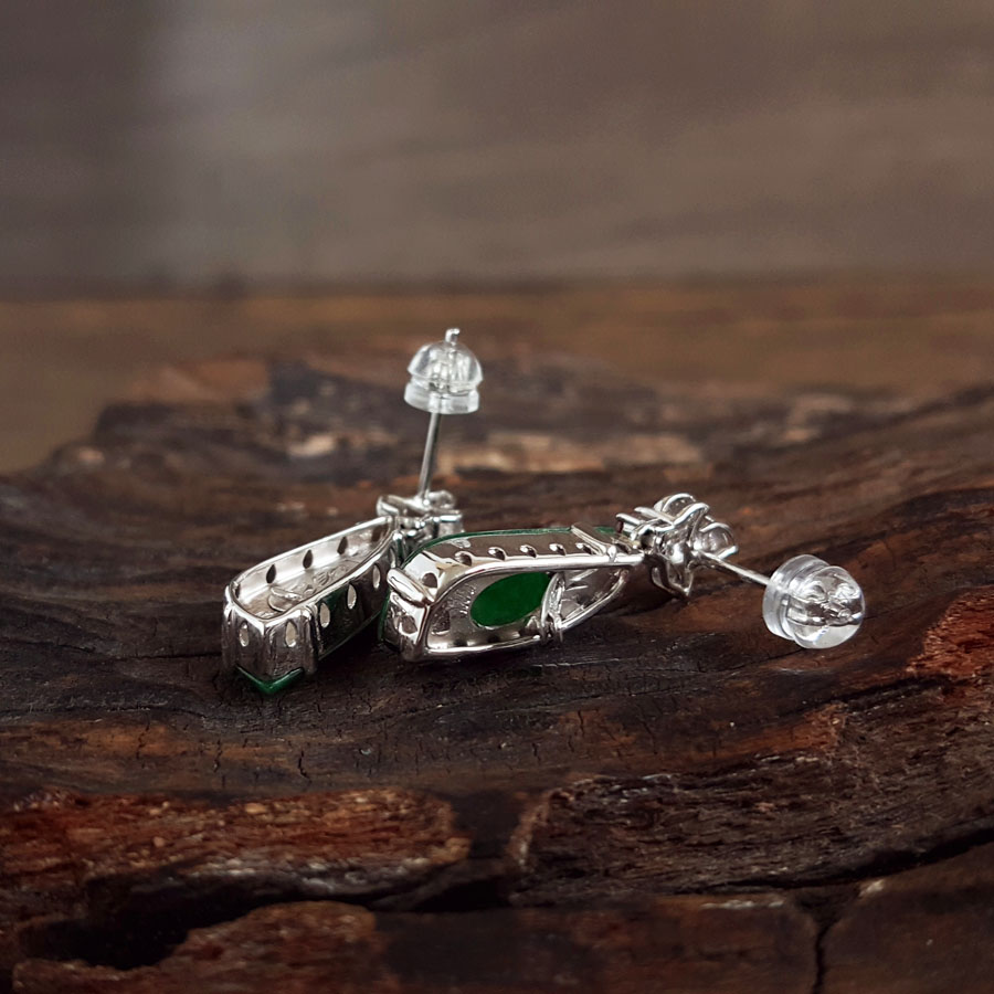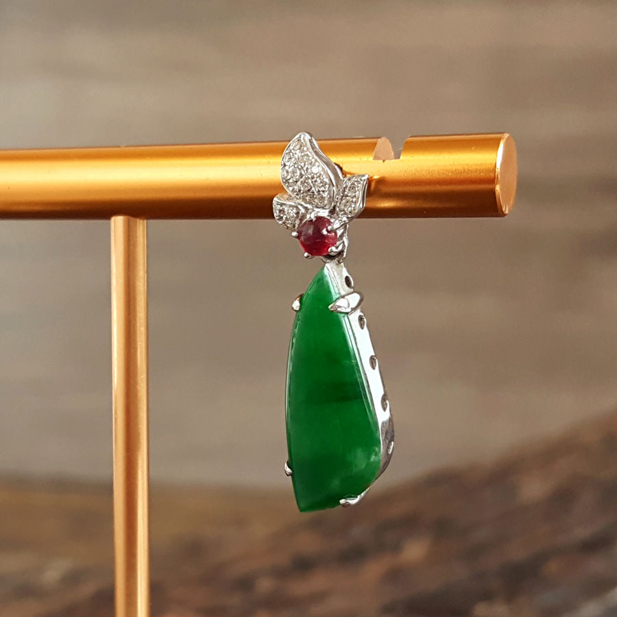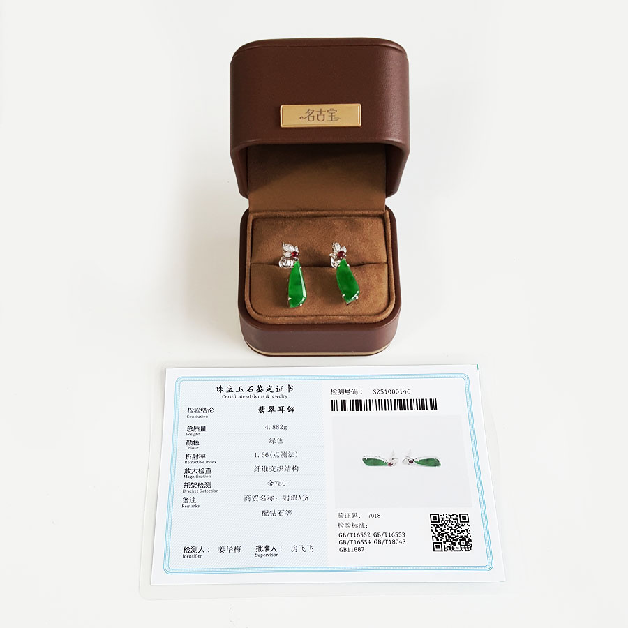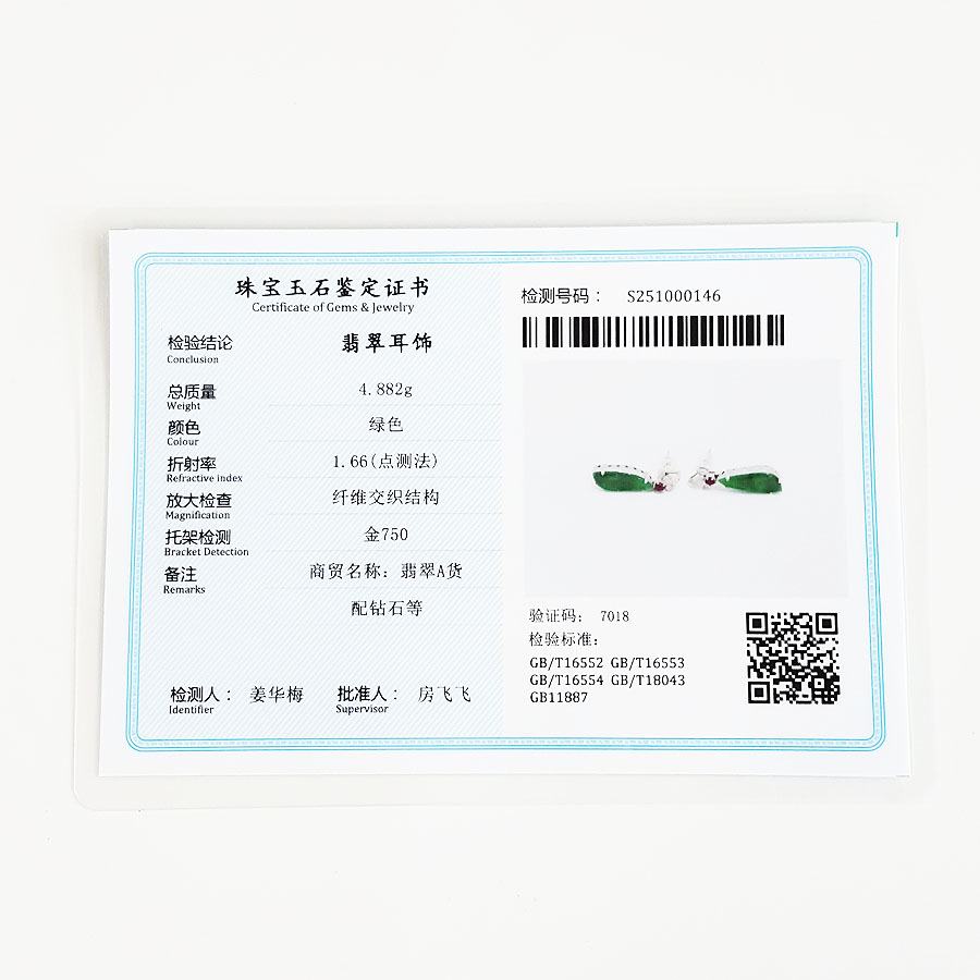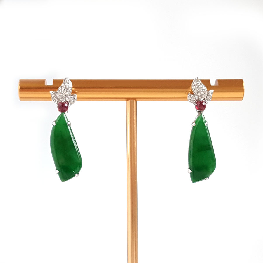 名称 | AU750收藏级白金镶钻镶天然细腻满绿冰种柳叶造型(金枝玉叶)翡翠耳坠 |