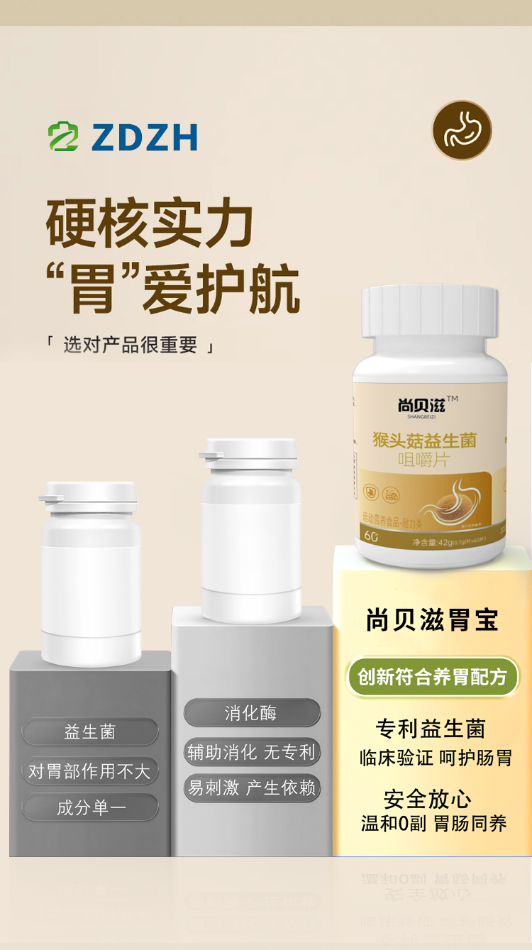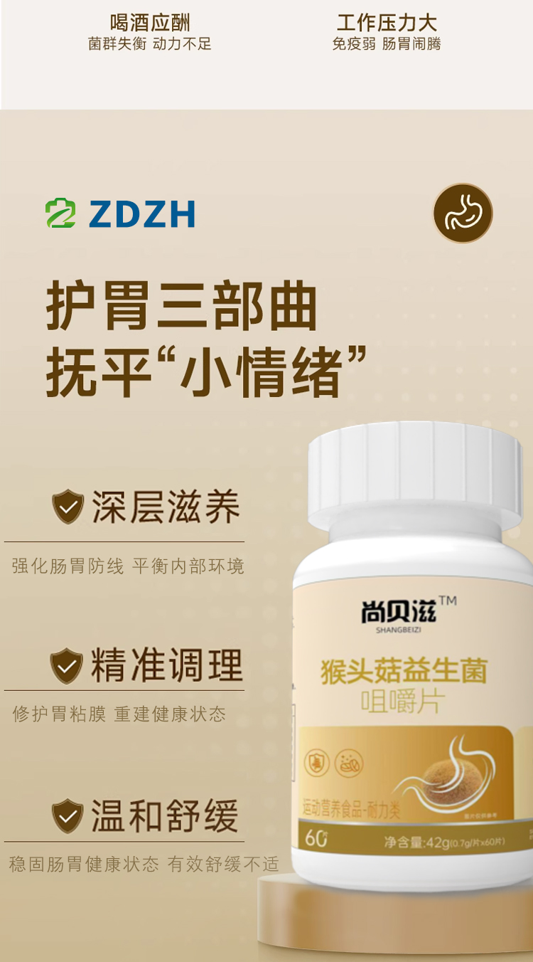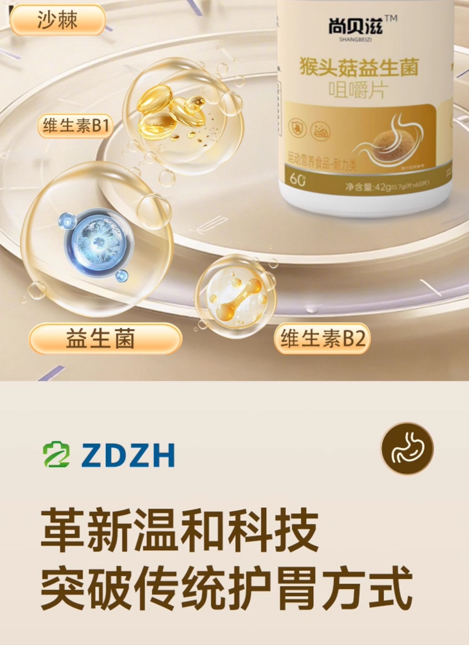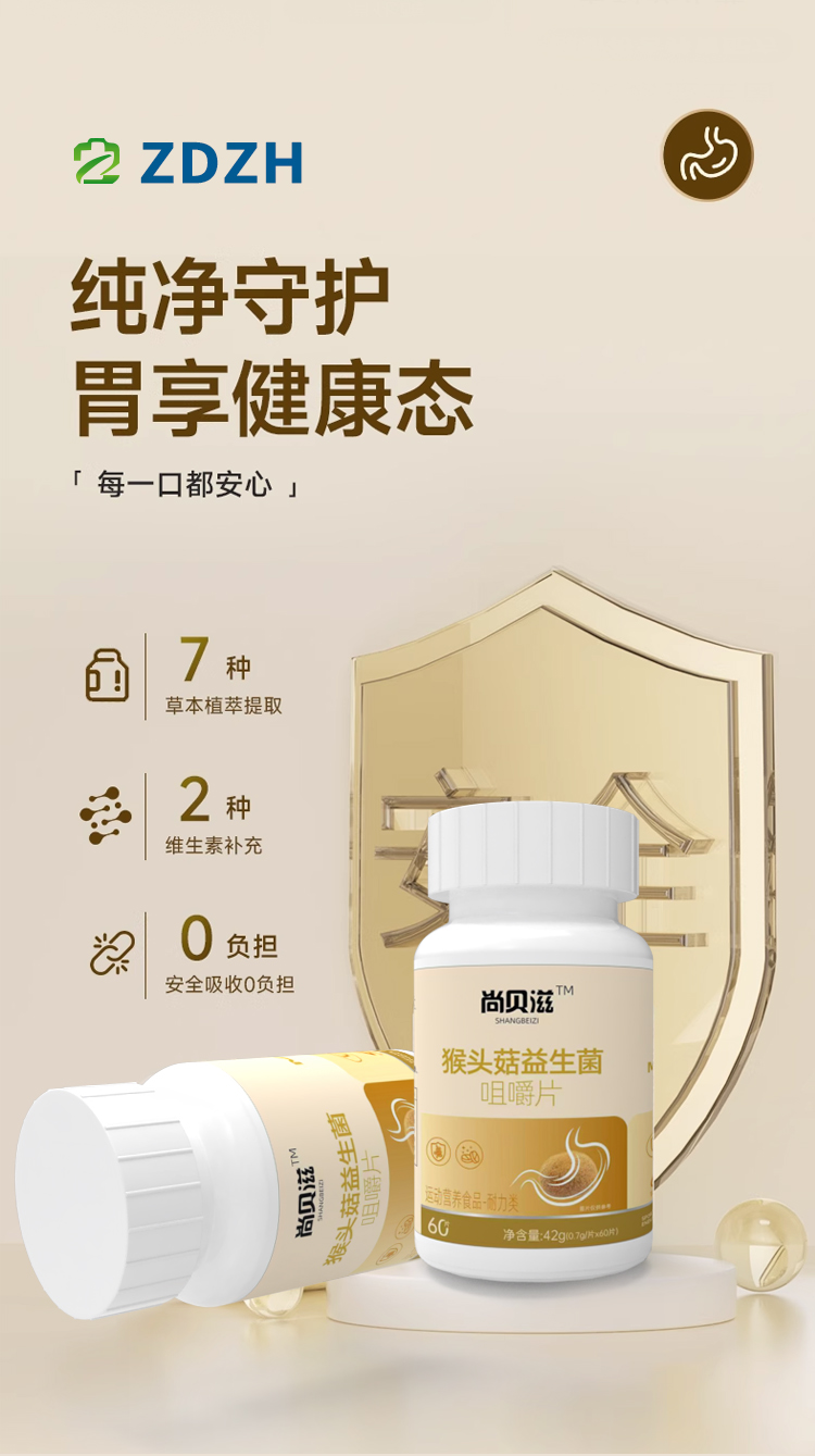 尚贝滋胃宝具有修复胃部黏膜的作用,可帮助改善胃炎或者胃溃疡等慢性胃部疾病。产品的核心成分有猴头菇和沙棘,里面含有黄酮类化合物以及抗氧化物质,可以修复胃部黏膜,促使胃上皮细胞增殖增强,胃部黏膜的屏障功能减少,胃酸或幽门螺杆菌对胃黏膜带来的伤害。猴头菇提取物可以让胃溃疡的愈合时间缩短,并且可以在某种程度上降低复发率。其次,沙棘具有抗氧化作用,能够减少炎症,因此对胃带来的伤害;茯苓能够减少胃酸过多引起的症状;山药可以在胃部表面形成保护膜,减少食物对胃的刺激。