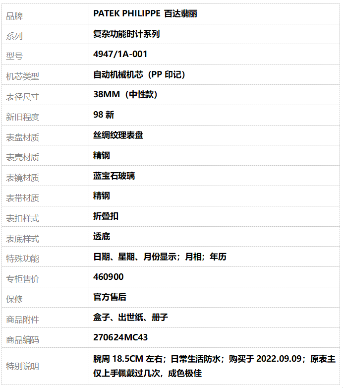 【98新】PATEK PHILIPPE 百达翡丽 复杂功能时计系列 4947/1A-001自动机械机芯 38MM(中性款)270624MC43