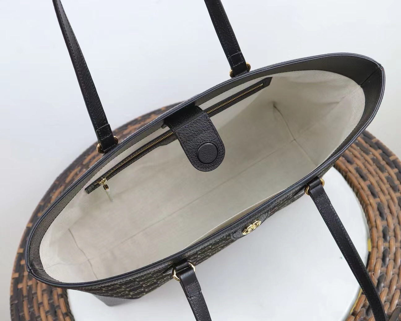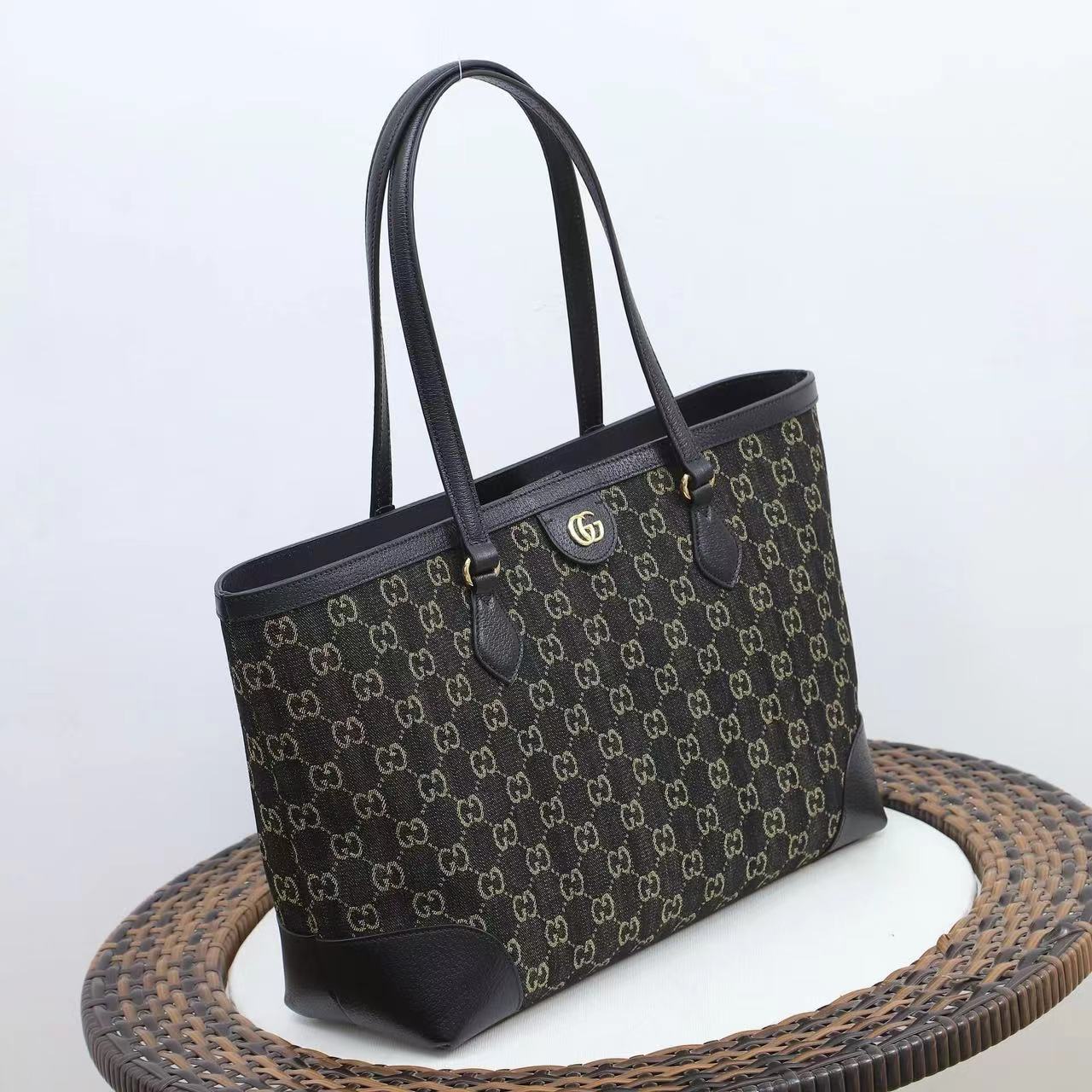 🌟GUCCI新款专柜品质,顶级原单货,实物实拍,款号:631685,尺寸:38x28x14,材质,进口洗水牛仔布配意大利原厂皮,Oidia系列继续将经典融入品牌现代设计理念。GG图案灵感源自30年代的Gucci钻石菱格纹,是品牌历史中不可或缺的传承。这款单品上采用黑色和象牙白色丹宁面料,点缀字母交织图案,突显时尚魅力!