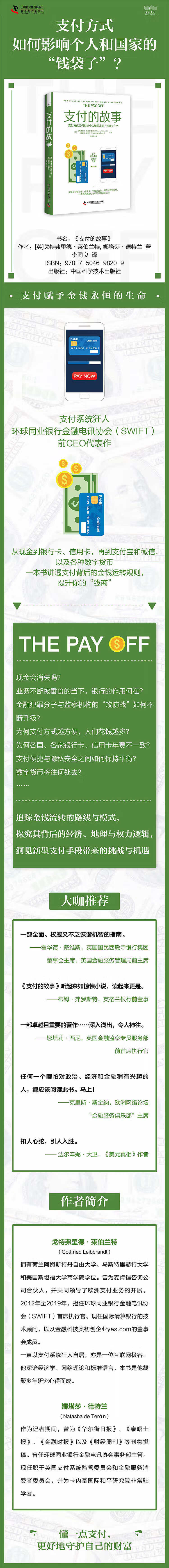 1. 支付系统狂人、环球同业银行金融电讯协会(SWIFT)前CEO代表作 2从现金到银行卡、信用卡,再到支F宝和微信,以及各种数字货币,支付方式如何影响个人和国家的“钱袋子”? 3. 一本书讲透支付背后的金钱运转奥秘,提升你的“钱商”。
