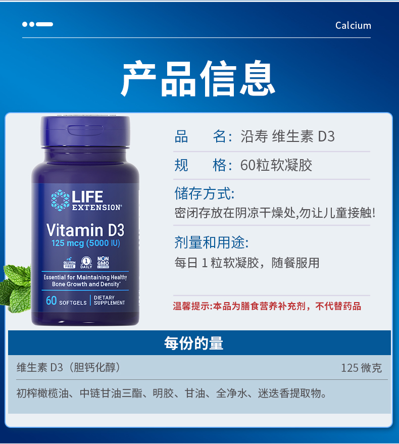 沿寿LIFE EXTENSION VitaminD3 125mcg(沿寿·维生素D3)