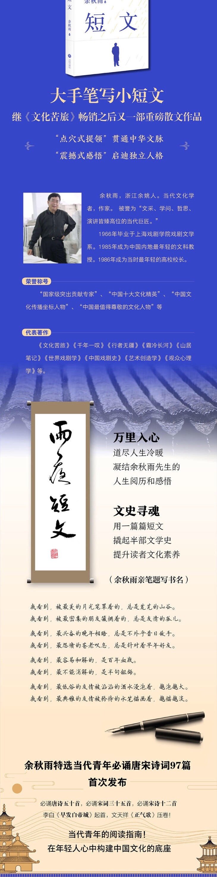 本书是余秋雨散文新作,篇幅短小,意境至美。其中包含两个部分内容: