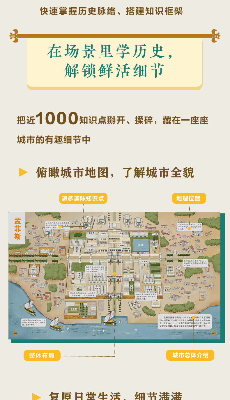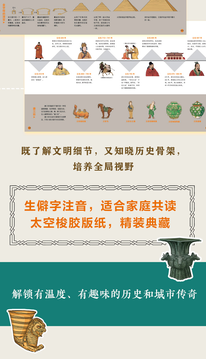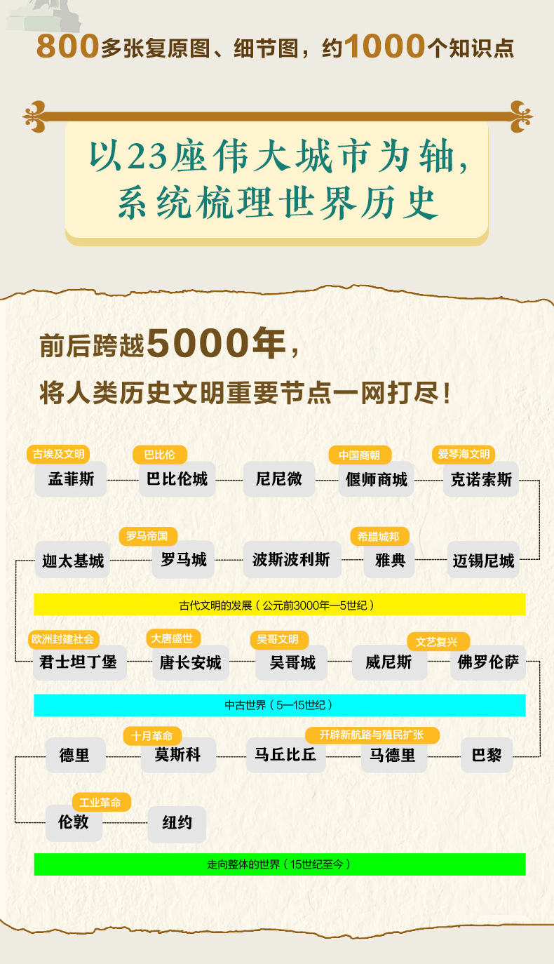 1.创新视角,以23座伟大城市为轴,系统梳理世界历史 前后跨越5000年,将人类历史文明重要节点一网打尽!从公元前3000年的古埃及孟菲斯,到大唐盛世下的长安,再到近现代的美国纽约,系统梳理世界历史,抓取关键事件、人物,带孩子快速掌握历史脉络、搭建知识框架。 2.考古级复原古人生活细节,解锁鲜活历史 基于文物、史料、遗址,复原城市细节,再现伟大城市背后的辉煌文明。直观地图、街景图、工程级建筑剖面图,带孩子深入探索古埃及孟菲斯、巴比伦、罗马等城市,身临其境感知人们的日常生活,解锁有温度、有血肉的历史人物和城市传奇。 3.辅助课堂学习,培养孩子的历史思维、跨学科学习能力 内容衔接中学历史课本,从课本难以呈现的趣味角度解读历史知识,补充背景知识,潜移默化解说历史考点,为轻松学习打好基础。主题多样,贯通历史、地理、科学、艺术、建筑工程、文化等领域,帮助孩子学好大语文,培养跨学科整合知识的能力。 4.800多张复原图、细节图,23张历史时间线,直观理解历史进程 既了解文明细节,又知晓历史骨架,培养全局视野。 5.趣味冷知识+生活化视角,激发孩子的好奇心 古埃及人爱化妆?最早的猫奴是谁?唐朝人真的以肥为美吗?元朝时就有中国人移民柬埔寨?Polo衫和打马球有关?从衣食住行切入历史,让孩子发现历史原来这么有趣。