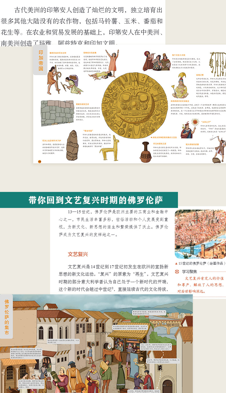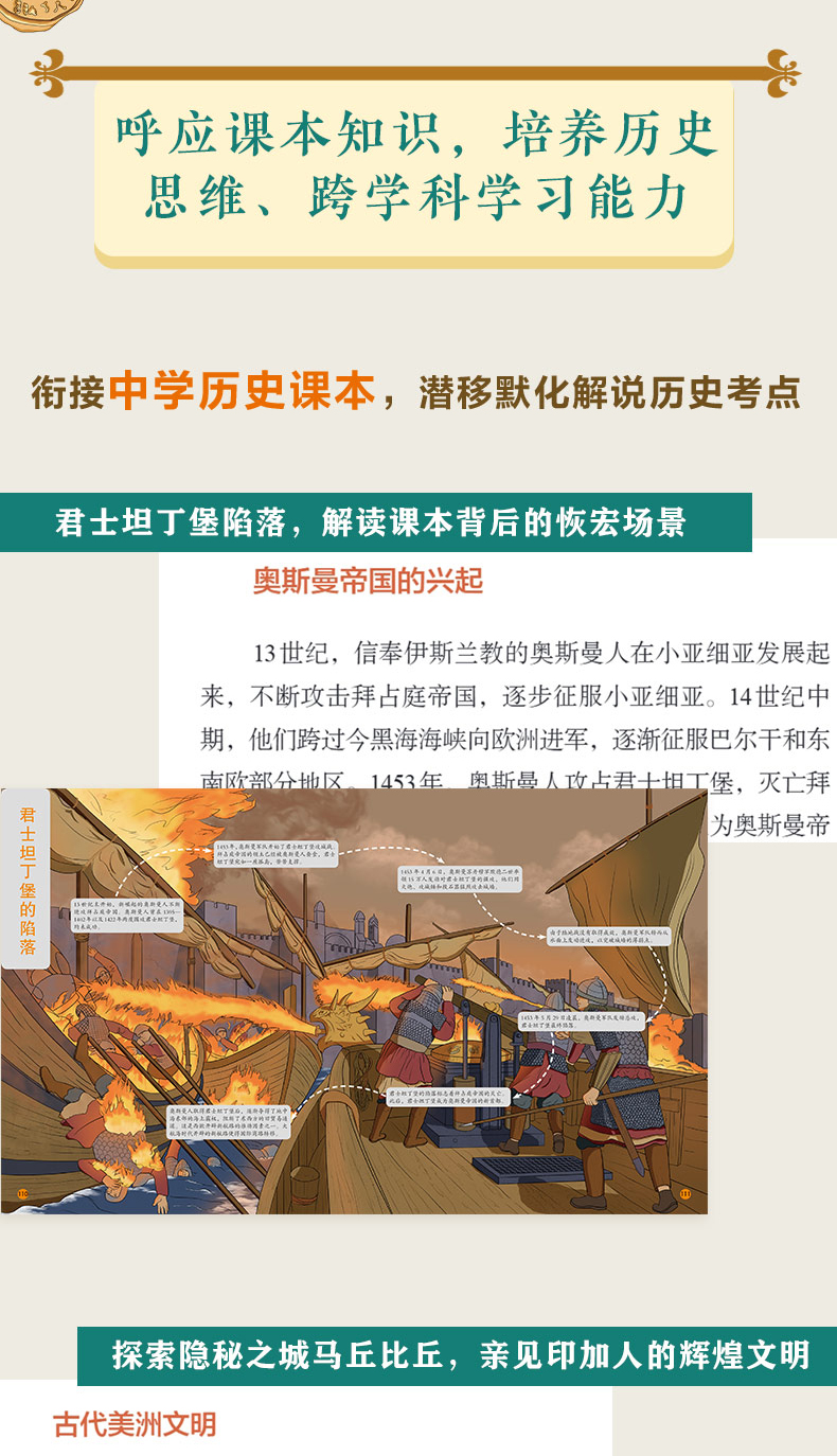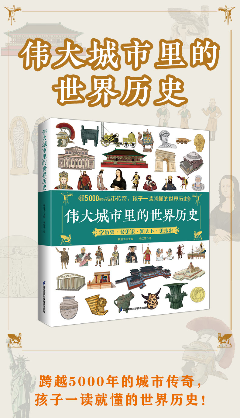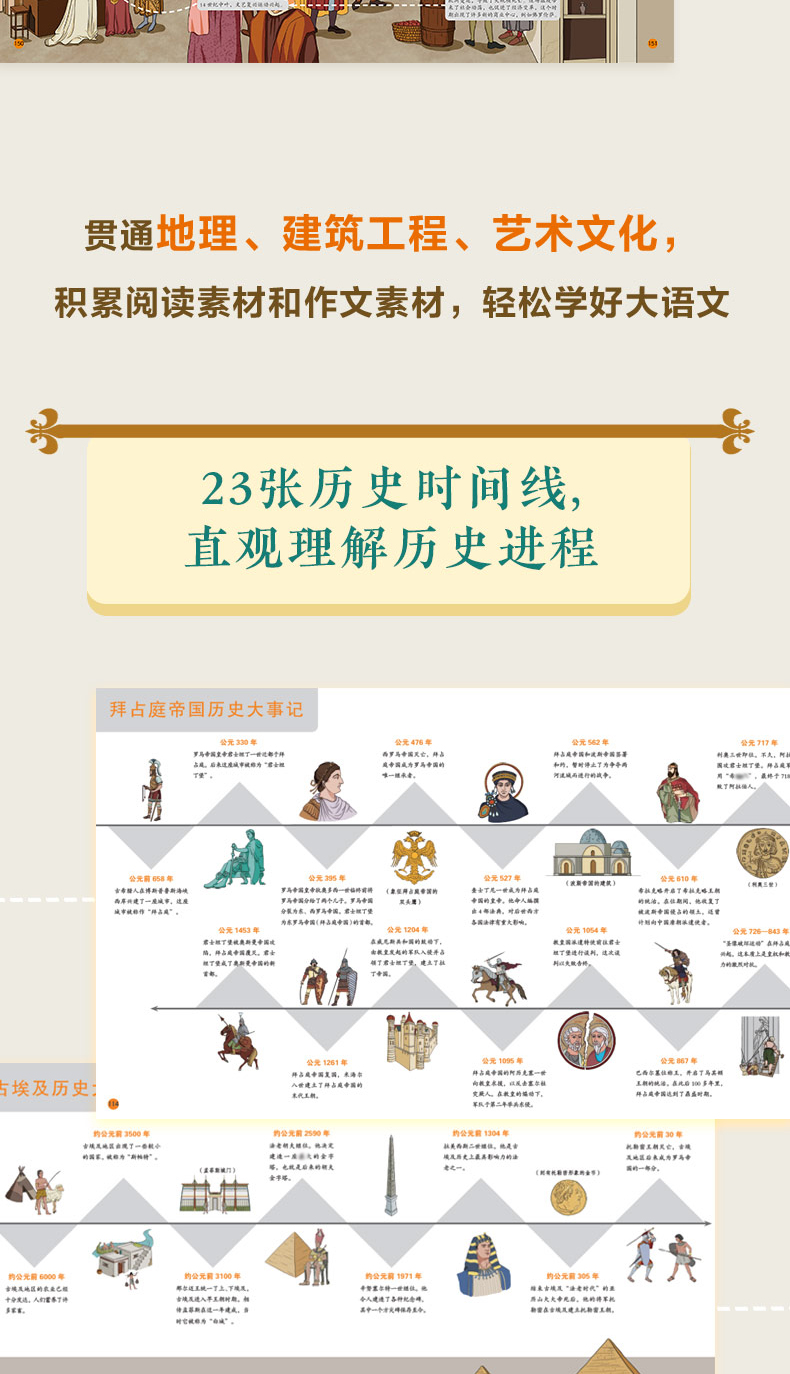 1.创新视角,以23座伟大城市为轴,系统梳理世界历史 前后跨越5000年,将人类历史文明重要节点一网打尽!从公元前3000年的古埃及孟菲斯,到大唐盛世下的长安,再到近现代的美国纽约,系统梳理世界历史,抓取关键事件、人物,带孩子快速掌握历史脉络、搭建知识框架。 2.考古级复原古人生活细节,解锁鲜活历史 基于文物、史料、遗址,复原城市细节,再现伟大城市背后的辉煌文明。直观地图、街景图、工程级建筑剖面图,带孩子深入探索古埃及孟菲斯、巴比伦、罗马等城市,身临其境感知人们的日常生活,解锁有温度、有血肉的历史人物和城市传奇。 3.辅助课堂学习,培养孩子的历史思维、跨学科学习能力 内容衔接中学历史课本,从课本难以呈现的趣味角度解读历史知识,补充背景知识,潜移默化解说历史考点,为轻松学习打好基础。主题多样,贯通历史、地理、科学、艺术、建筑工程、文化等领域,帮助孩子学好大语文,培养跨学科整合知识的能力。 4.800多张复原图、细节图,23张历史时间线,直观理解历史进程 既了解文明细节,又知晓历史骨架,培养全局视野。 5.趣味冷知识+生活化视角,激发孩子的好奇心 古埃及人爱化妆?最早的猫奴是谁?唐朝人真的以肥为美吗?元朝时就有中国人移民柬埔寨?Polo衫和打马球有关?从衣食住行切入历史,让孩子发现历史原来这么有趣。