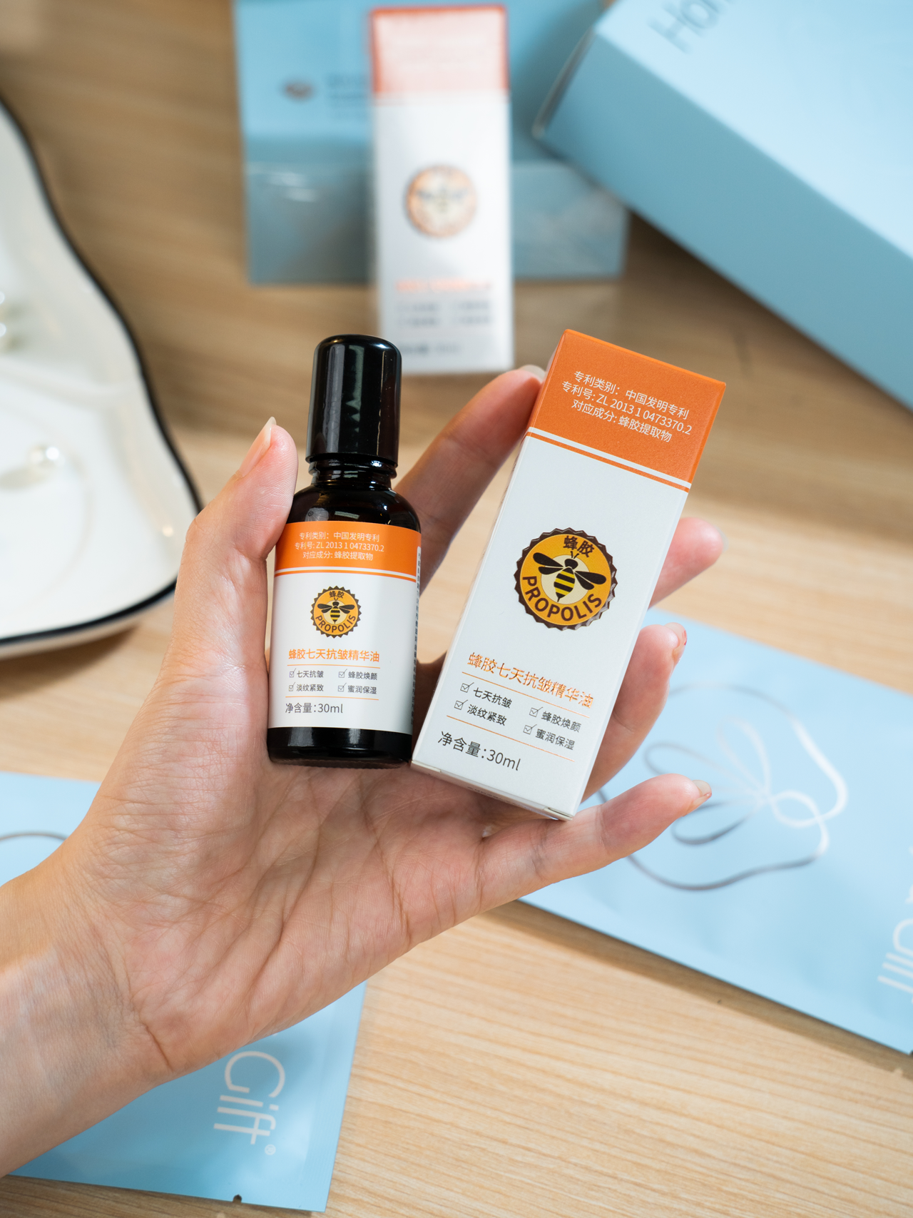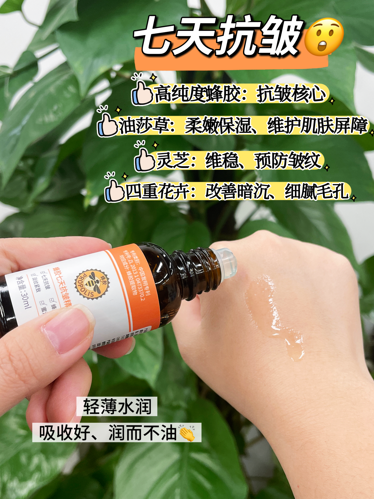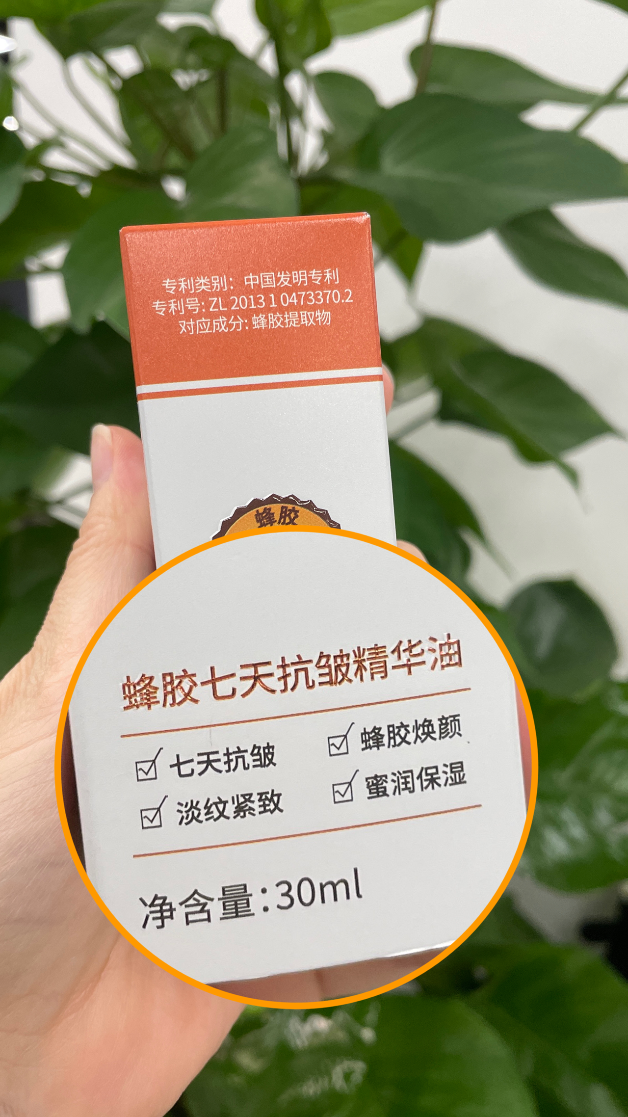 后来我定睛一看,“蜂胶七天抗皱精华油”,划重点:蜂胶!那就对了。