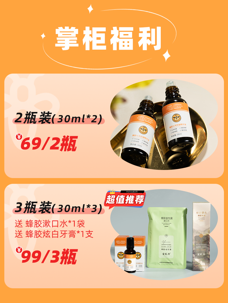 69元/2瓶,99元/3瓶(加赠蜂胶漱口水*1袋+蜂胶炫白牙膏*1支)。