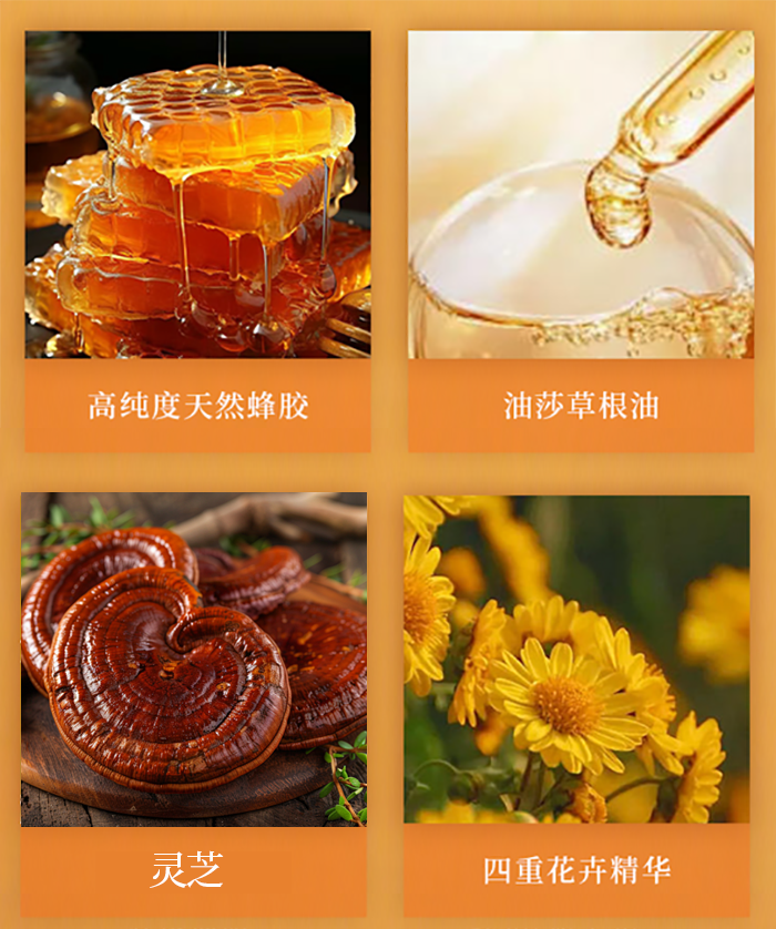 除了蜂胶,还添加了油莎草根油、灵芝、以及四重花卉精华等。
