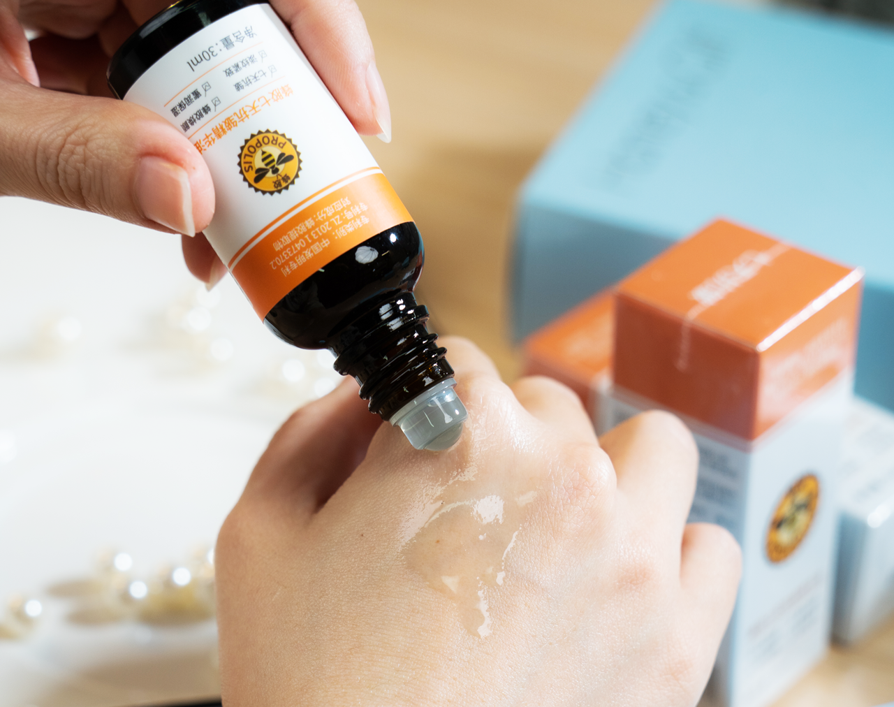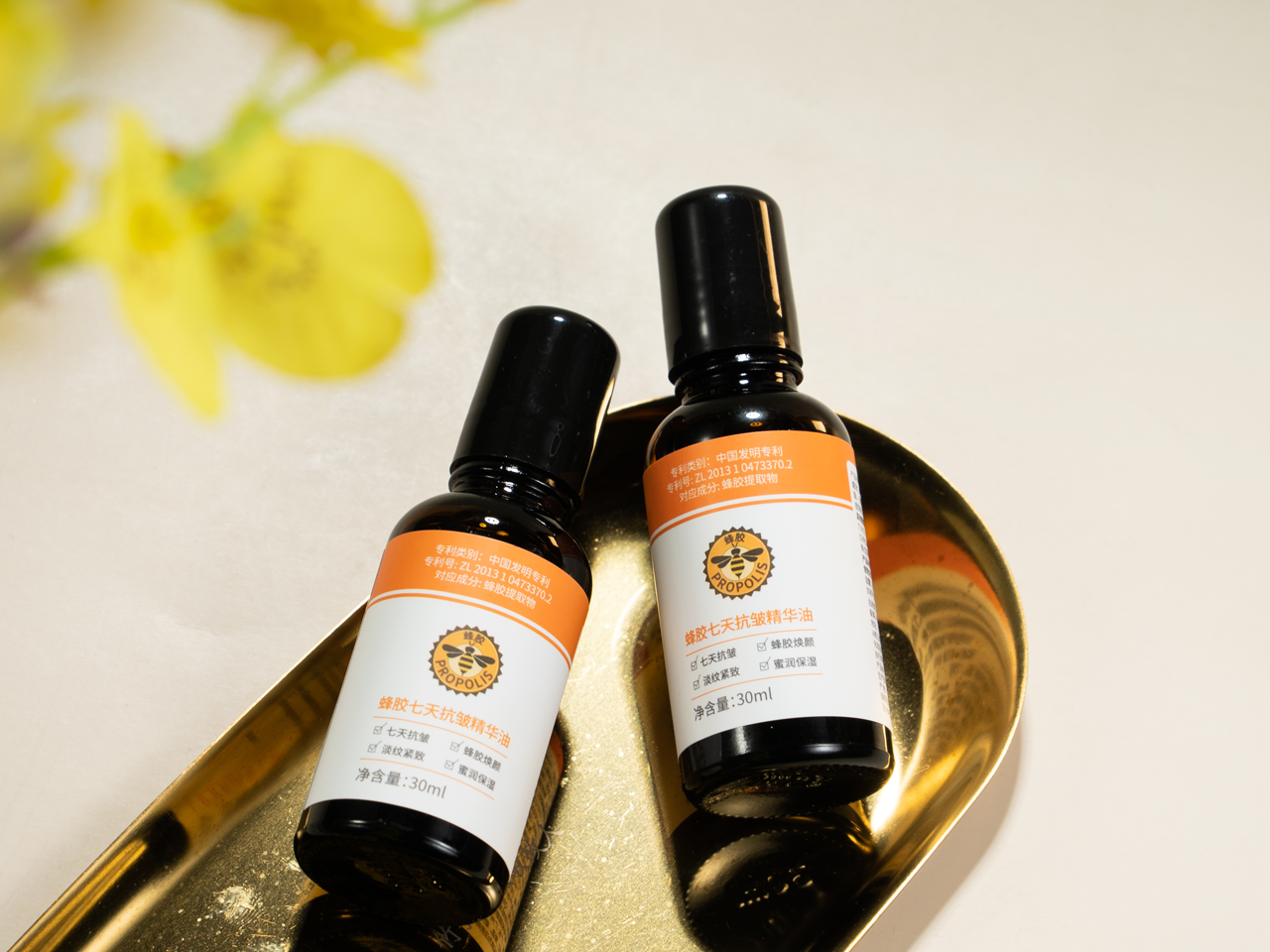 蜂胶七天抗皱油,虽说是油,但因为用了高纯度蜂胶,质地轻薄水润,吸收很快,润而不油。