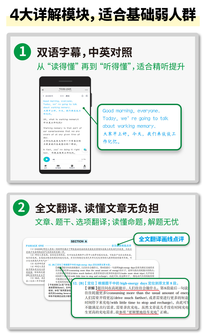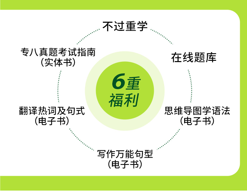 3. 题量丰富,含10套专八真题+7套听力+6套阅读+12篇改错+10篇翻译+10篇作文;