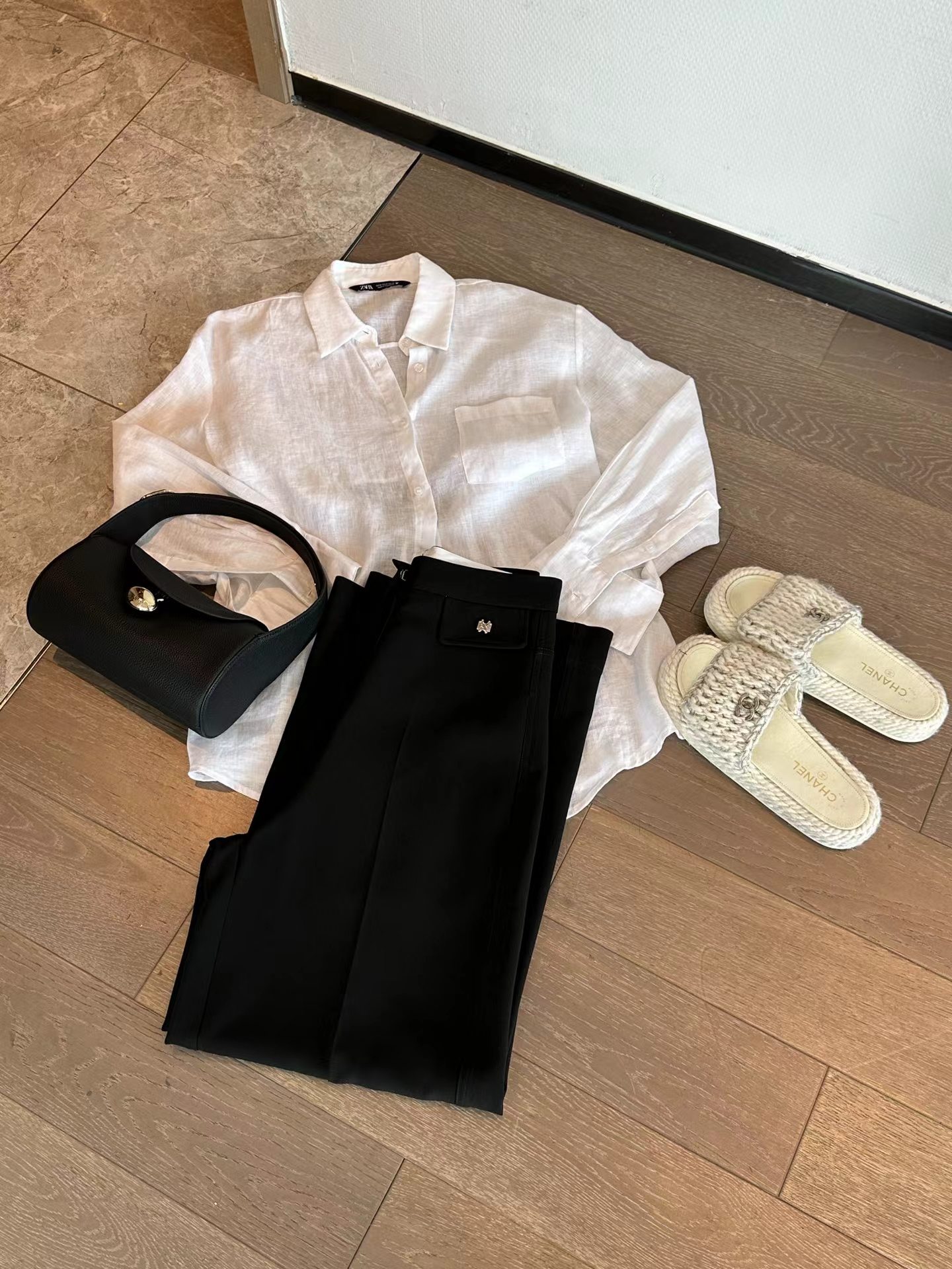 上身穿收腰一点的打底或者衬衫就能起范,搭配西服简单白tee,质感十足。