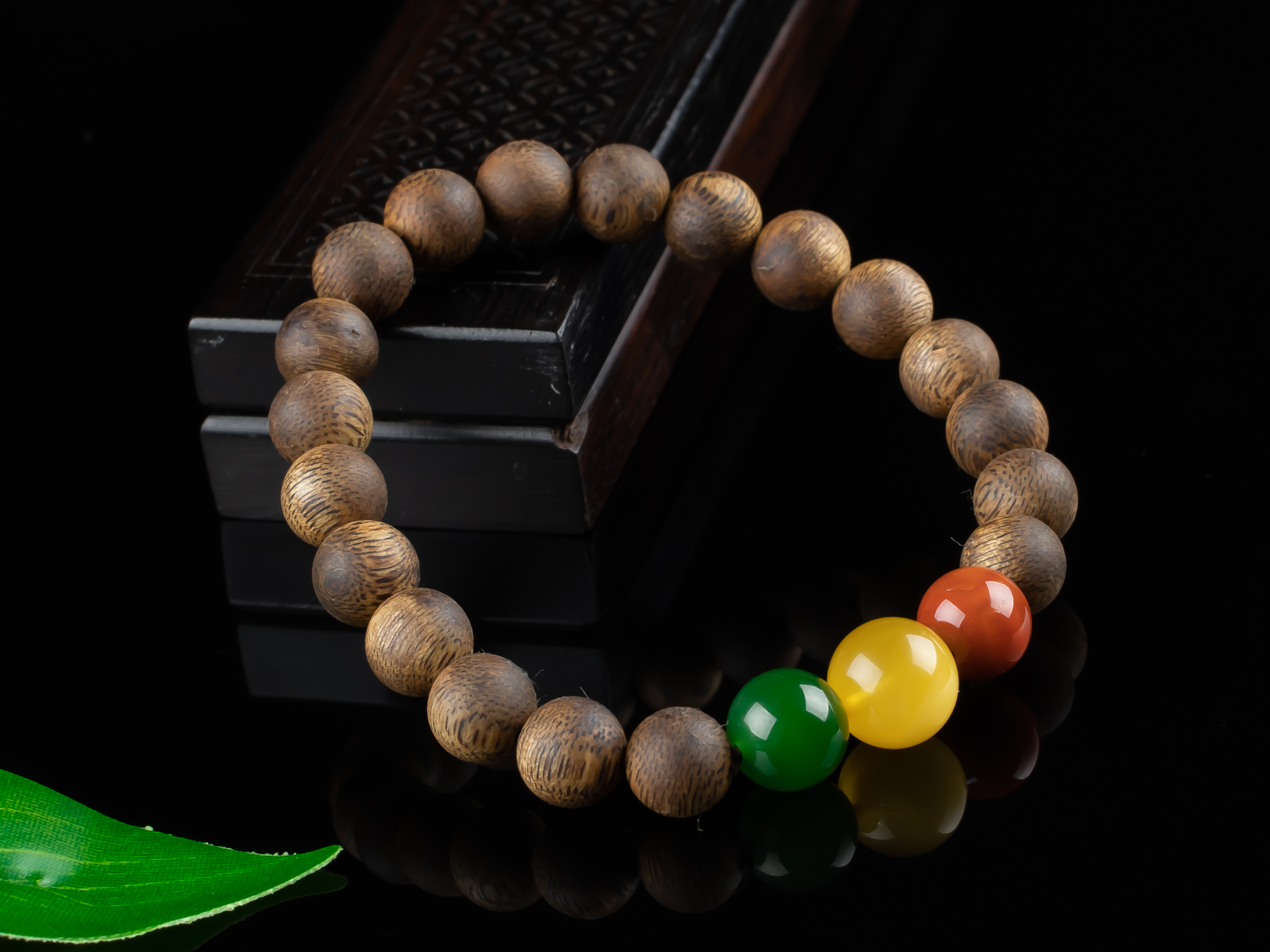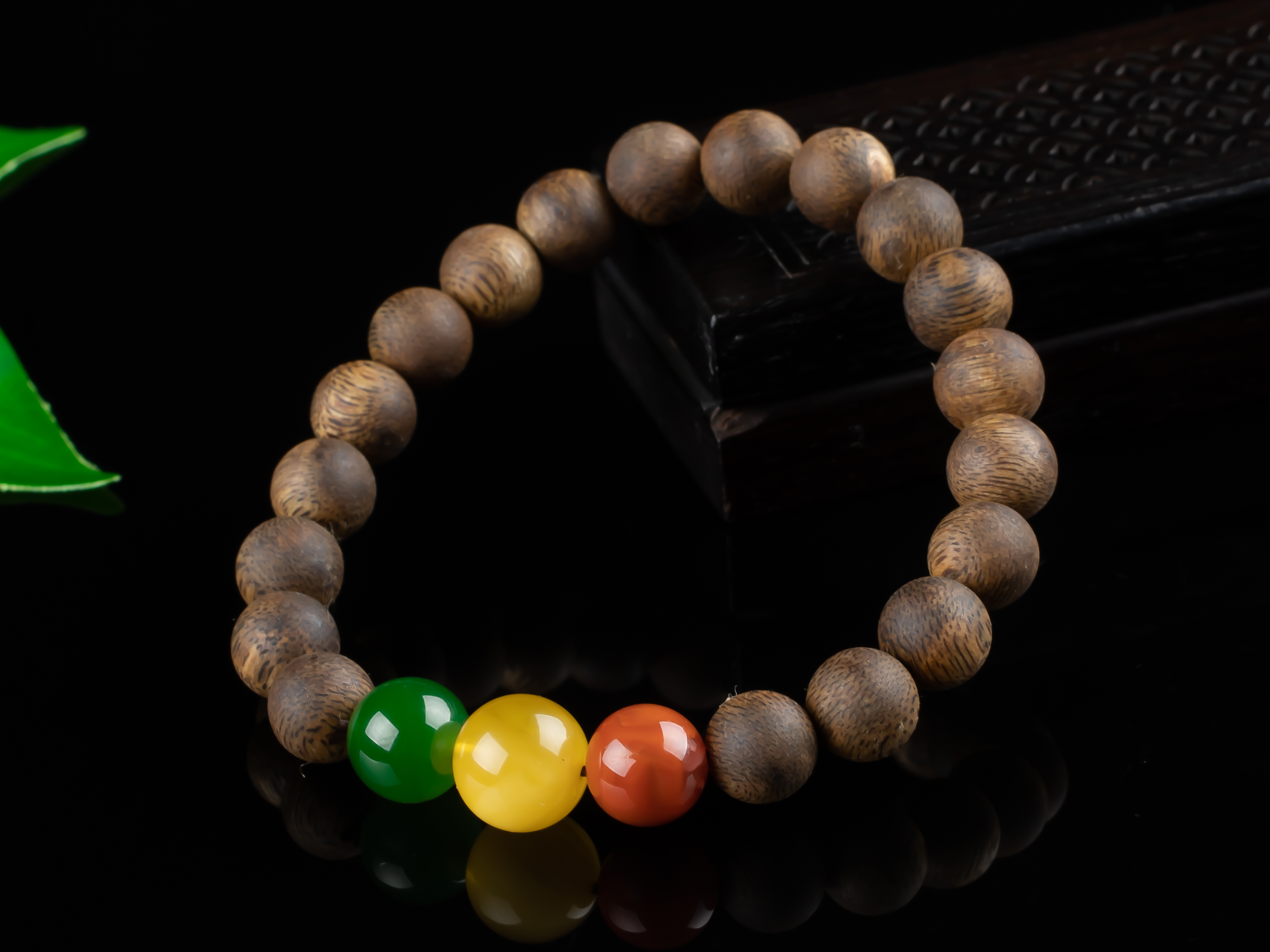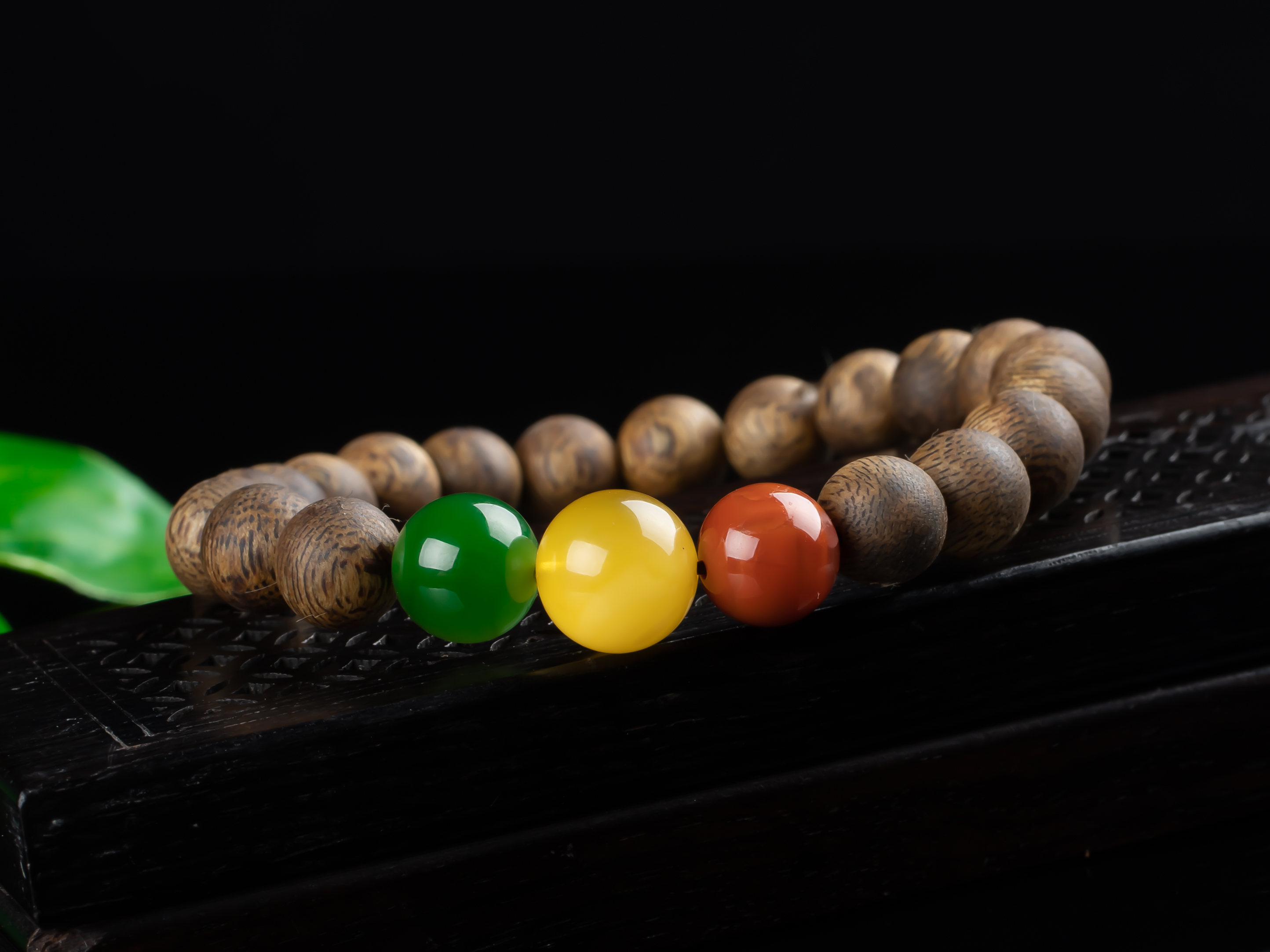 XY0139沉香+南红蜜蜡碧玉吉祥三宝手串,天然沉香圆珠8.3mm,南红蜜蜡碧玉各一颗,三彩宝珠,好运、吉祥、富贵。