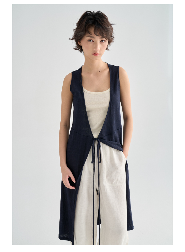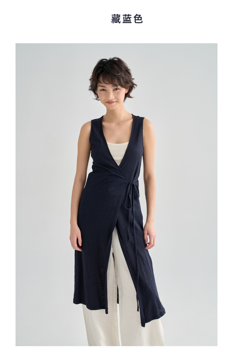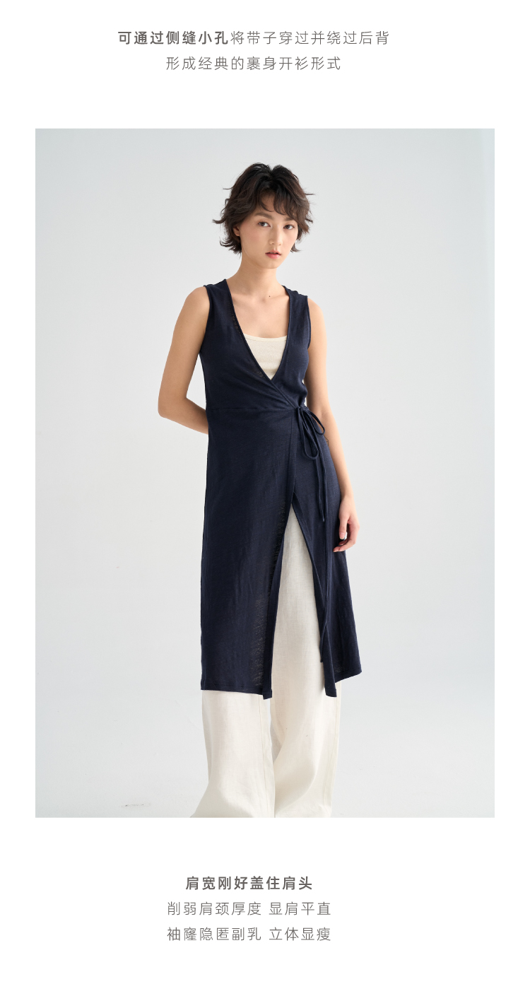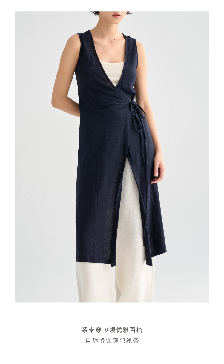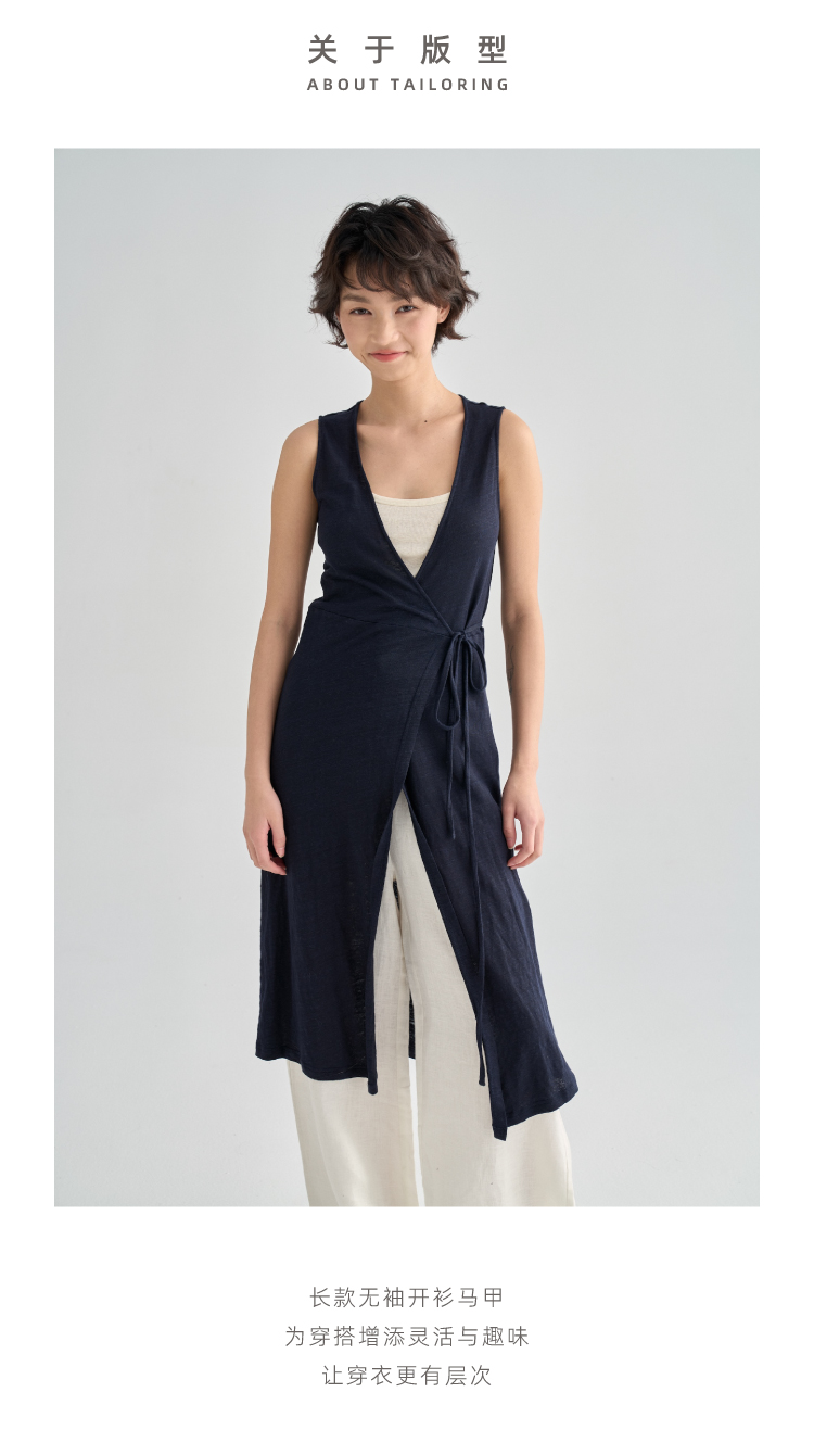 亚麻长款裹身无袖开衫马甲