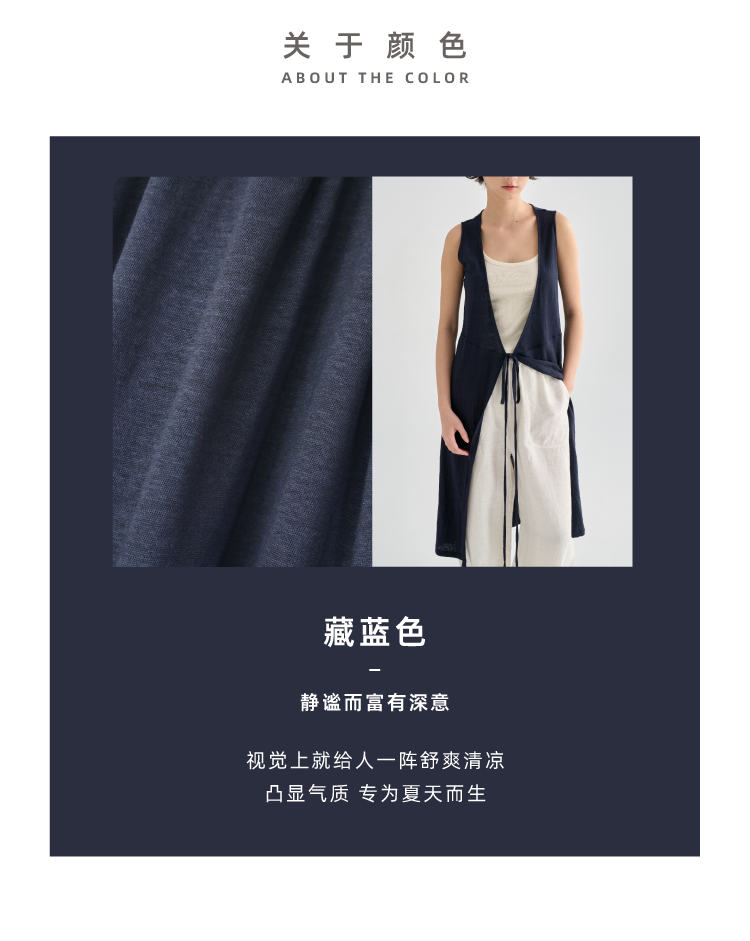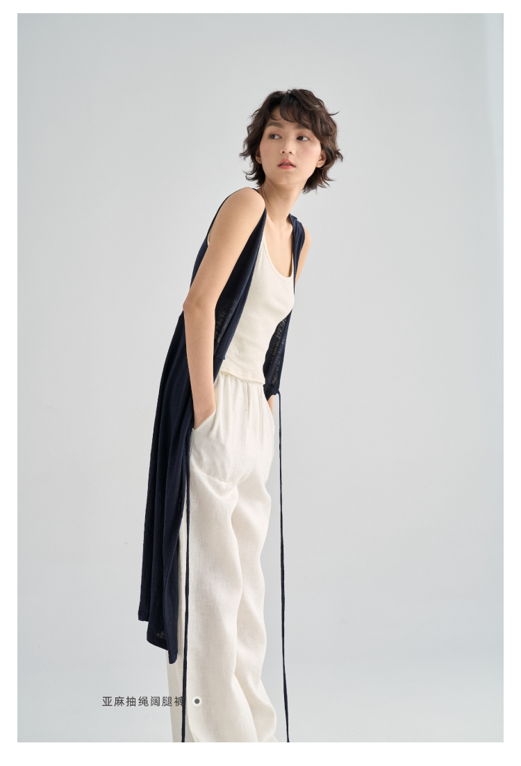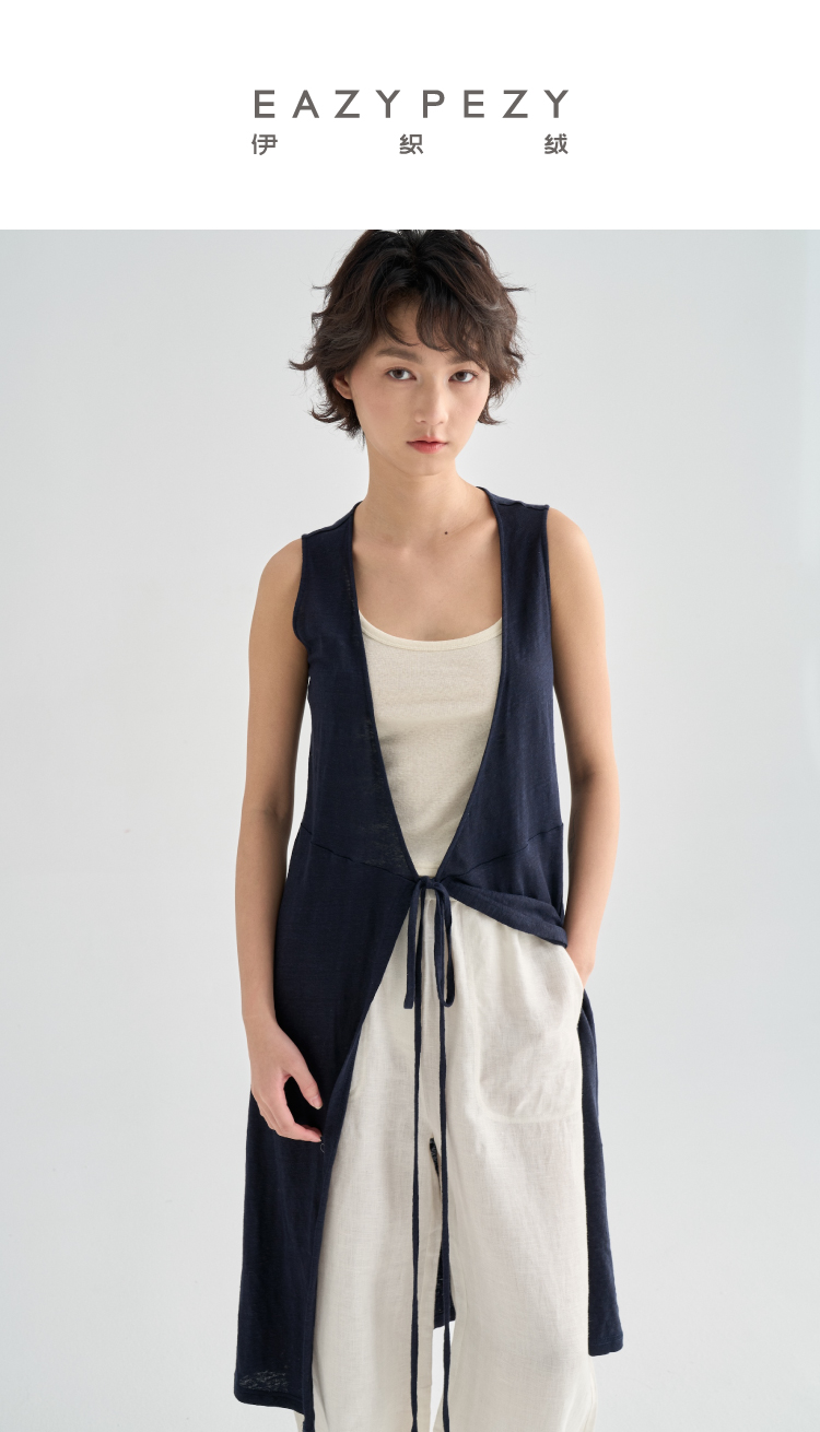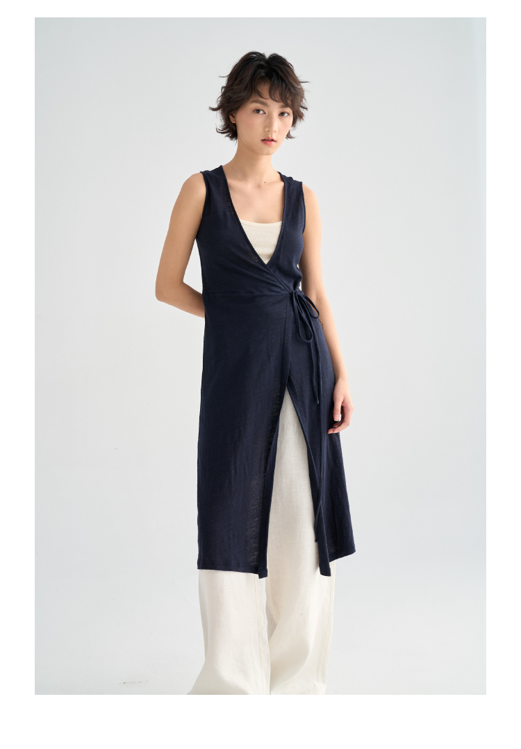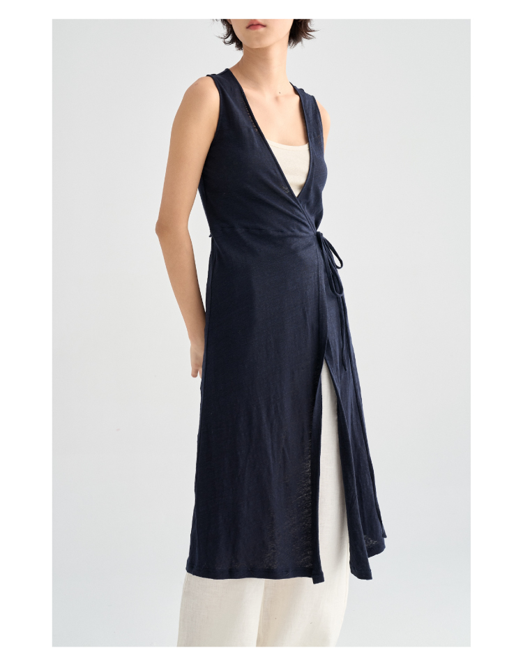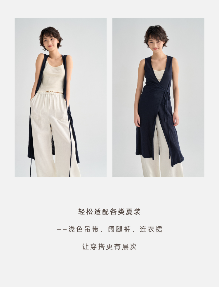 亚麻长款裹身无袖开衫马甲