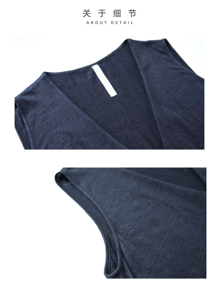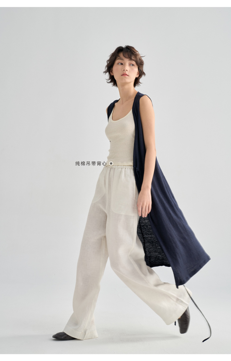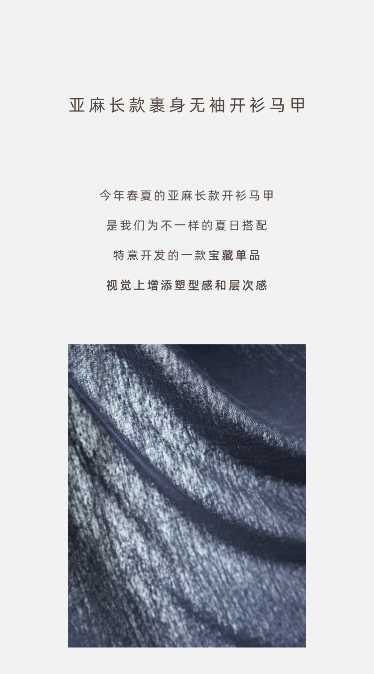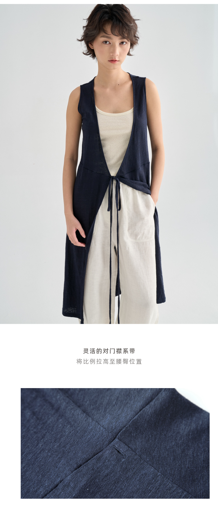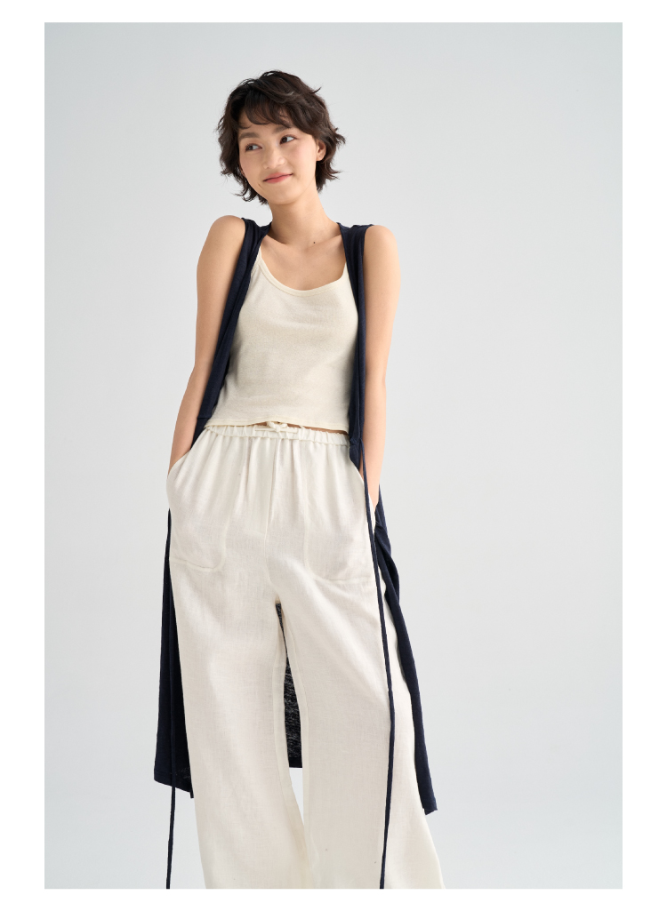 亚麻长款裹身无袖开衫马甲