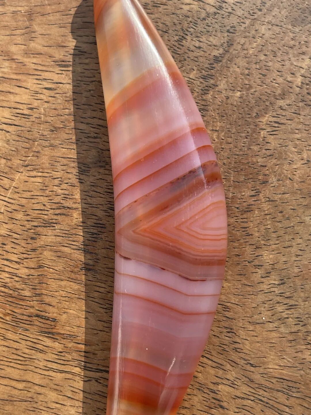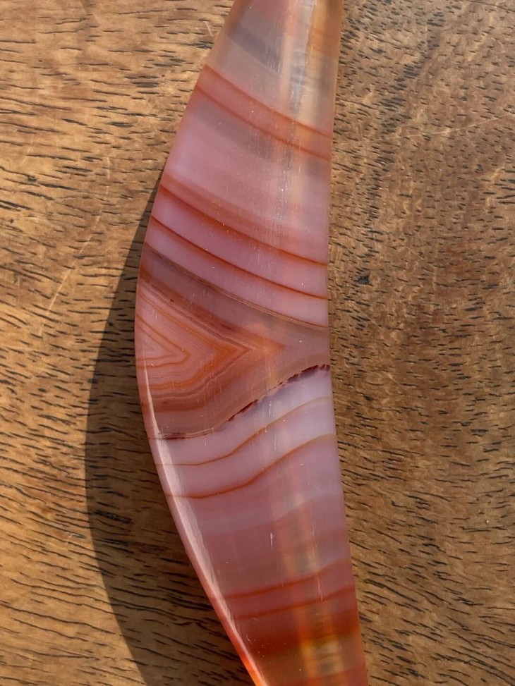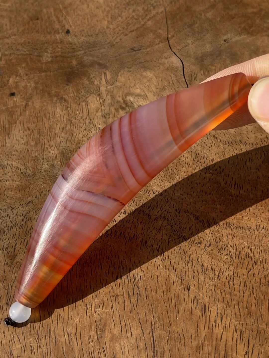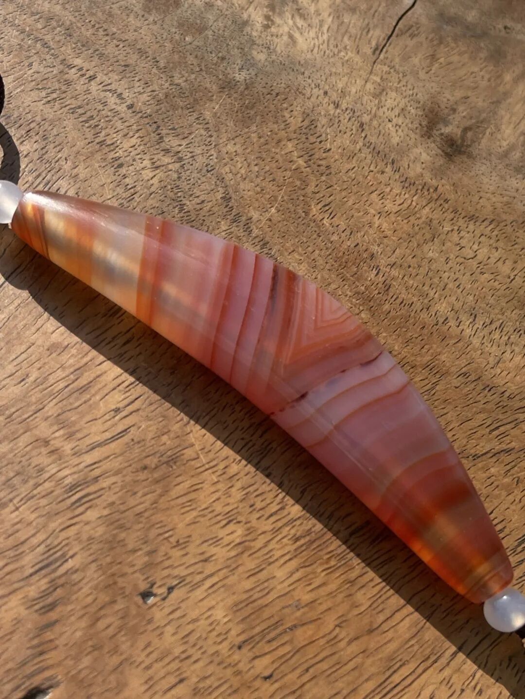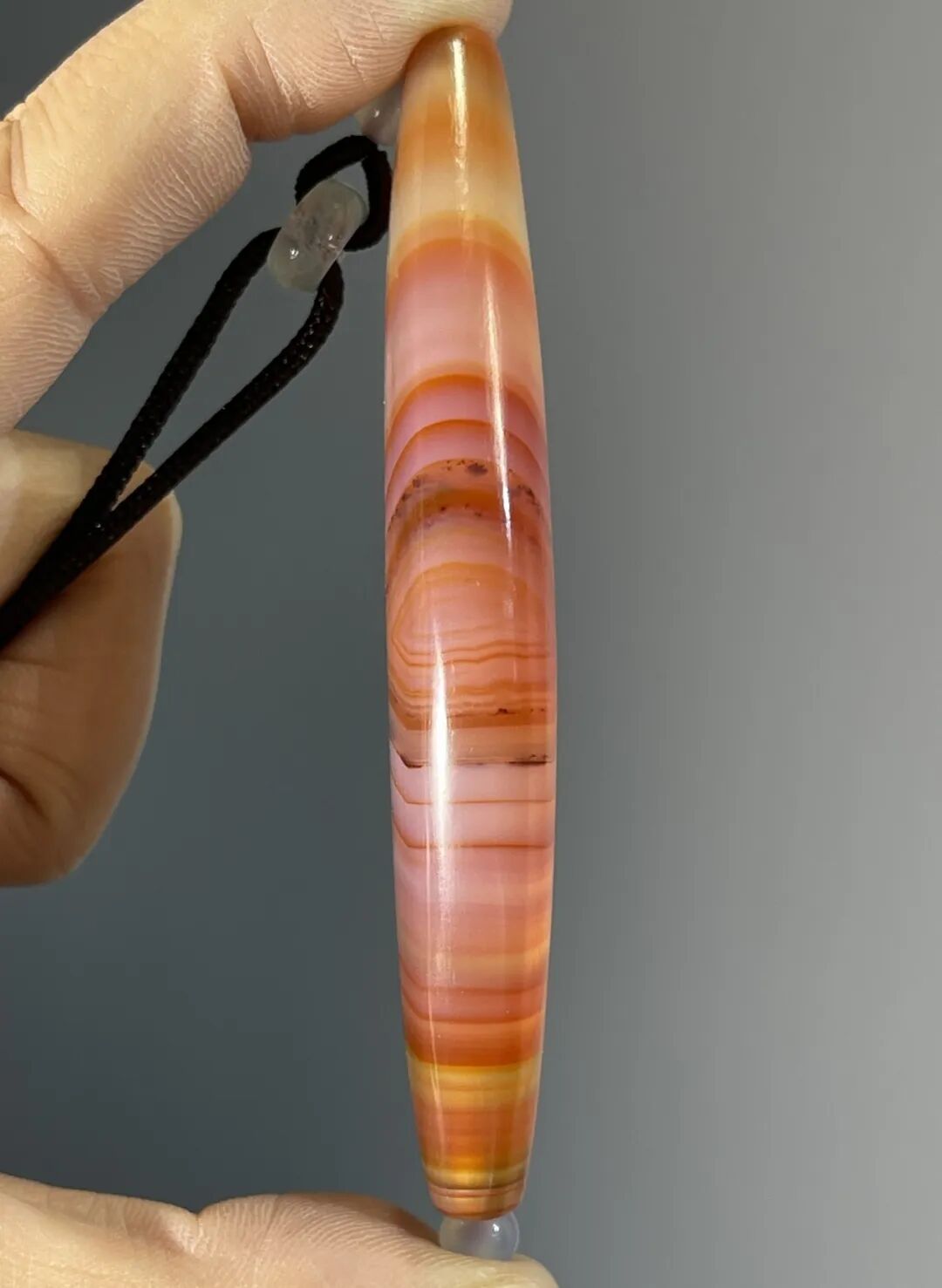 这是一粒质地通透、纹理清晰美丽、桃红、粉红、深红与藕色地对比分明的老缠丝玛瑙牛角型珠,此珠细线缠丝纹,纹理生动色彩对比凊晰。此牛角型珠,柔美粉色阶对比强、纹理自然,细线缠丝生动清晰,质地细腻通透,风化纹自然,孔道自然磨损痕清晰可见,质地包浆温润如玉。此种色彩柔美、对比强的牛角型珠制作技艺精湛,年代最早可以追溯到公元前2000 至4000年时期。
