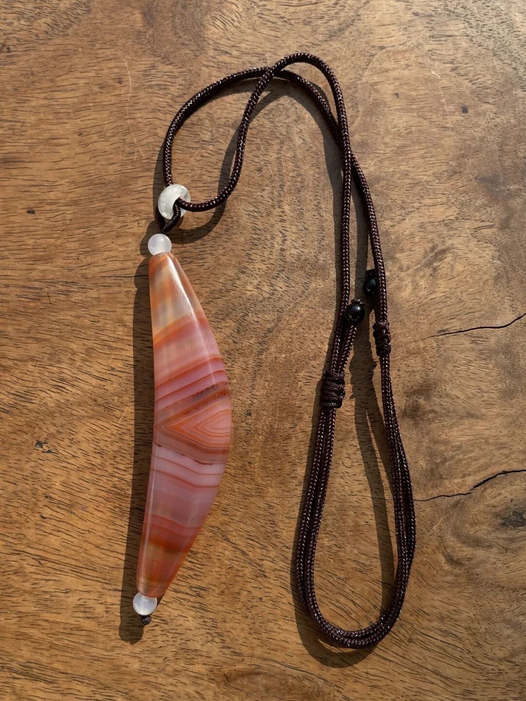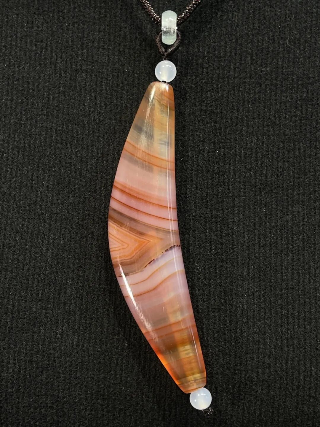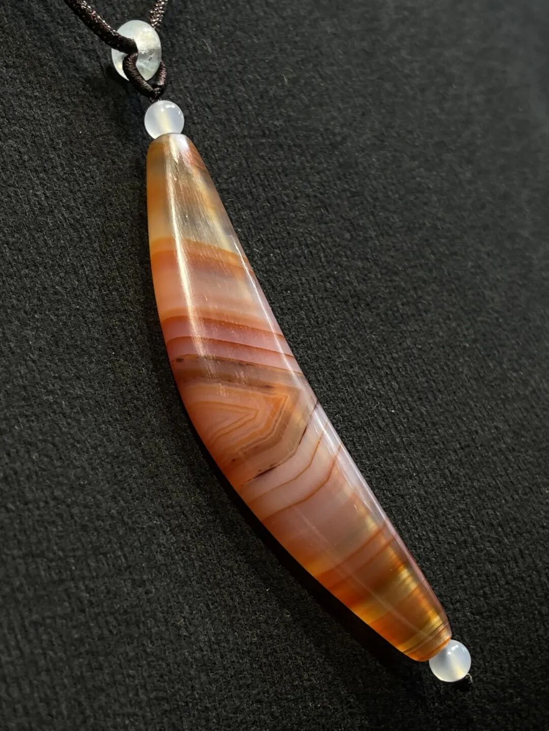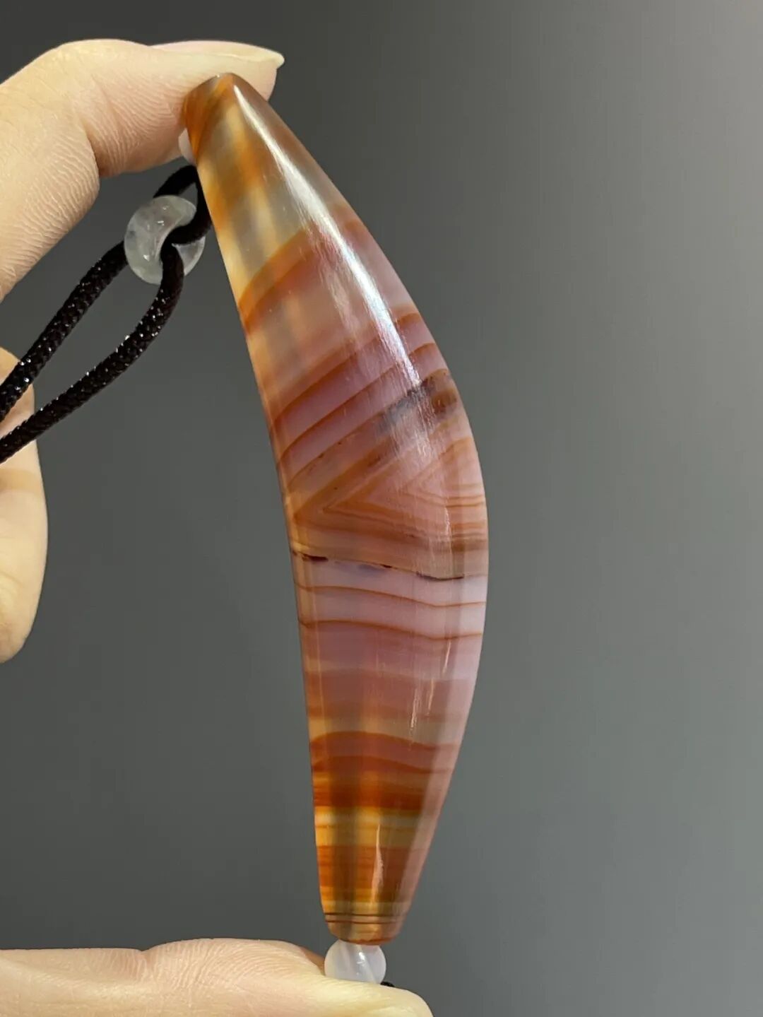 这只桃红缠丝玛瑙牛角型珠,细线缠纹理清晰,牛角珠型独特,质地通透、色泽柔美迷人,格外新潮时尚,不落俗套。以绳结简易串成吊坠,入手即可佩戴。