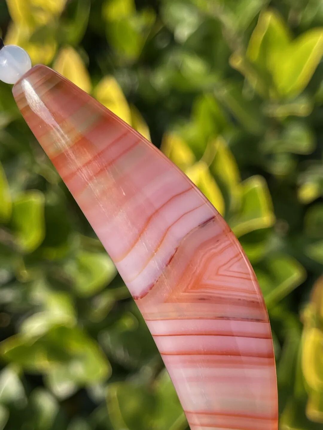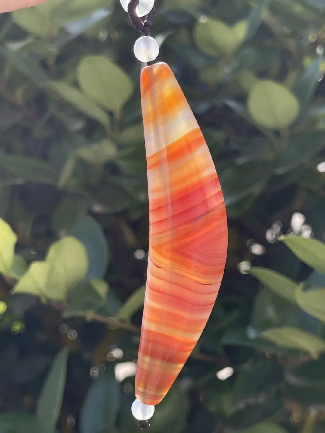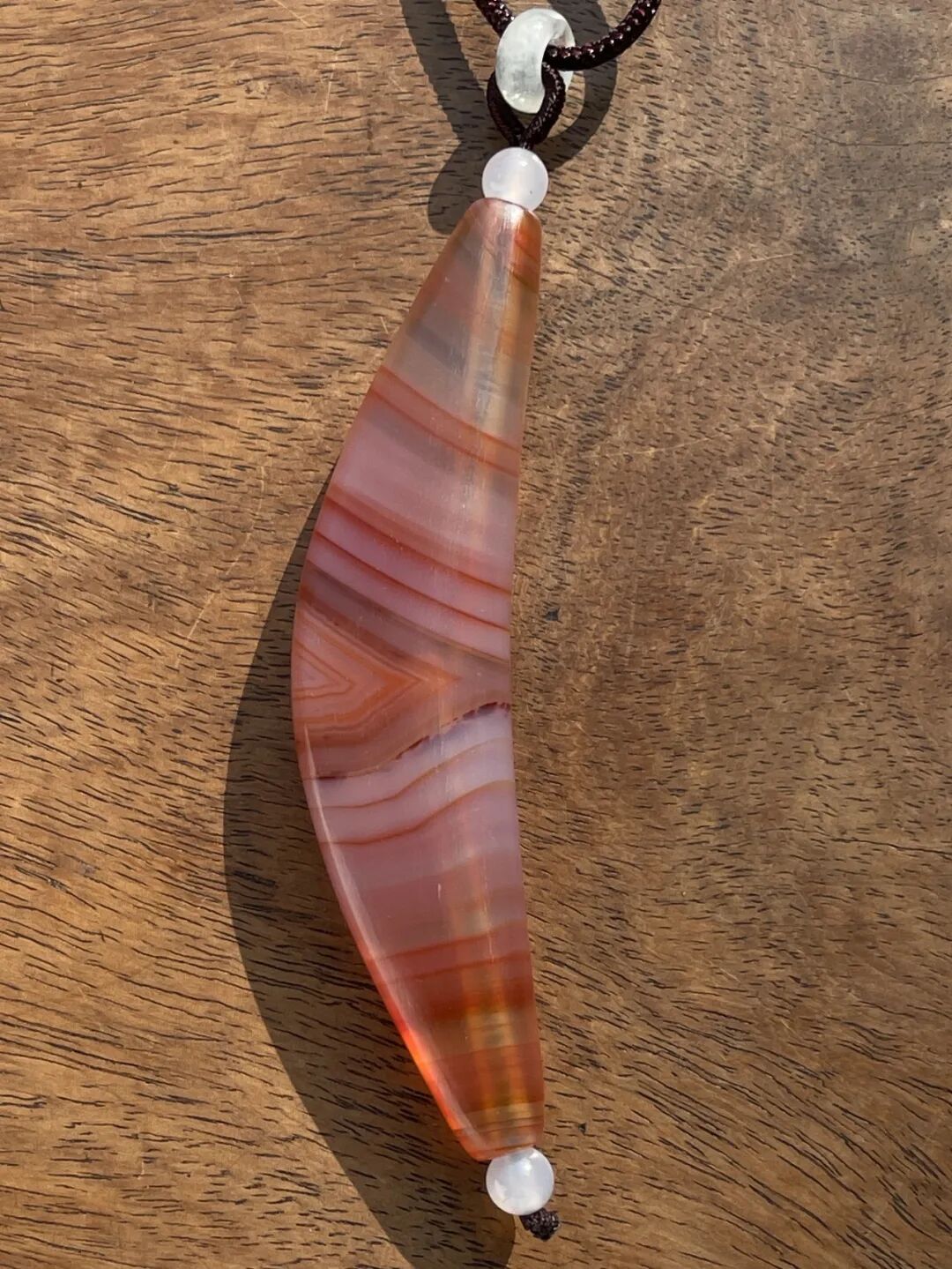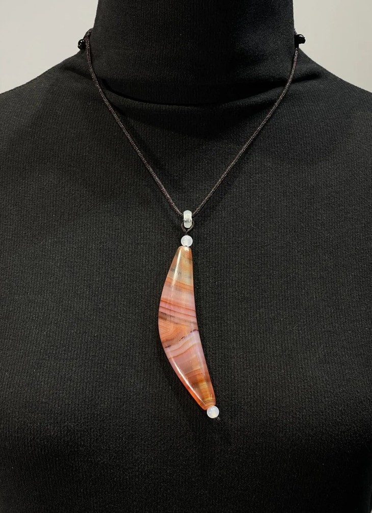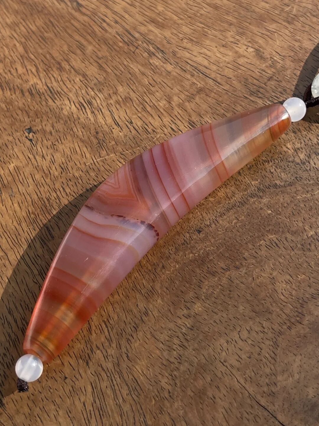 这只桃红缠丝玛瑙牛角型珠,细线缠纹理清晰,牛角珠型独特,质地通透、色泽柔美迷人,格外新潮时尚,不落俗套。以绳结简易串成吊坠,入手即可佩戴。