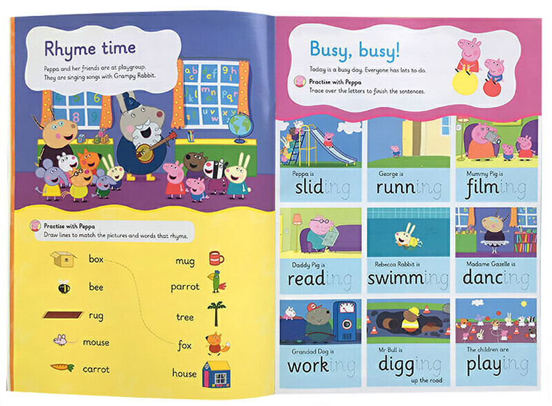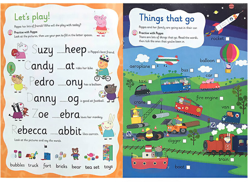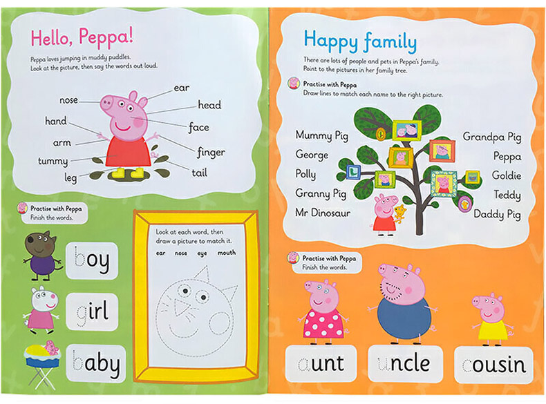 Peppa Pig Wipe-Clean是英国Ladybird出版社推出的一系列以“小猪佩奇”为主题的可重复擦写的趣味练习册,分别涉及数字、数数、书写、单词、时钟、游戏等学前启蒙认知内容。每本书均附赠一只白板笔(带海绵擦头),可写可擦,能反复练习使用。 这本Peppa Pig: Practise with Peppa: Wipe-Clean First Words《小猪佩奇擦擦书:单词》将生活中常见的单词按照孩子熟悉的生活场景分类,如浴室、餐厅、花园、穿衣服、身体部位、交通工具、休闲活动等多种主题。通过分类可以让孩子更容易熟悉各组单词。随书附赠一只可重复擦拭的白板笔,孩子可重复练习,慢慢熟悉,非常适合刚学英文的小朋友使用。 推荐理由: 1.小猪佩奇主题,孩子熟悉喜爱,不知不觉爱上学习; 2.练习形式多样有趣,如单词填写、图片配对等; 3.独特可擦写设计(Wipe-Clean),赠白板笔,可轻松擦去,可反复多次练习。 4.黄磊女儿都在用的小猪佩奇擦擦书,英文原版,大开本。 Practise lots of new first words with Peppa Pig and friends in this colourful wipe-clean activity book. Activities include adding a word to a sentence and matching pictures to words while introducing key themes such as shopping, clothes, parts of the body, garden, things that go and weather. Complete the activities, wipe the page clean and practise again and again. Includes a free pen. Perfect for young children who are starting school and need to practise their new writing skills and pencil control while learning to read lots of new words. The perfect follow-on title from the early writing skills practised in Practise with Peppa: Wipe-Clean First Letters and Practise with Peppa: Wipe-Clean First Writing.