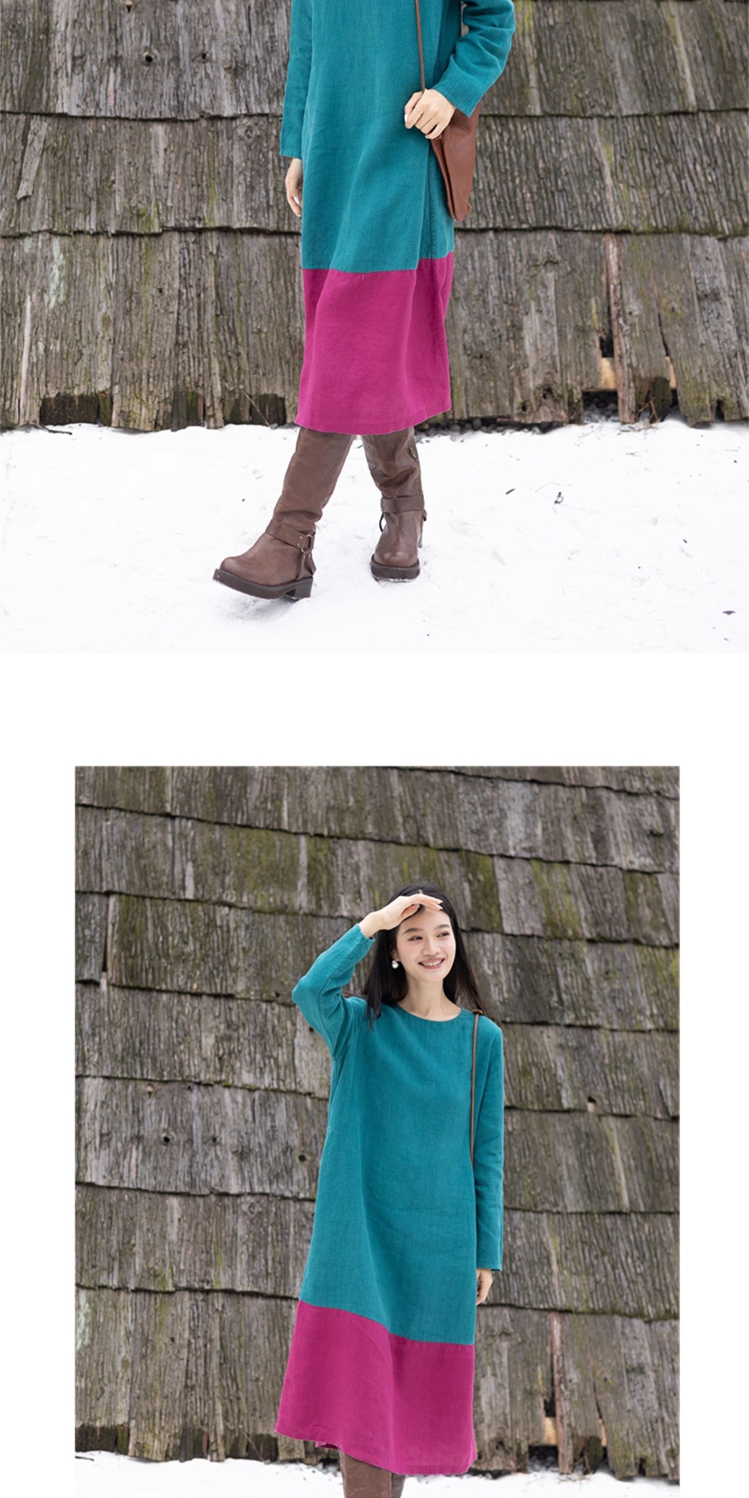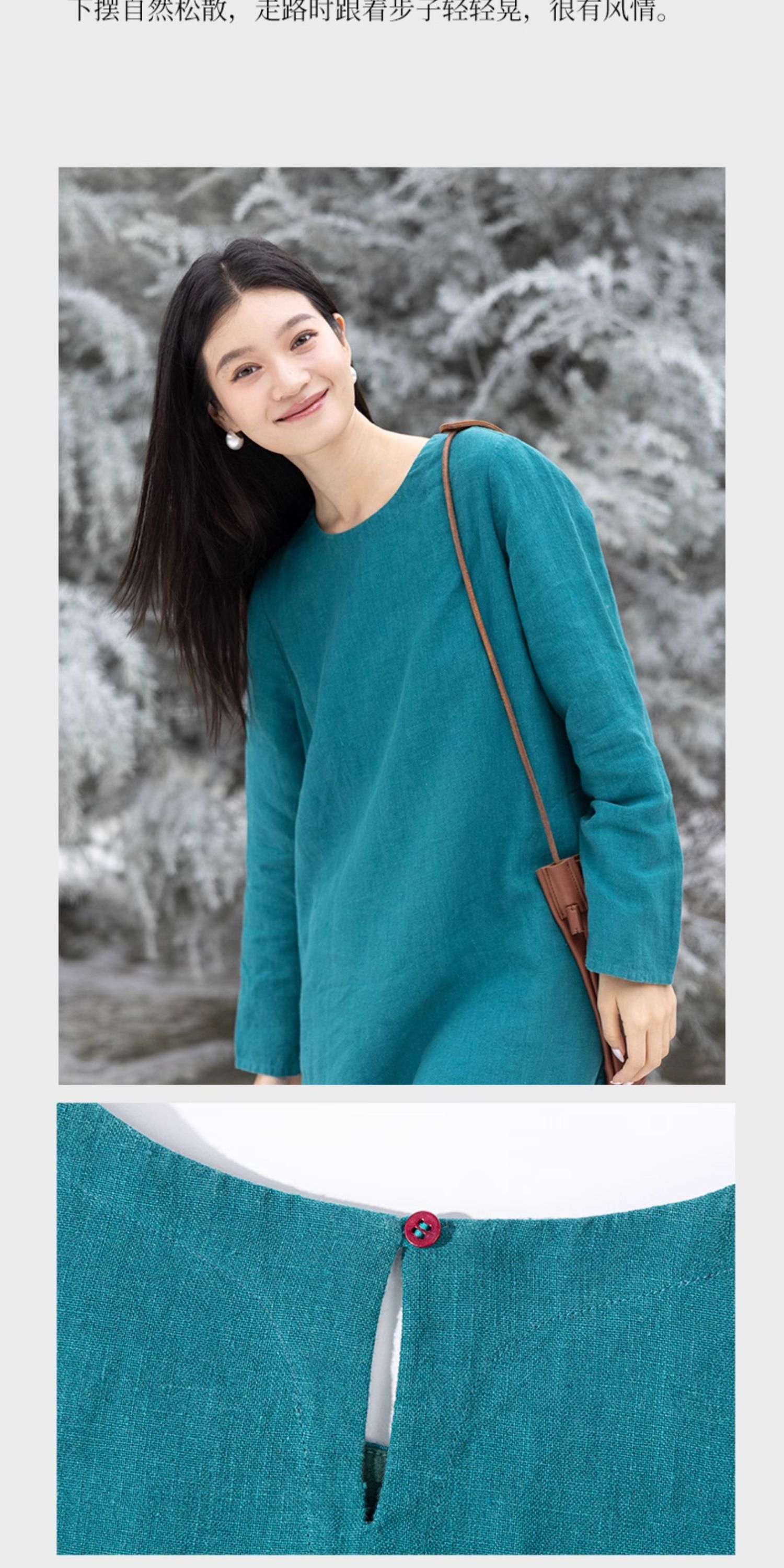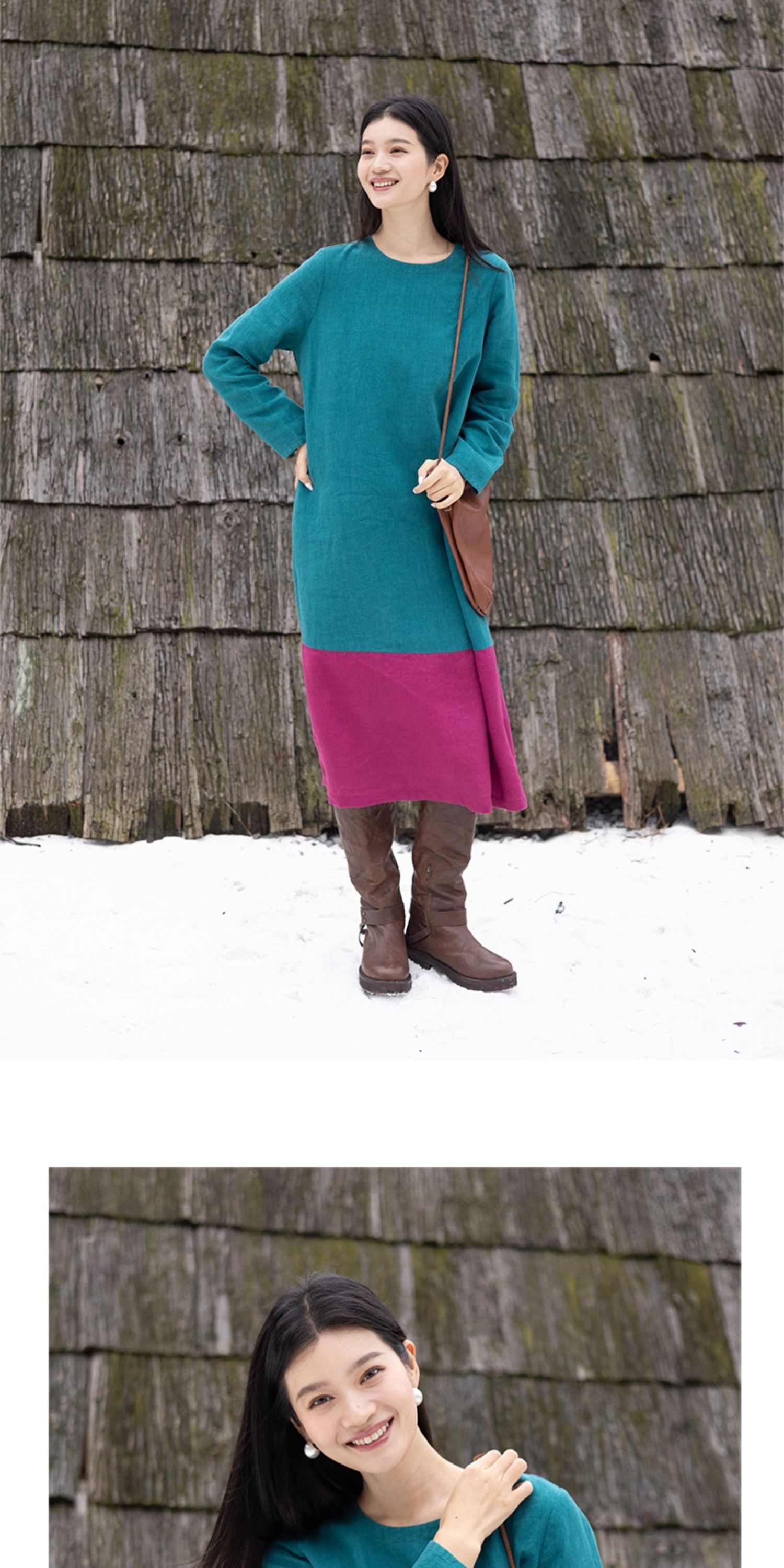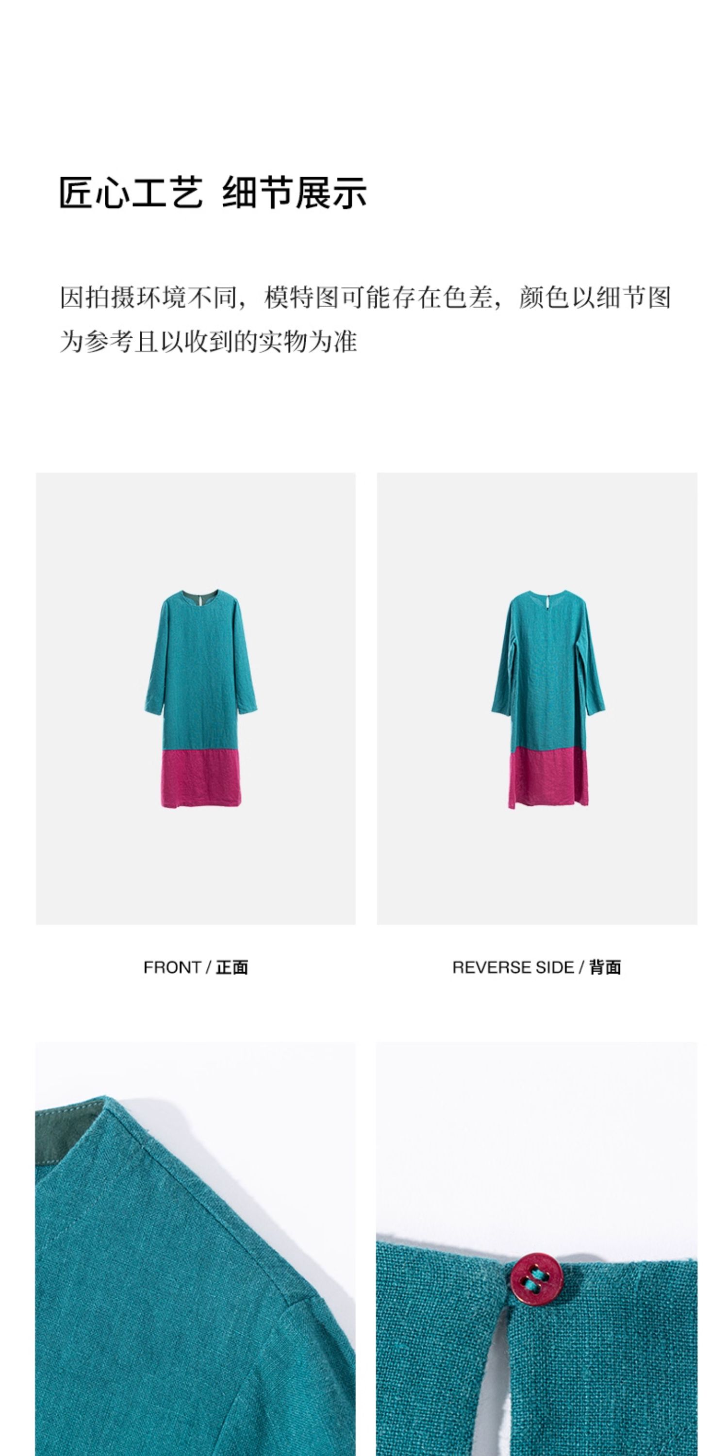 绽放751朵/撞色小蓝紫长裙·纯亚麻厚款显瘦撞色拼接长袖连衣裙女
