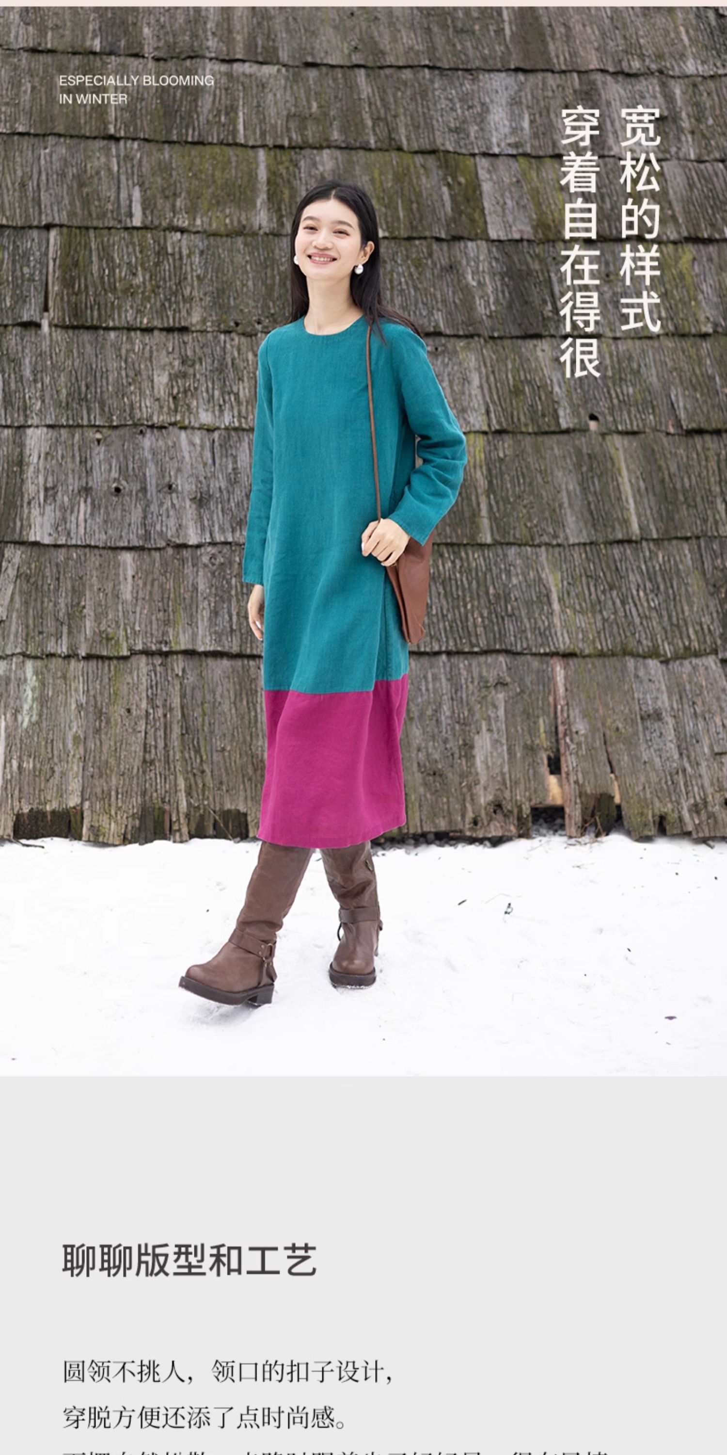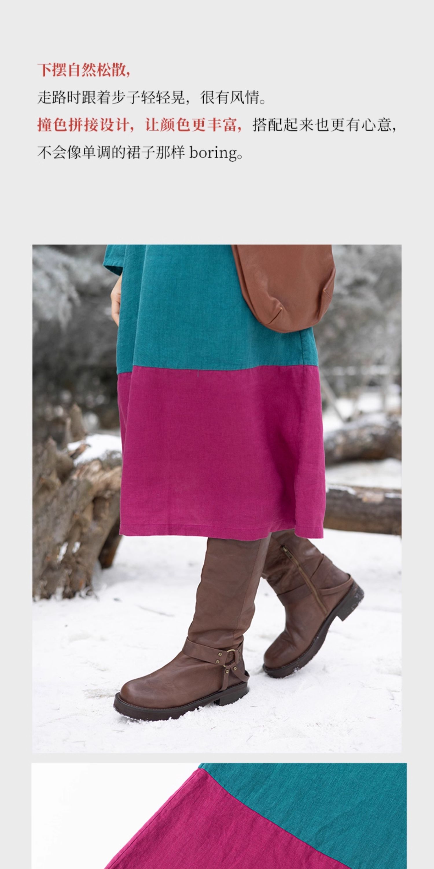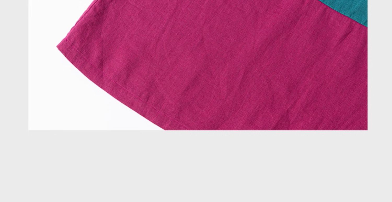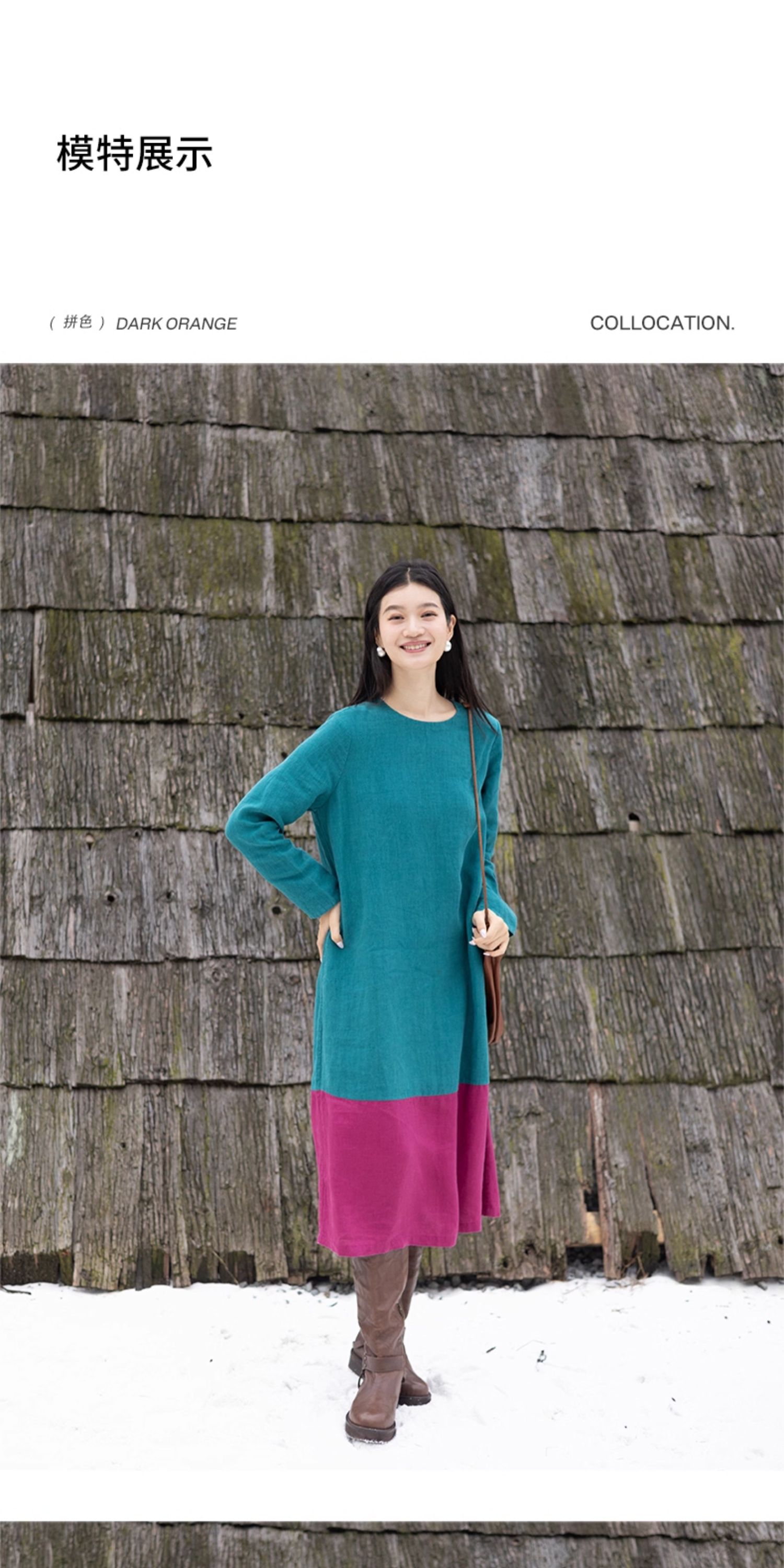 绽放751朵/撞色小蓝紫长裙·纯亚麻厚款显瘦撞色拼接长袖连衣裙女