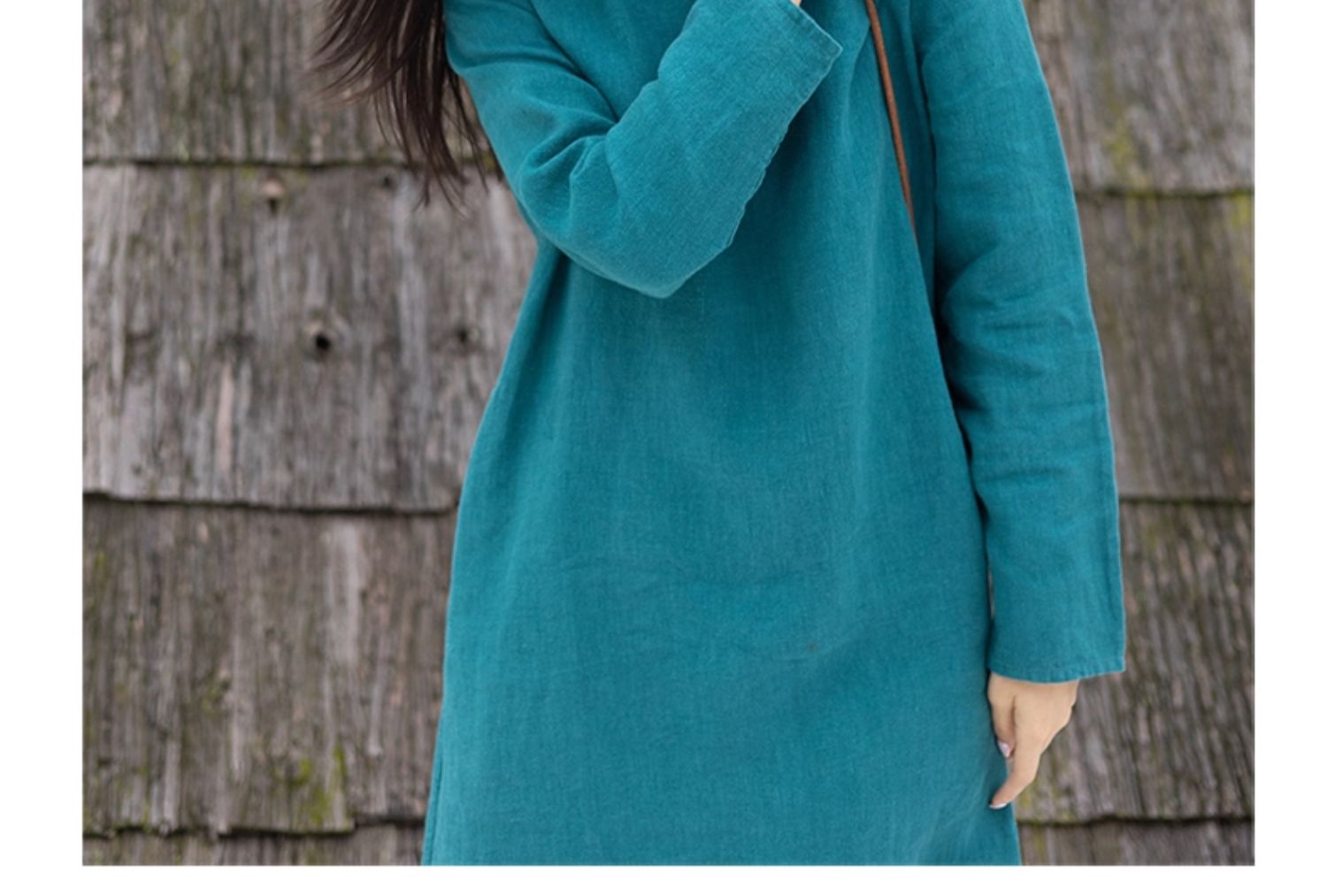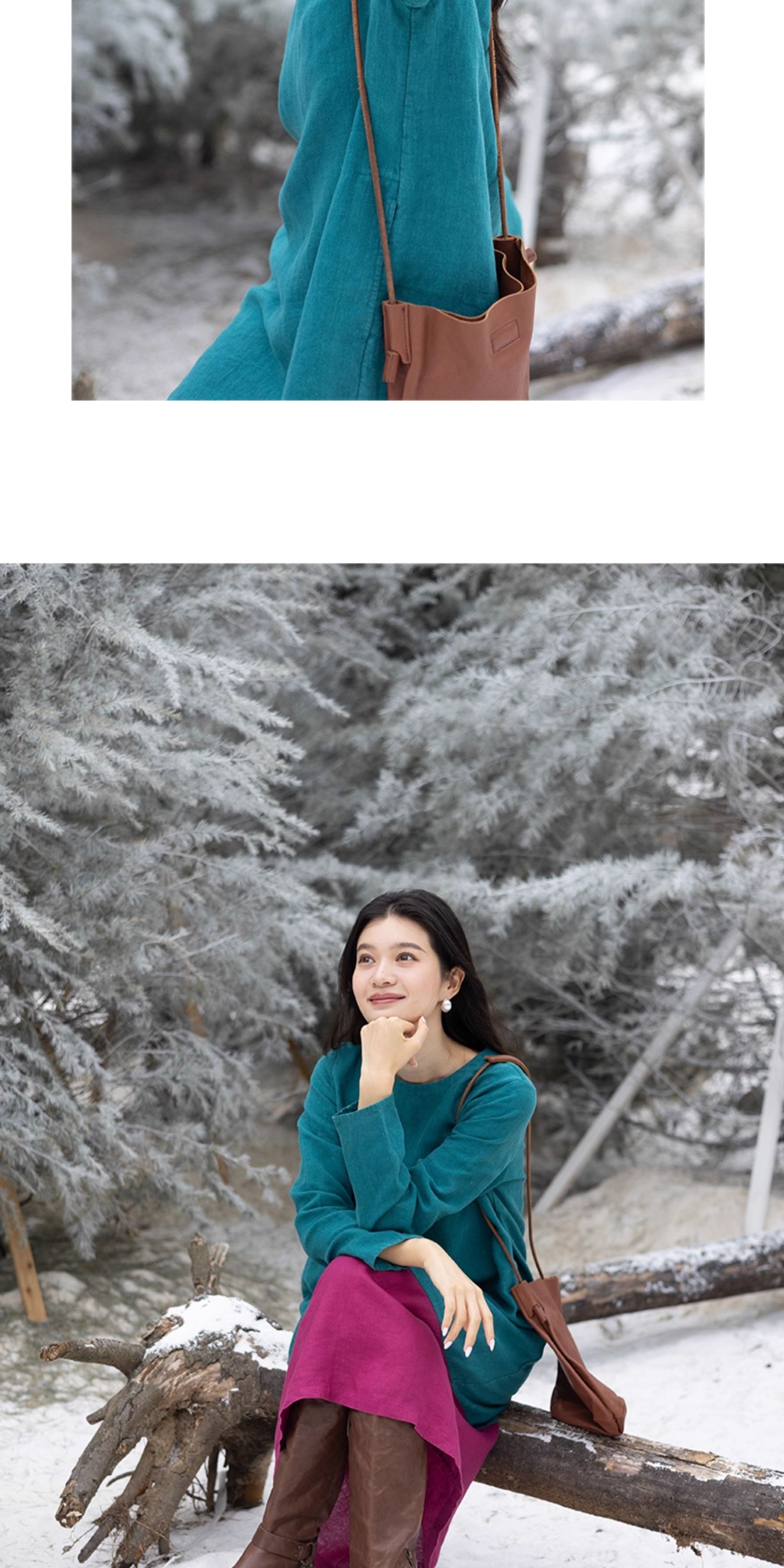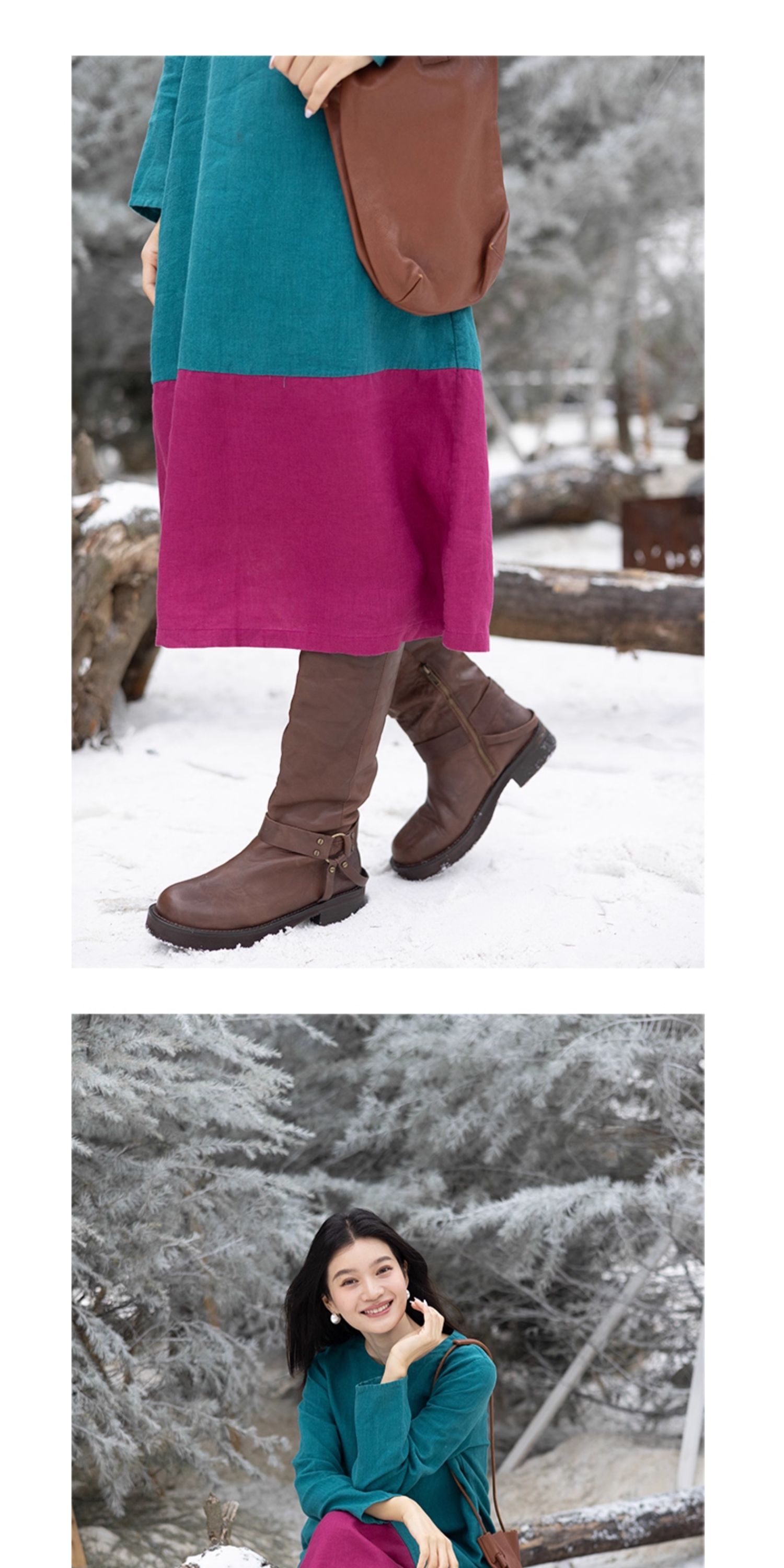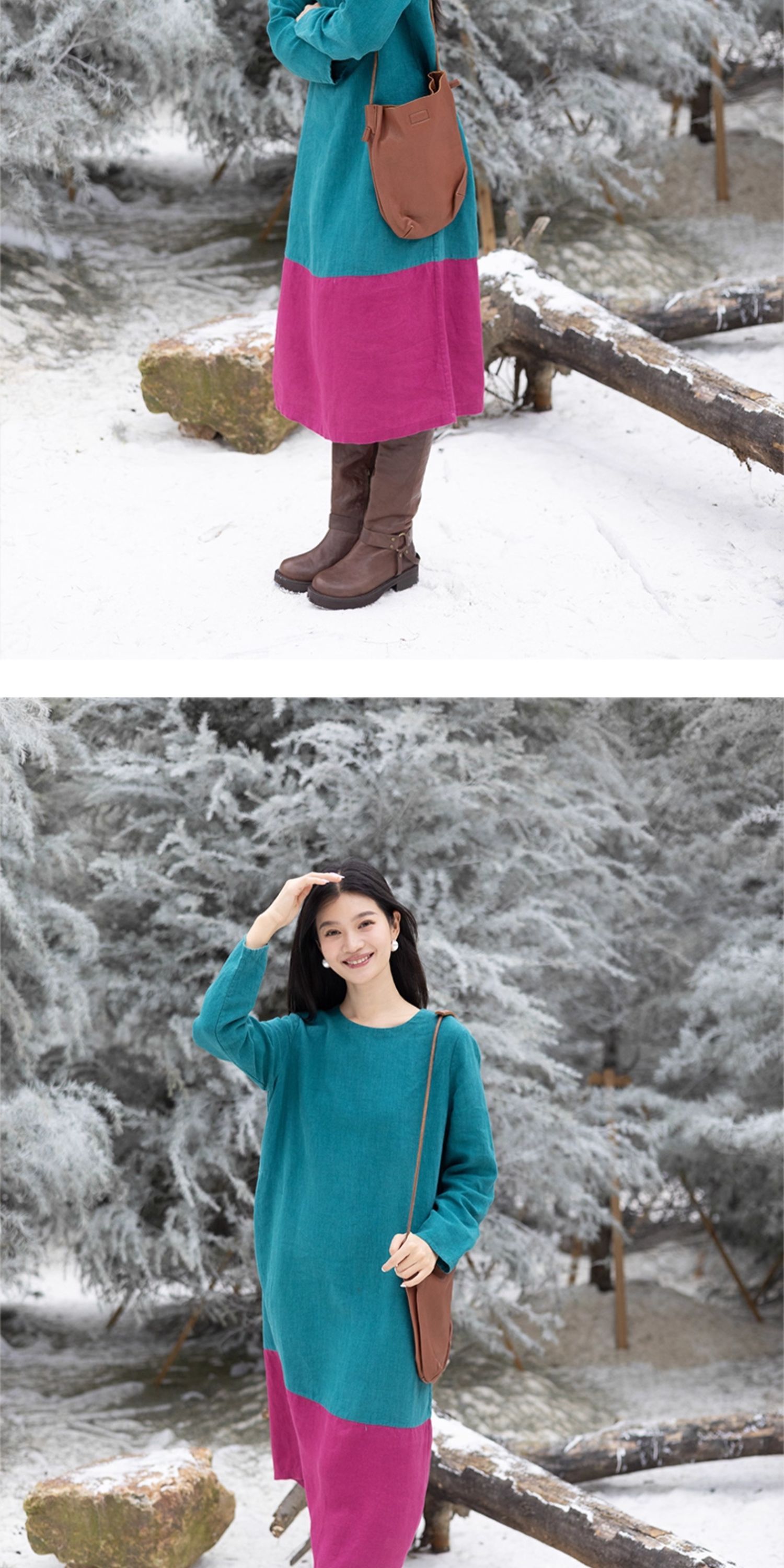 绽放751朵/撞色小蓝紫长裙·纯亚麻厚款显瘦撞色拼接长袖连衣裙女
