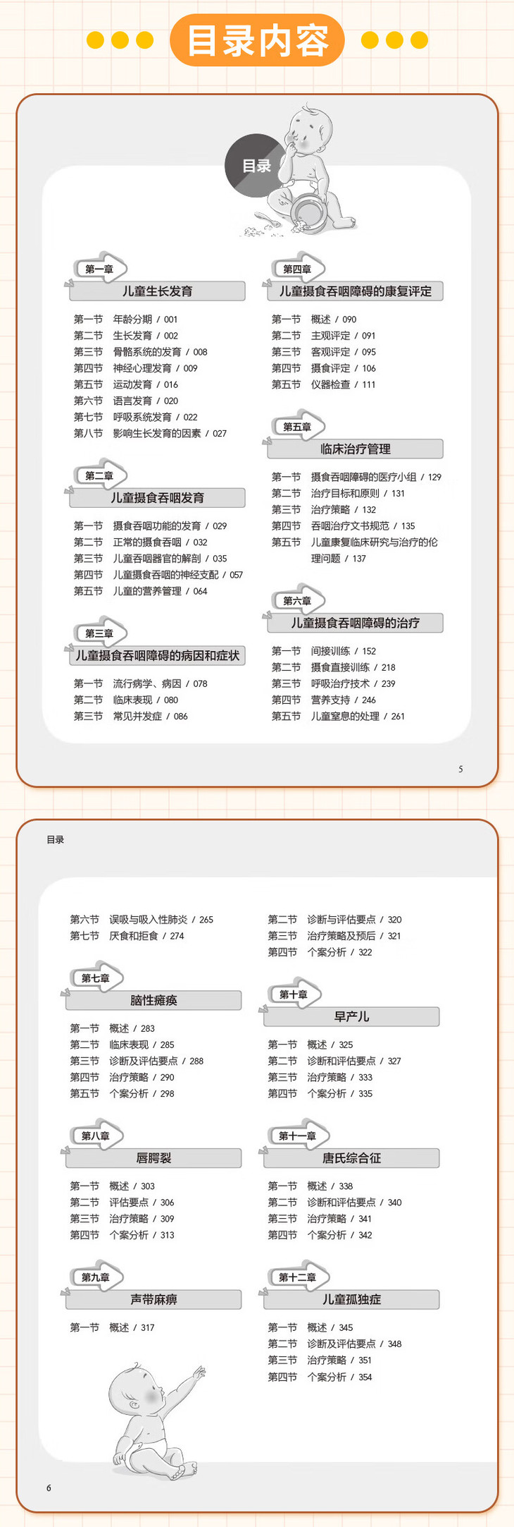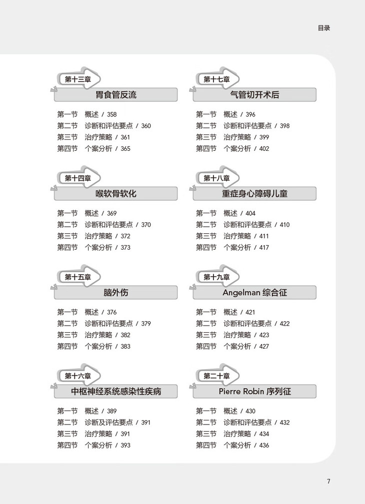 全书共包括解剖学、发育学、临床评估、仪器检查、手术处理、日常护理、各种儿童疾患所致吞咽障碍的治疗要点等内容,共十三个章节,涵盖康复科、小儿外科、儿科、影像科、耳鼻喉科、呼吸科、消化内科、营养科等多学科内容,全面系统地阐述了儿童吞咽障碍的基础理论和临床问题,也对近年来临床上出现的一些常见疑难、重症病例进行了详细介绍,对不同病种的吞咽障碍治疗具有良好的指导意义。 本书着重介绍吞咽障碍基础学、评估与治疗,力求简洁、扼要、重点突出,原则明确,具有较强的临床参考价值和可操作性。本书既可作为治疗师在日常诊疗患儿所用的参考工具书,也可作为从事儿童临床工作医护人员的临床参考书。 此外,本书不仅适合临床医护人员使用,也可让患儿家长了解到患儿疾病的发展、治疗及预后,也能学习到日常护理、居家训练等家庭指导内容,具有很高的指导性和实用性。
