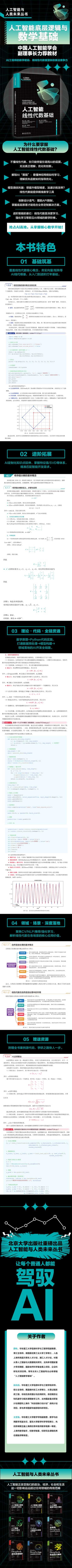 (1)系统性与实用性兼备:本书以人工智能为背景,系统梳理了线性代数等核心数学知识,兼顾理论推导与实际应用,帮助读者打通从数学原理到人工智能算法实现的全链路。