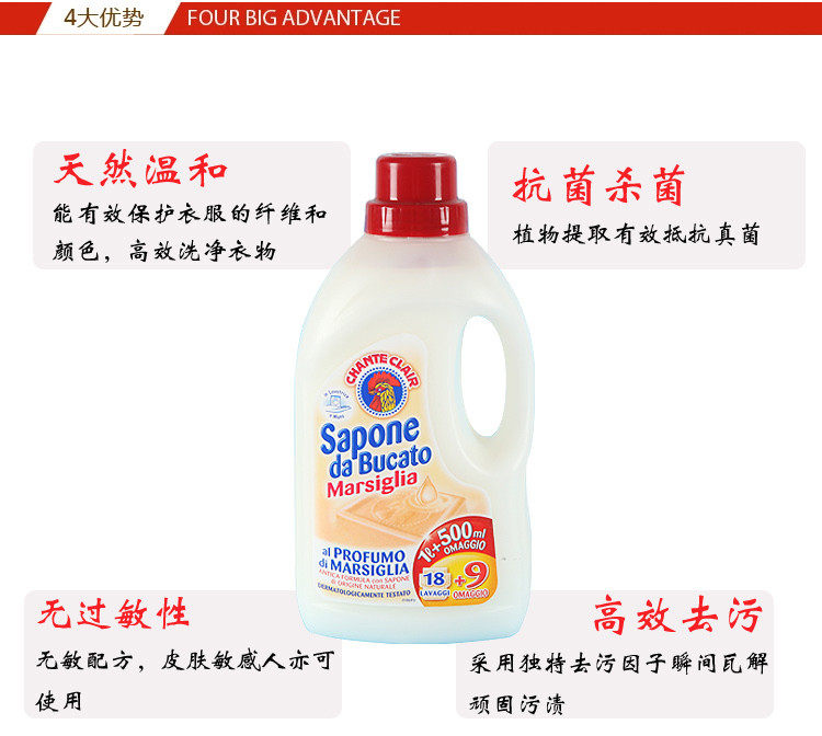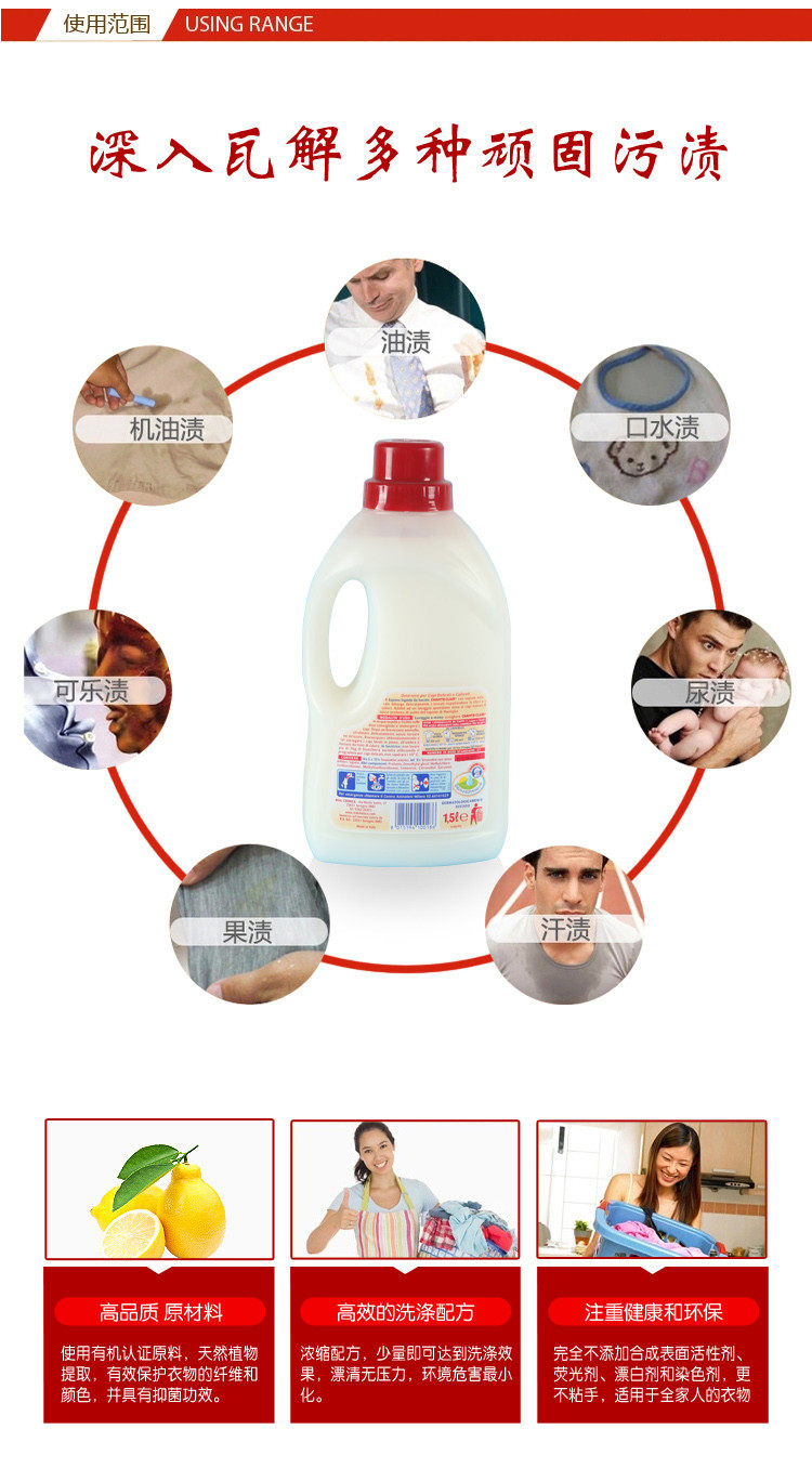 产品功效:1.完美保存了马赛皂优点,使用有机认证原料,有效保护衣物的纤维和颜色,并具有 抑菌功效。2.完全不添加合成表面活性剂,荧光剂,漂白剂和染色剂。3.浓缩配方,少量即可达到洗涤效果,漂清无压力。