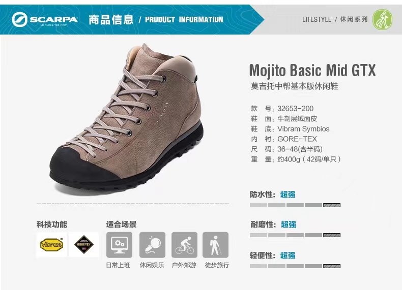 SCARPA/斯卡帕Mojito莫吉托基础防水透气户外休闲鞋男款32653-200