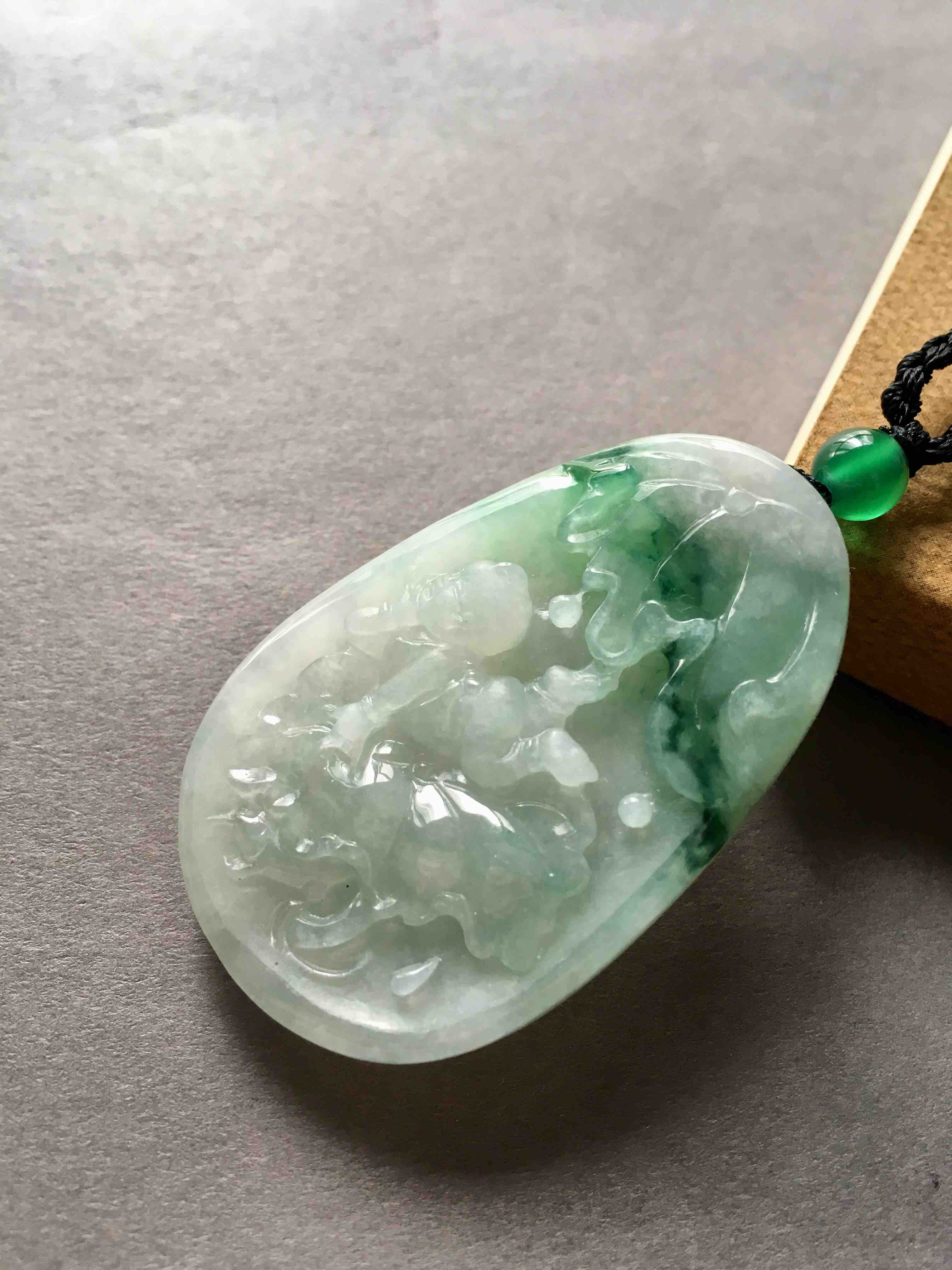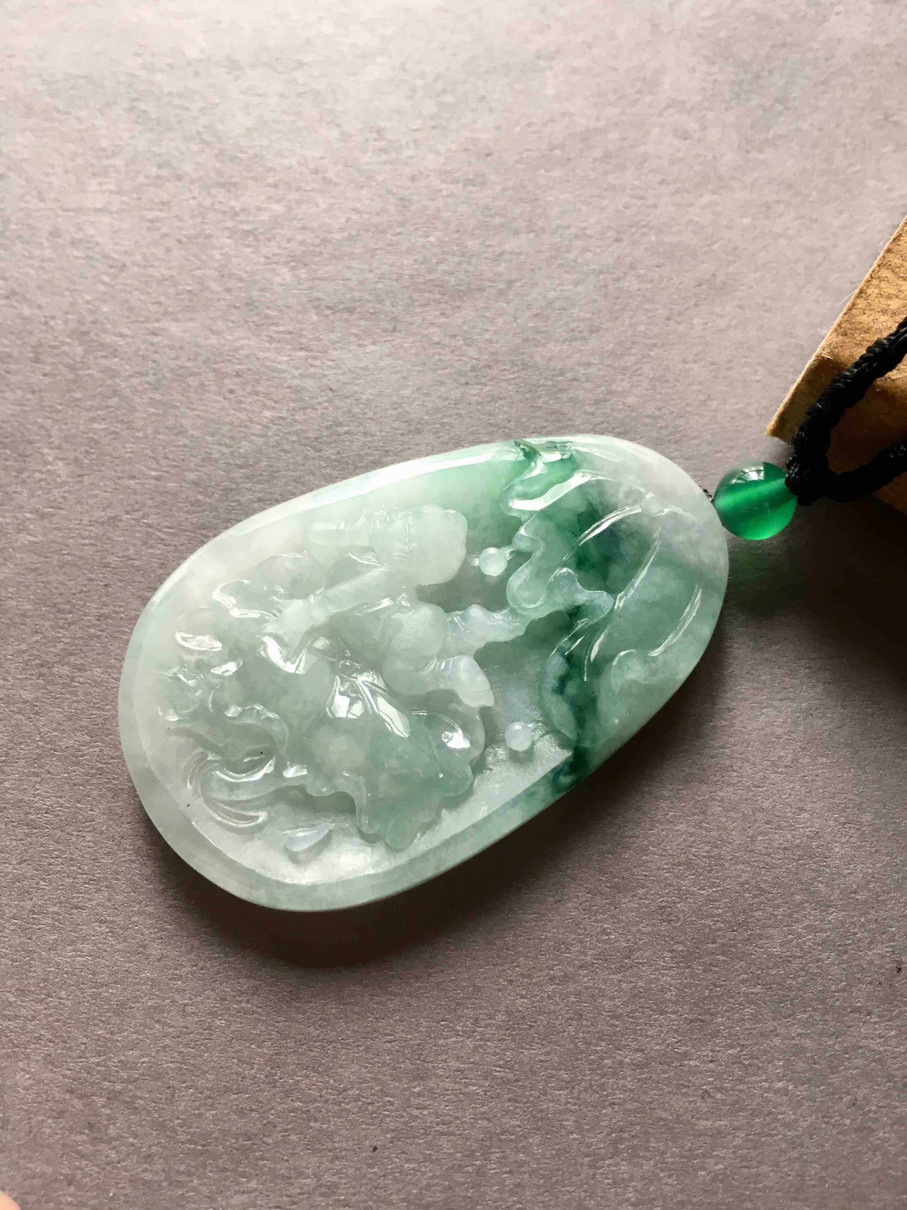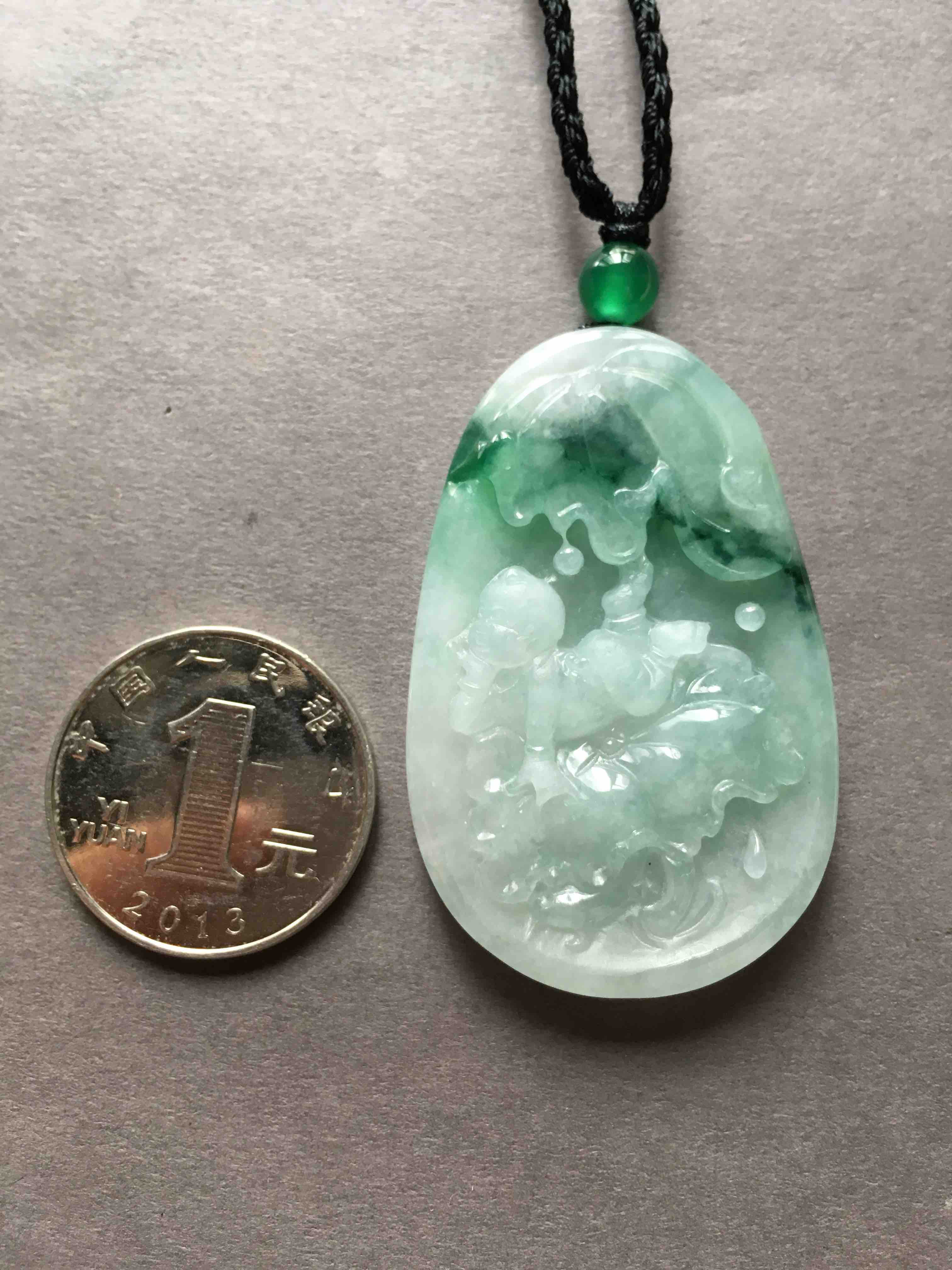 大牌子,糯种飘绿花翡翠早生贵子,连年有余,49.7×31.7×7mm,尺寸特别大气,雕工精美,可爱的胖娃娃趴在荷叶上。磨砂与抛光工艺的综合运用,让宝贝的层次感更强了,价格实惠,送礼很不错