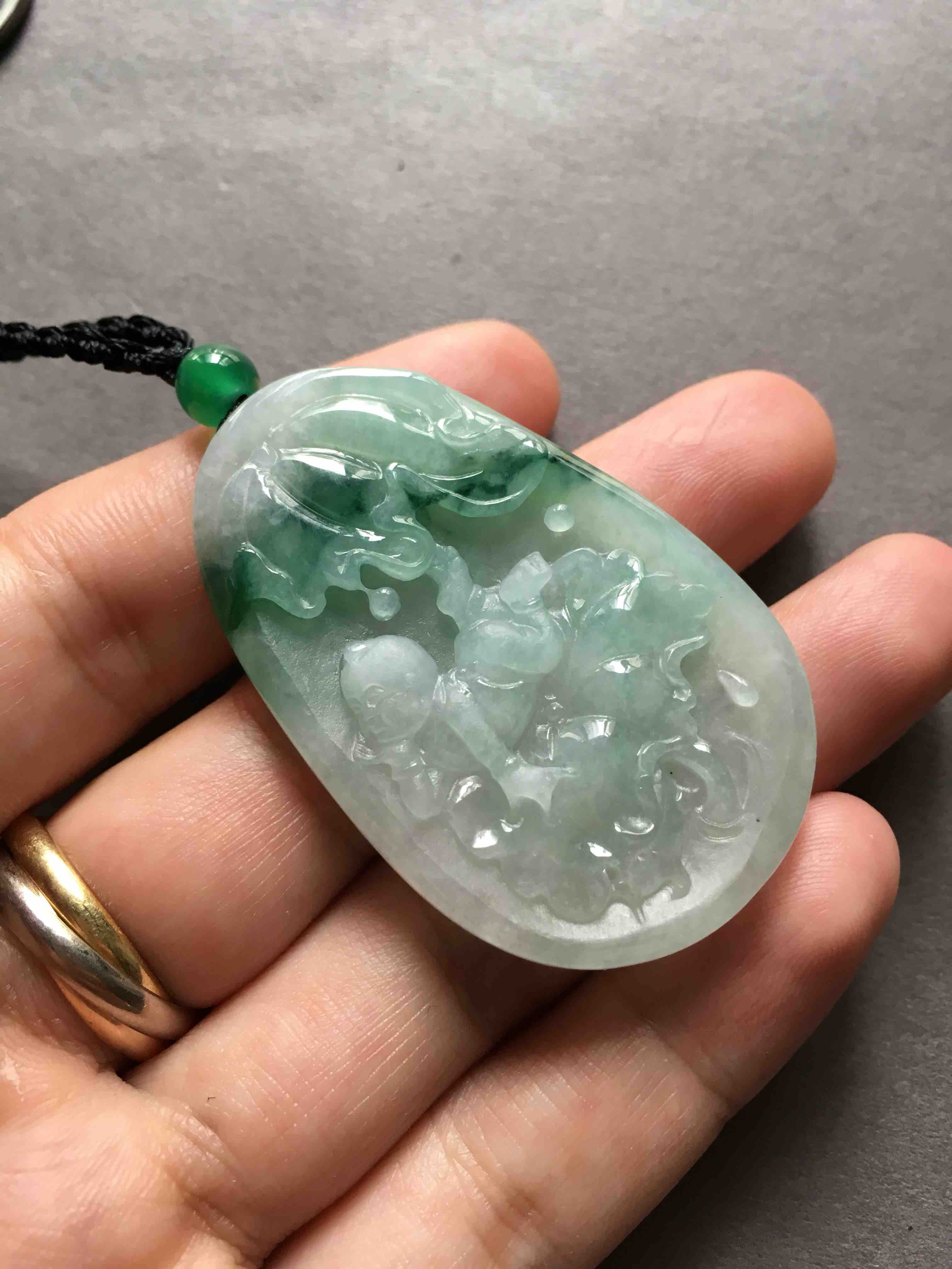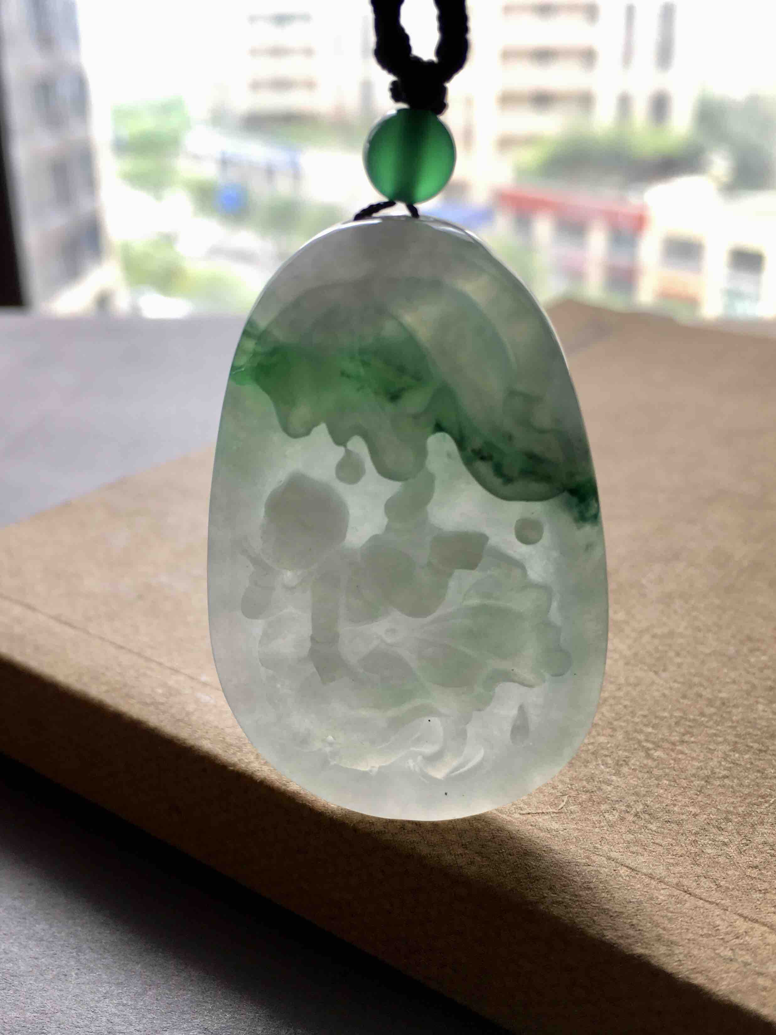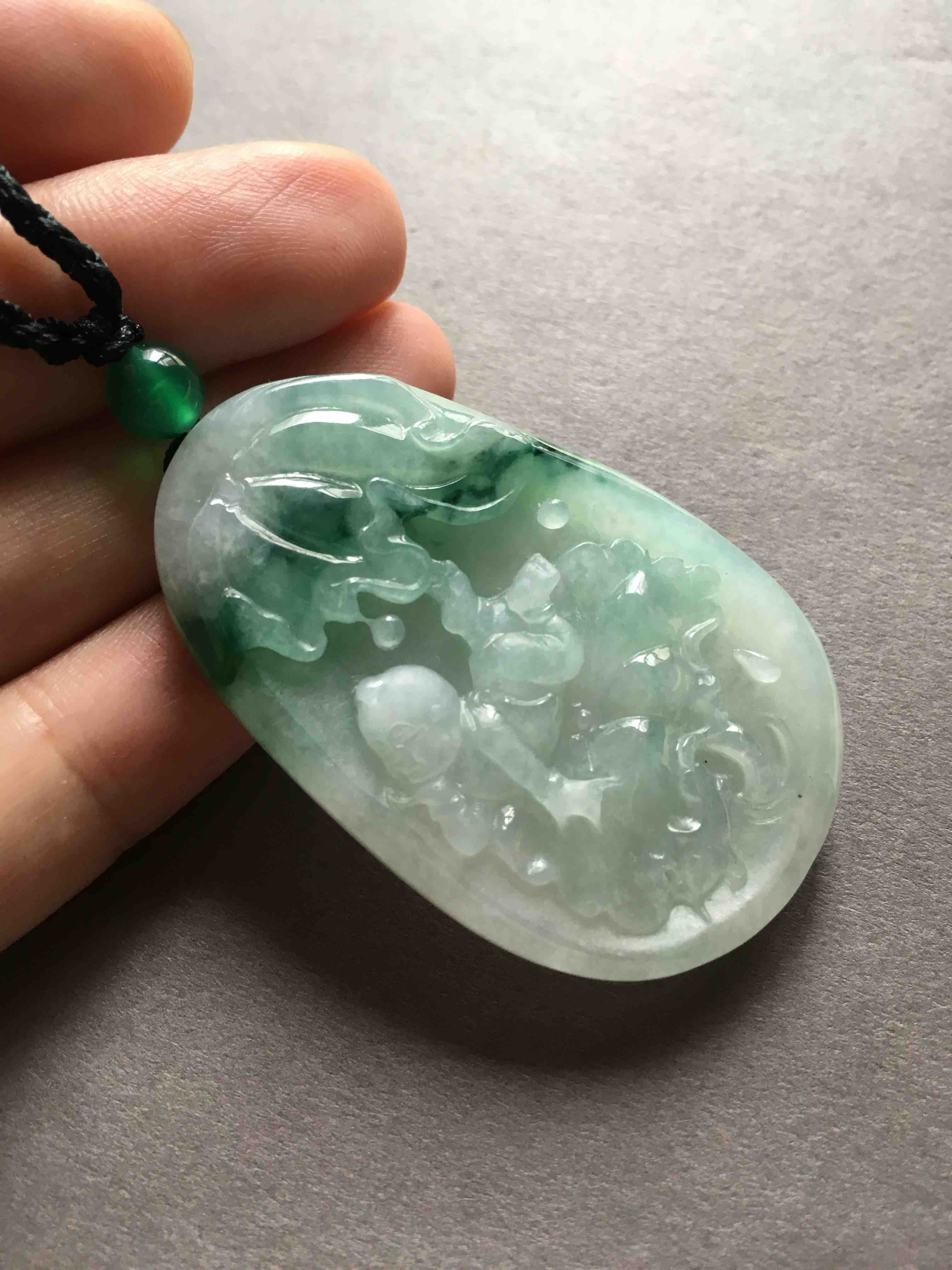 大牌子,糯种飘绿花翡翠早生贵子,连年有余,49.7×31.7×7mm,尺寸特别大气,雕工精美,可爱的胖娃娃趴在荷叶上。磨砂与抛光工艺的综合运用,让宝贝的层次感更强了,价格实惠,送礼很不错