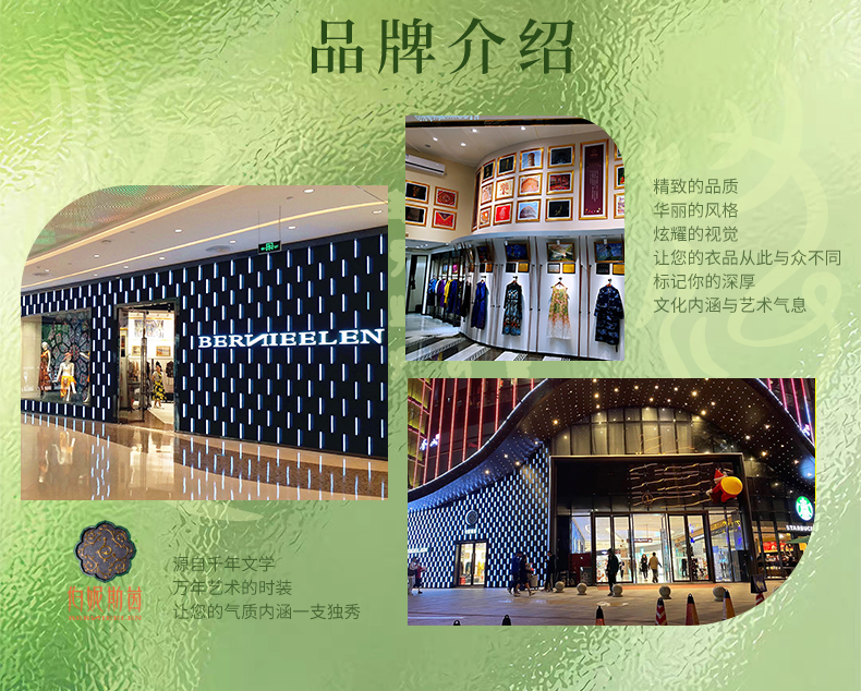 行业首家从事文创研发的女装品牌-伯妮斯茵 品牌风格:源自千年文学和万年艺术的时装,让你的气质内涵一枝独秀,精彩的品质,华丽的风格,炫耀的视觉,让你的衣品从此与众不同,标记你深厚的文化内涵与艺术气息。