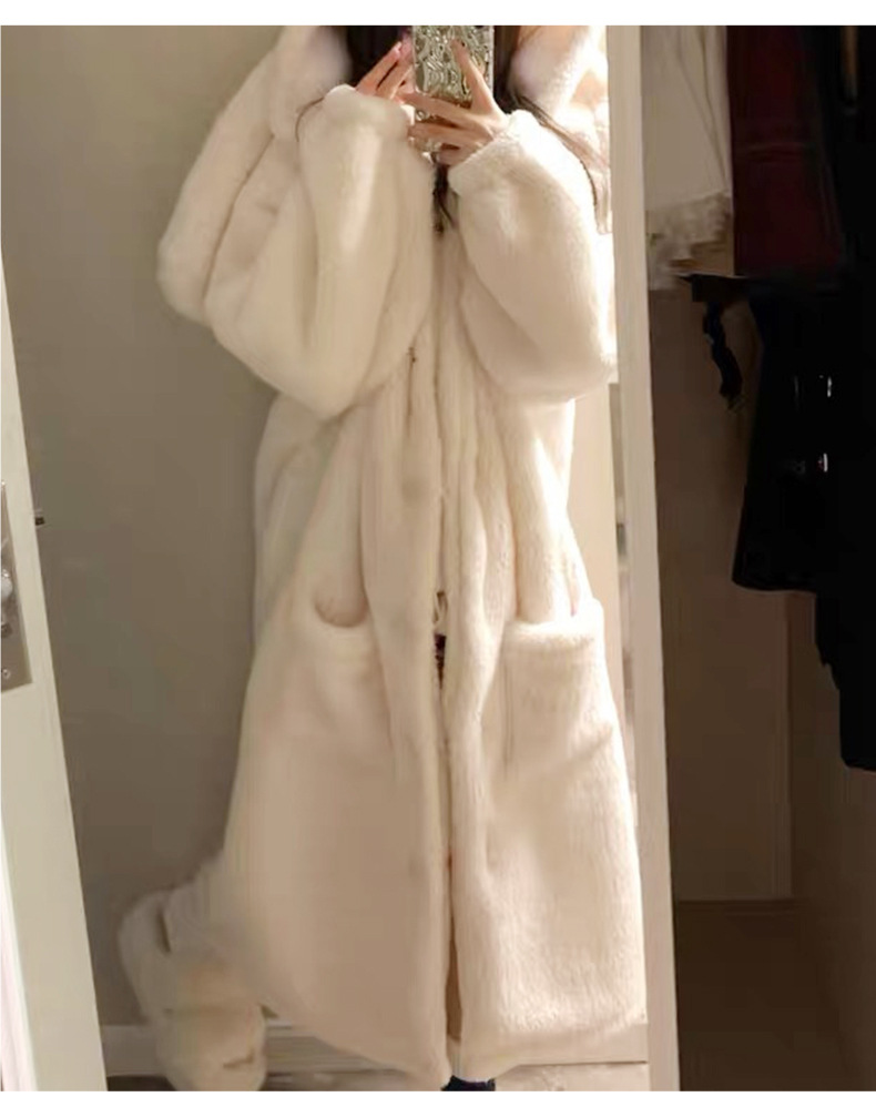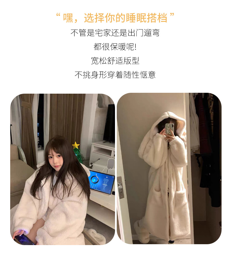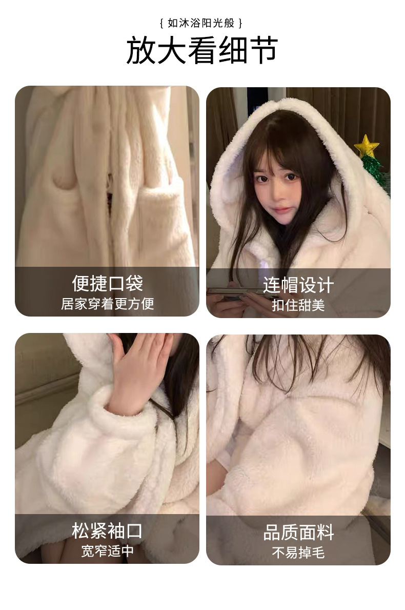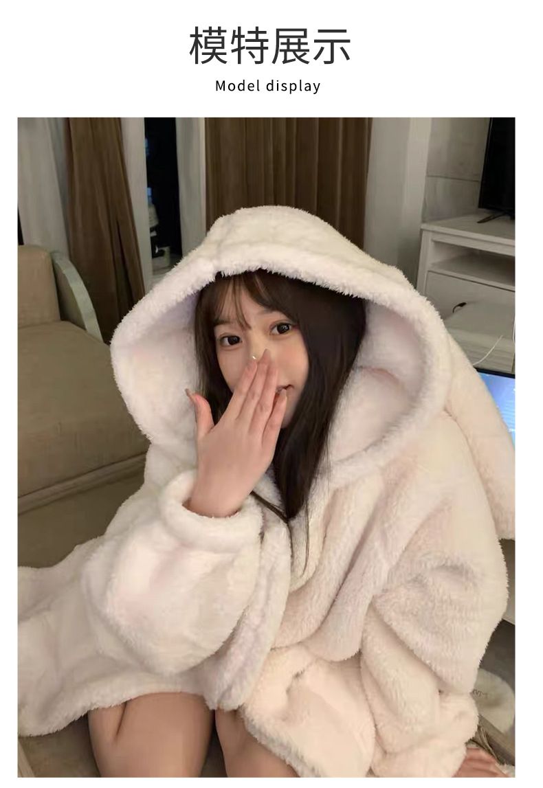 【加厚不掉毛,珊瑚绒兔耳朵连帽睡衣】每一次的伸展都与舒适相拥,柔软舒适 不易掉毛 加绒加厚,冬季新款加厚保暖睡裙居家服睡袍QQ