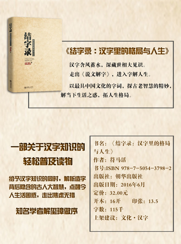 《结字录:汉字里的格局与人生》作者符马活是位诗人,这些年对汉字的潜心琢磨,思维方式有了惊人的飞跃。符马活选取39组从古代使用至今的语词,以求学、居家、市井等七个分类角度,诙谐述说其起源和演变,以词语为单元,在解字的同时,最终抵达词义的实用效果。《结字录:汉字里的格局与人生》让读者感受中国古老文化的精妙,通过解读文字,进而发现文字最初的含义所包含的寓意和哲思,感受对中国文化的温情与敬意。更重要的是符马活在文字中,为我们当下的生活提供虽然古老但彰显智慧力的思维方式,解答困惑与疑思。