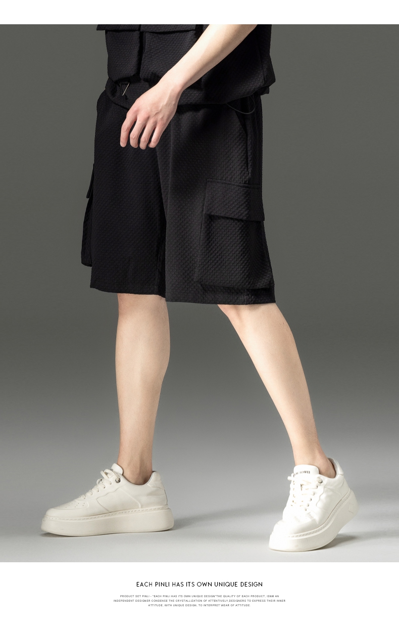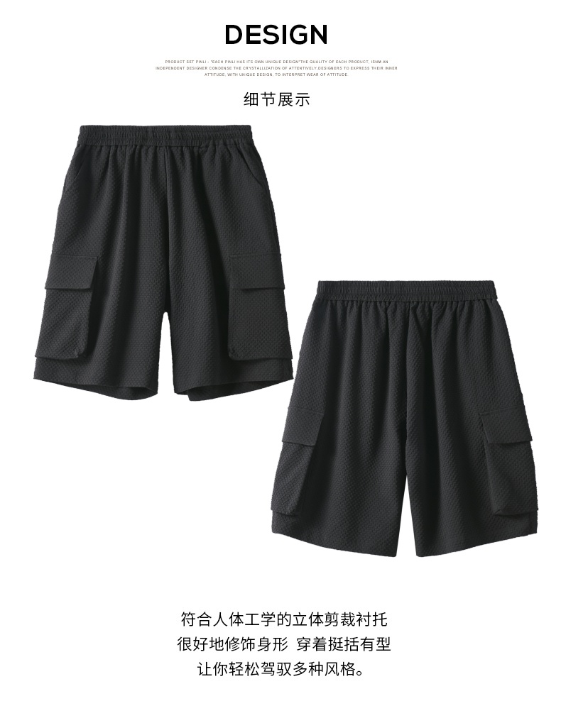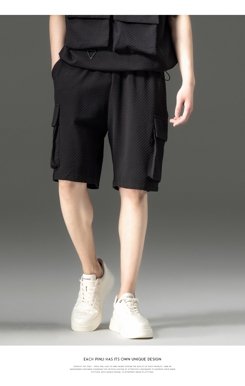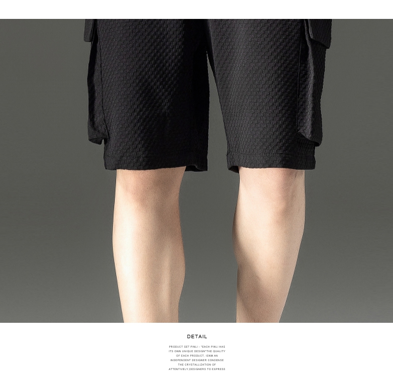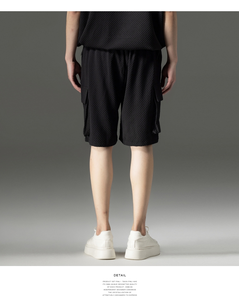 PINLI品立裁魂夏季新款男直筒华夫格工装短裤黑色休闲五分裤BC242117032