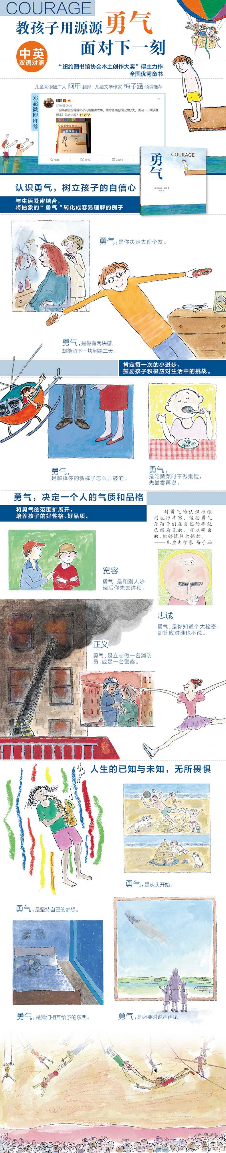 同时,这本书还将勇气的范围扩展开,比如;勇气,是跟人吵架先去讲和,是知道一个大秘密但对谁也不说,是立志做一名警察;勇气,是坚持梦想,是必要时说再见,是从头开始。有助于培养孩子宽容、忠诚、正义等品格,教孩子用源源不断的勇气面对人生已知和未知的下一刻!
