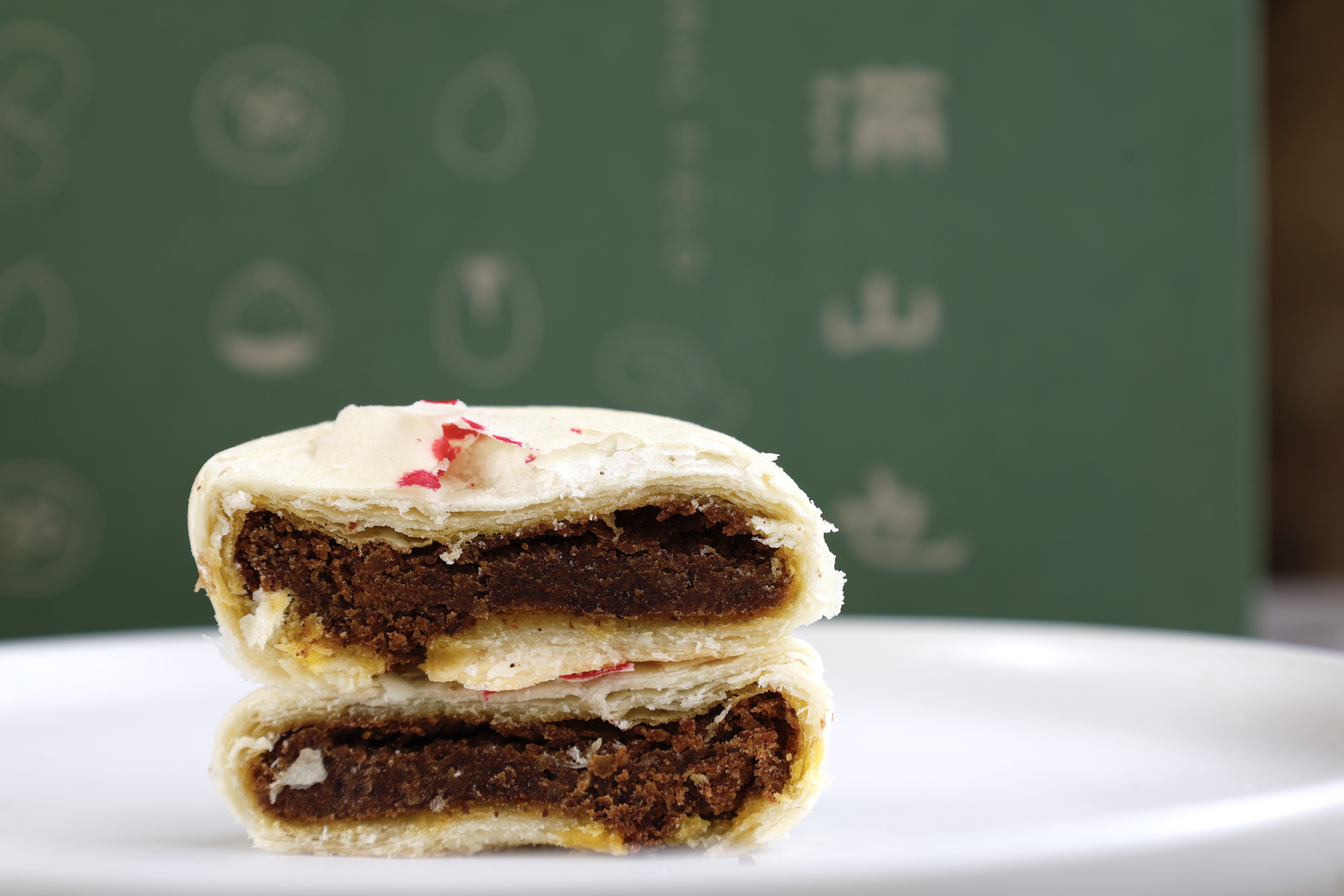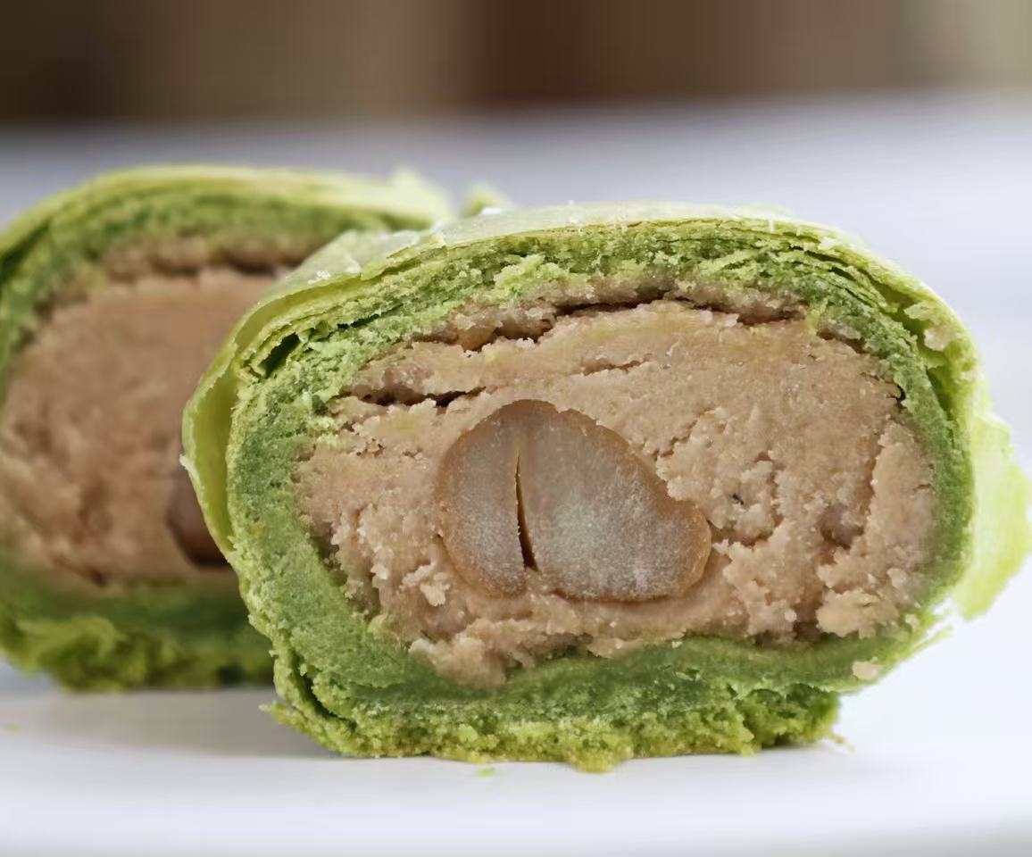 最外一层层薄如纸,是5A级抹茶粉调出的酥皮;第二层是奶香栗仁泥;