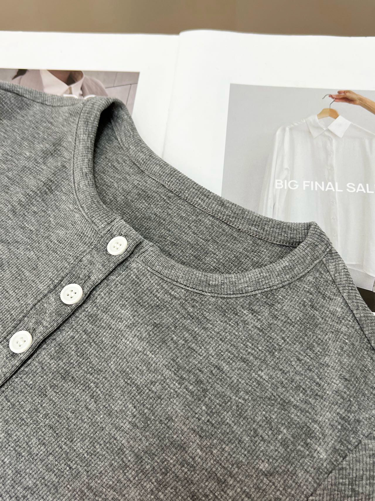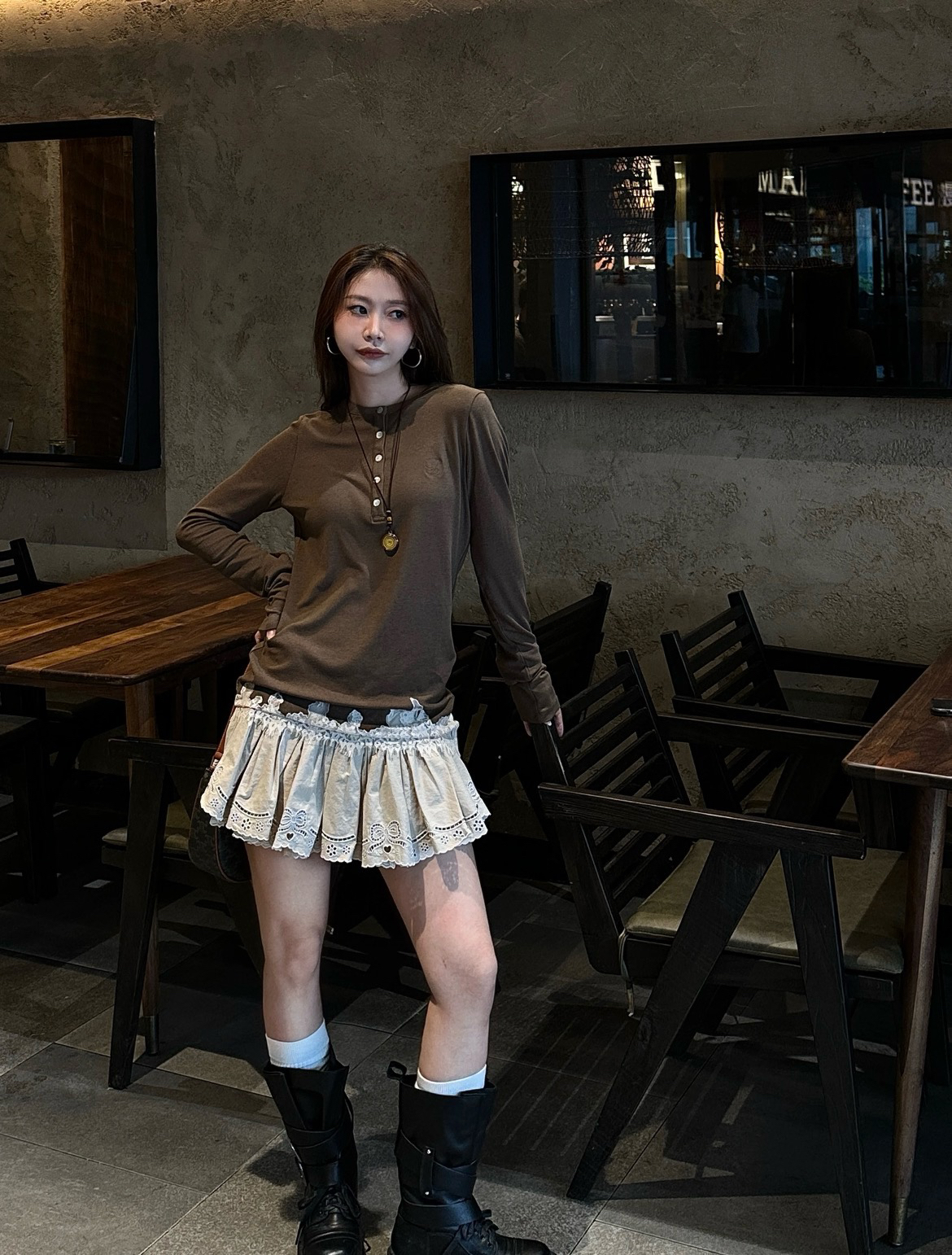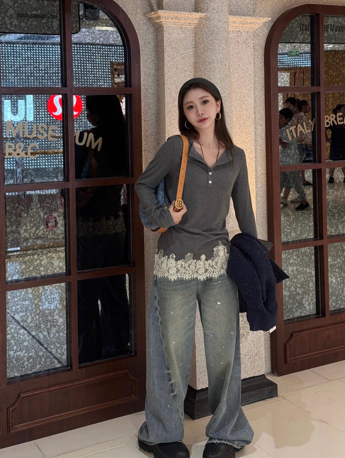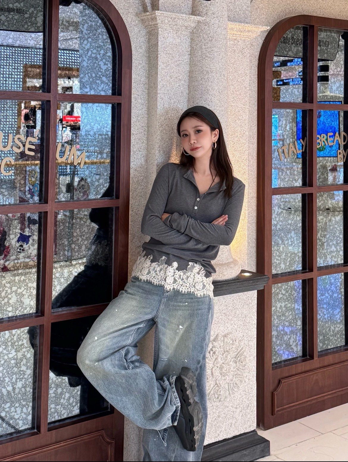 丫丫家 25年 秋季新款 法式复古精致刺绣字母修身打底衫 蕾丝拼接亨利领 长袖衫