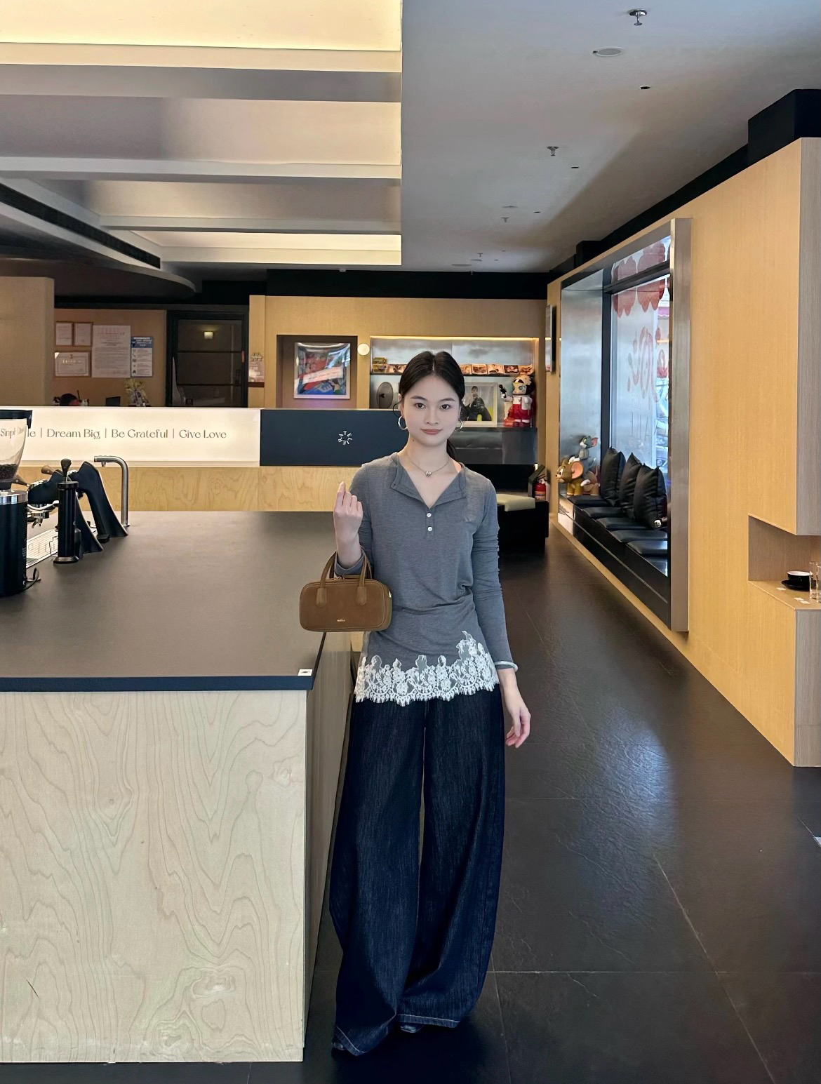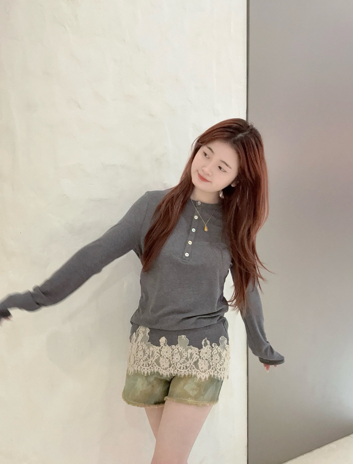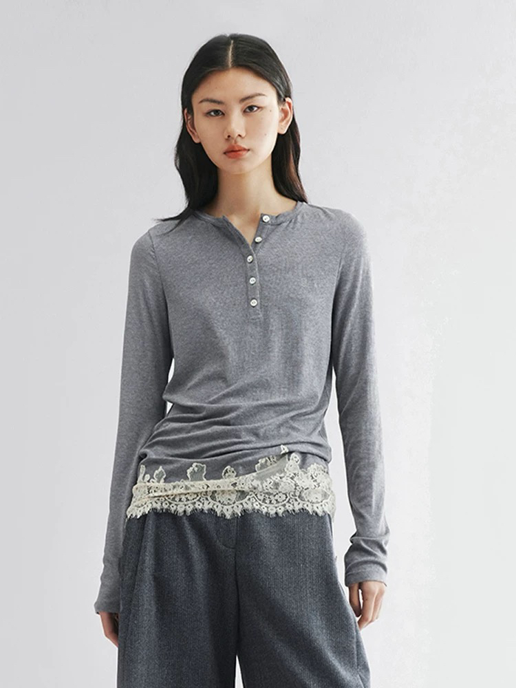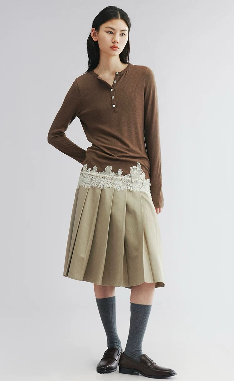 蕾丝拼接下摆:法式蕾丝与针织的浪漫碰撞,亨利领小V领,修饰脖颈线条,比普通圆领更显脸小哈
